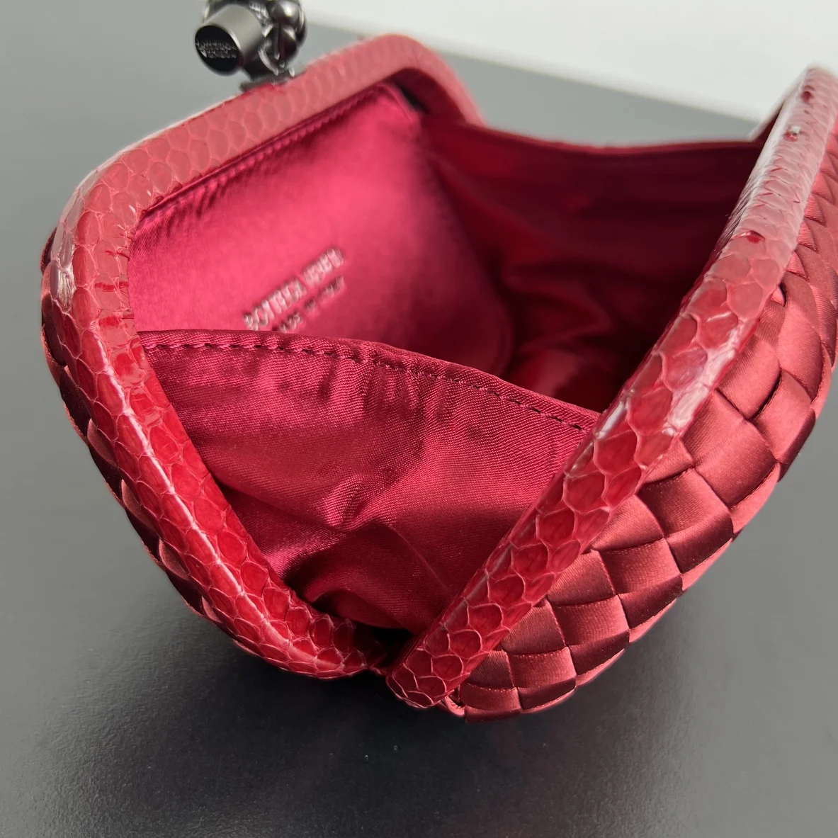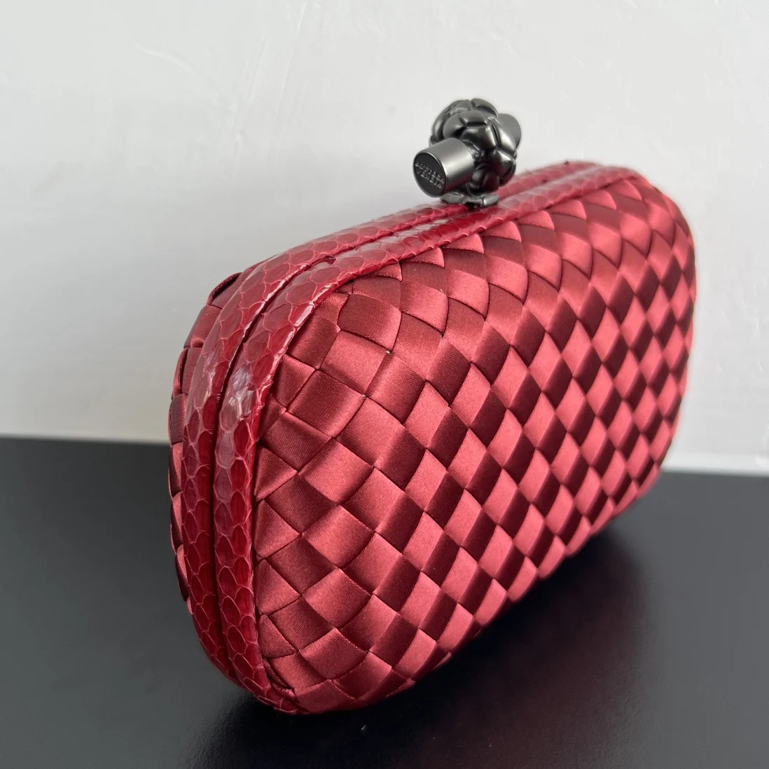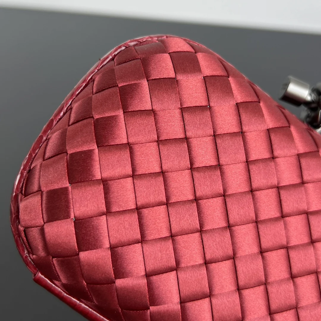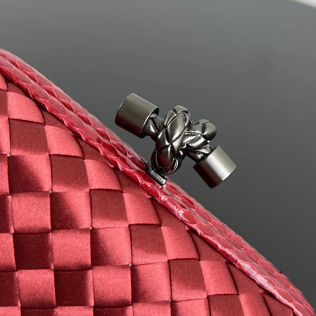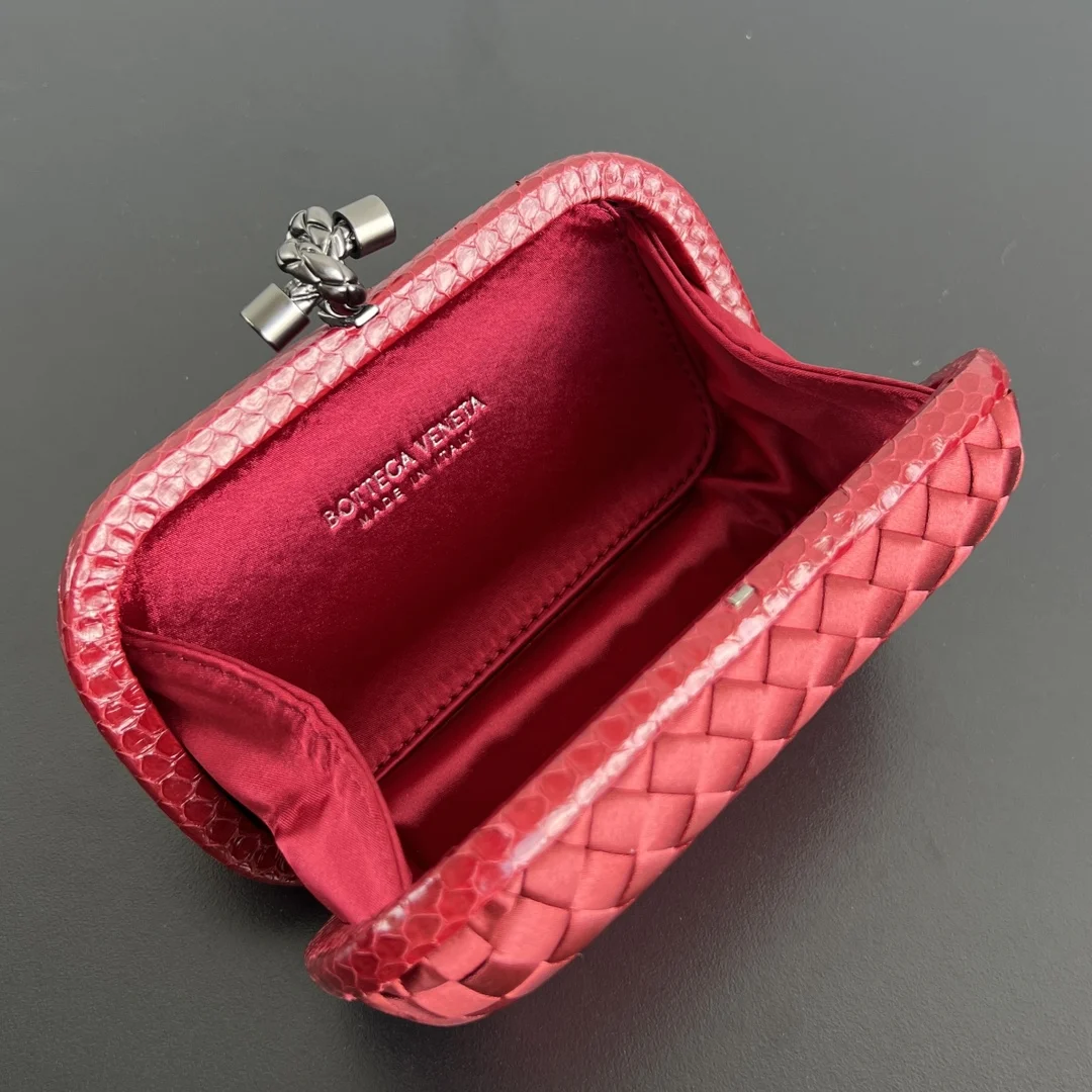BV Knot woven clutch series (8651 16cm) Each bag exudes exquisite elegance with iconic classic silk weaving snakeskin trim, paired with a knot clasp. The texture is soft and de..