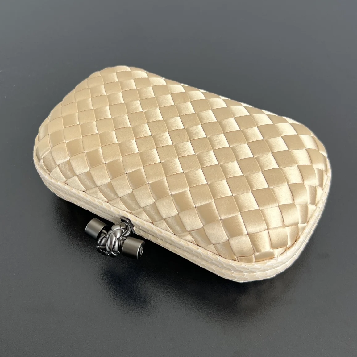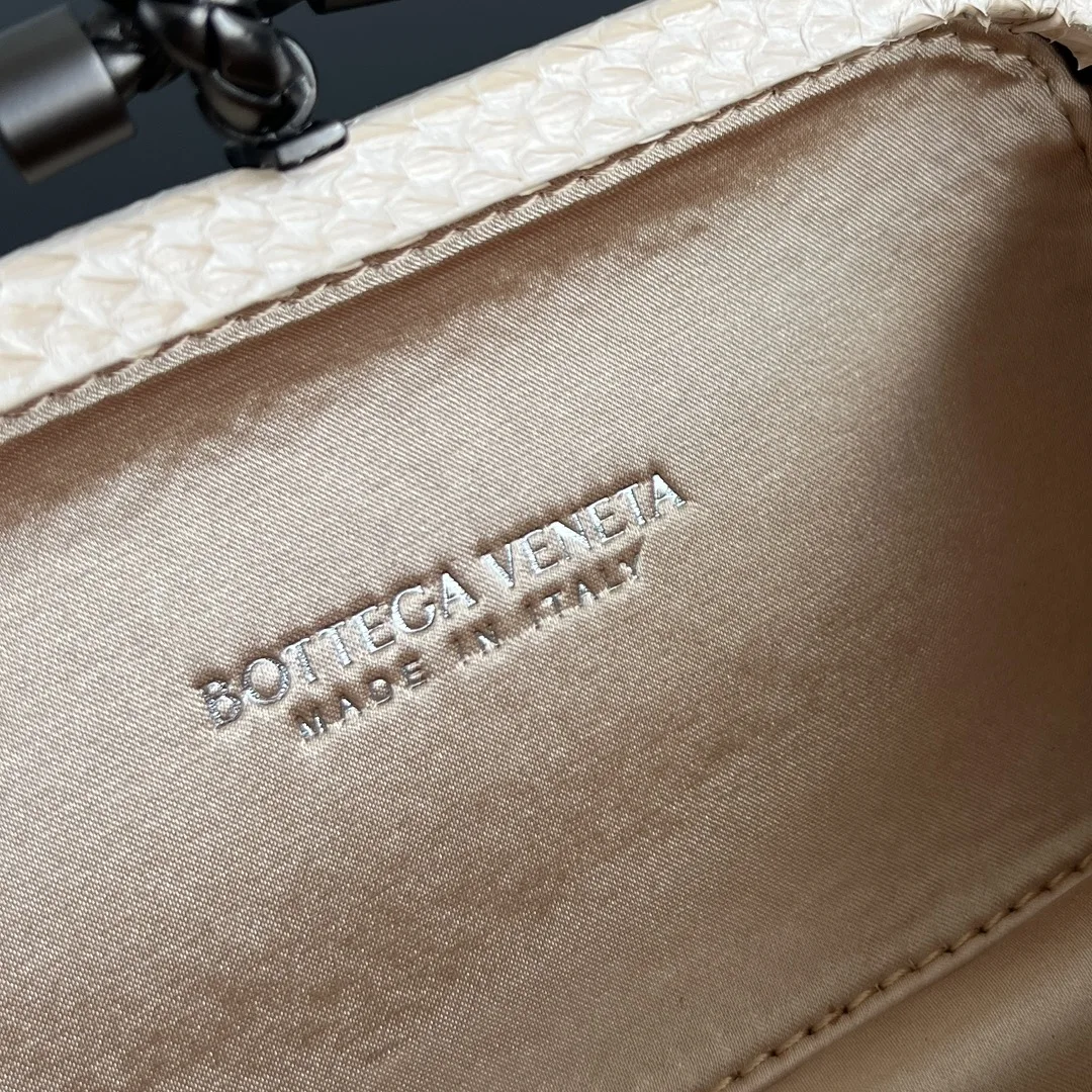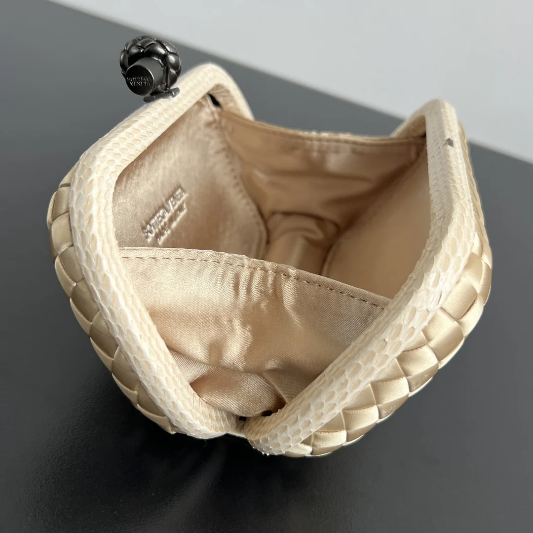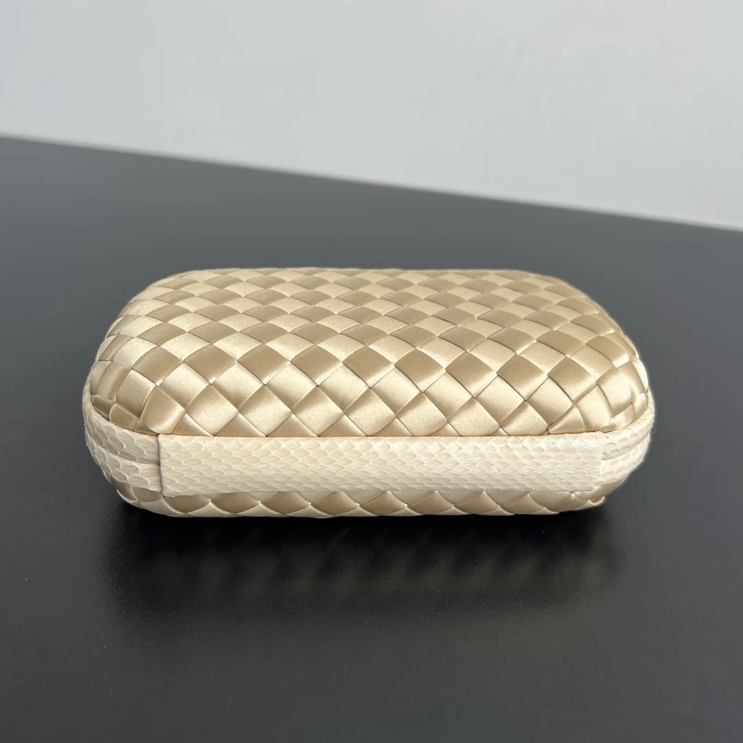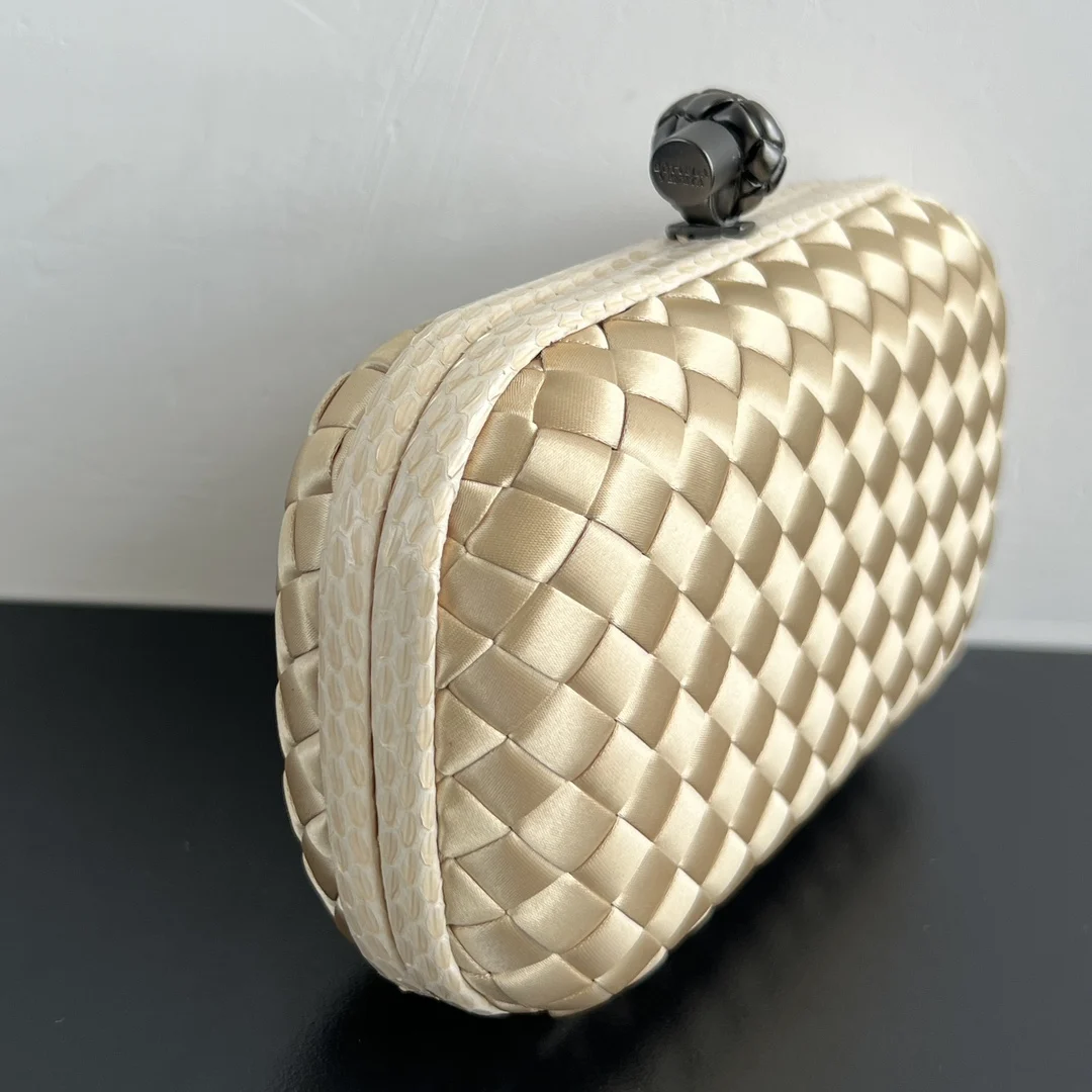BV Knot woven clutch series (8651 16cm) Each bag exudes exquisite elegance Signature classic silk weave snakeskin trim with knot clasp, soft and delicate to the touch. The design is small and refined, with understated no-logo branding, simple and elegant. Perfect with evening gowns or cheongsams, creating an atmosphere of a wealthy heiress, full of aura and invincible texture. Dimensions: 16x10x5