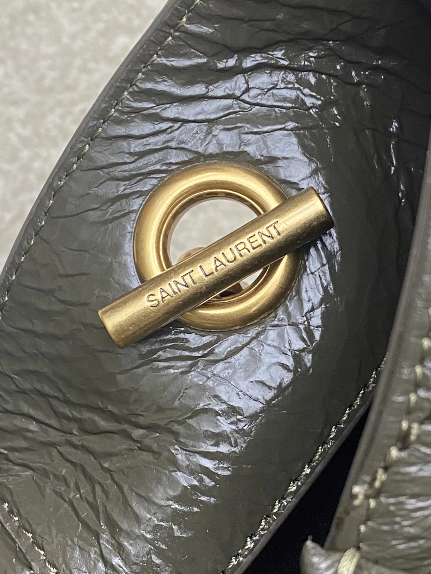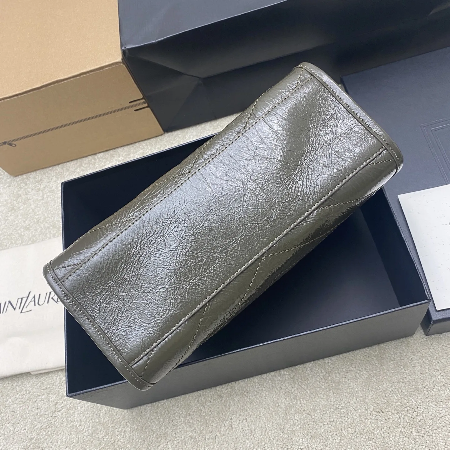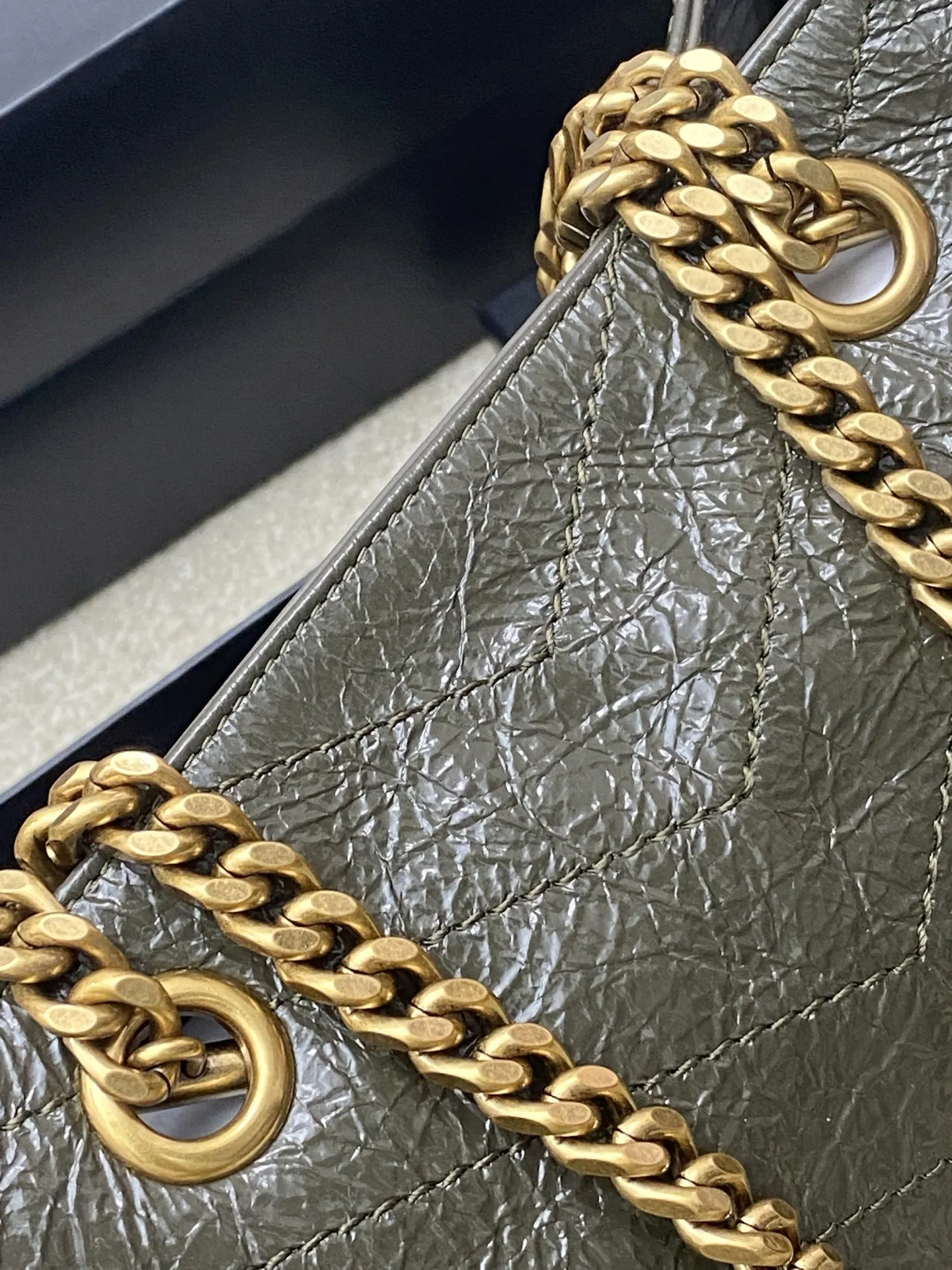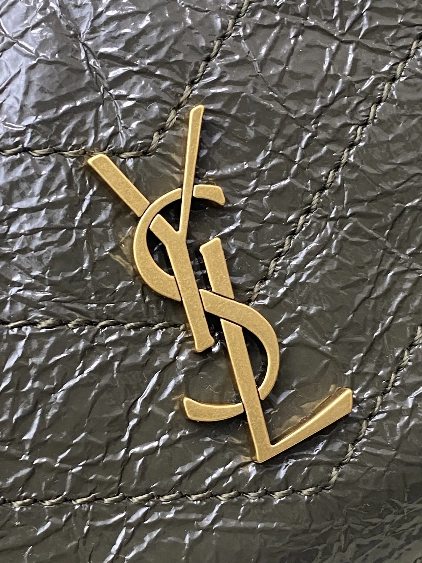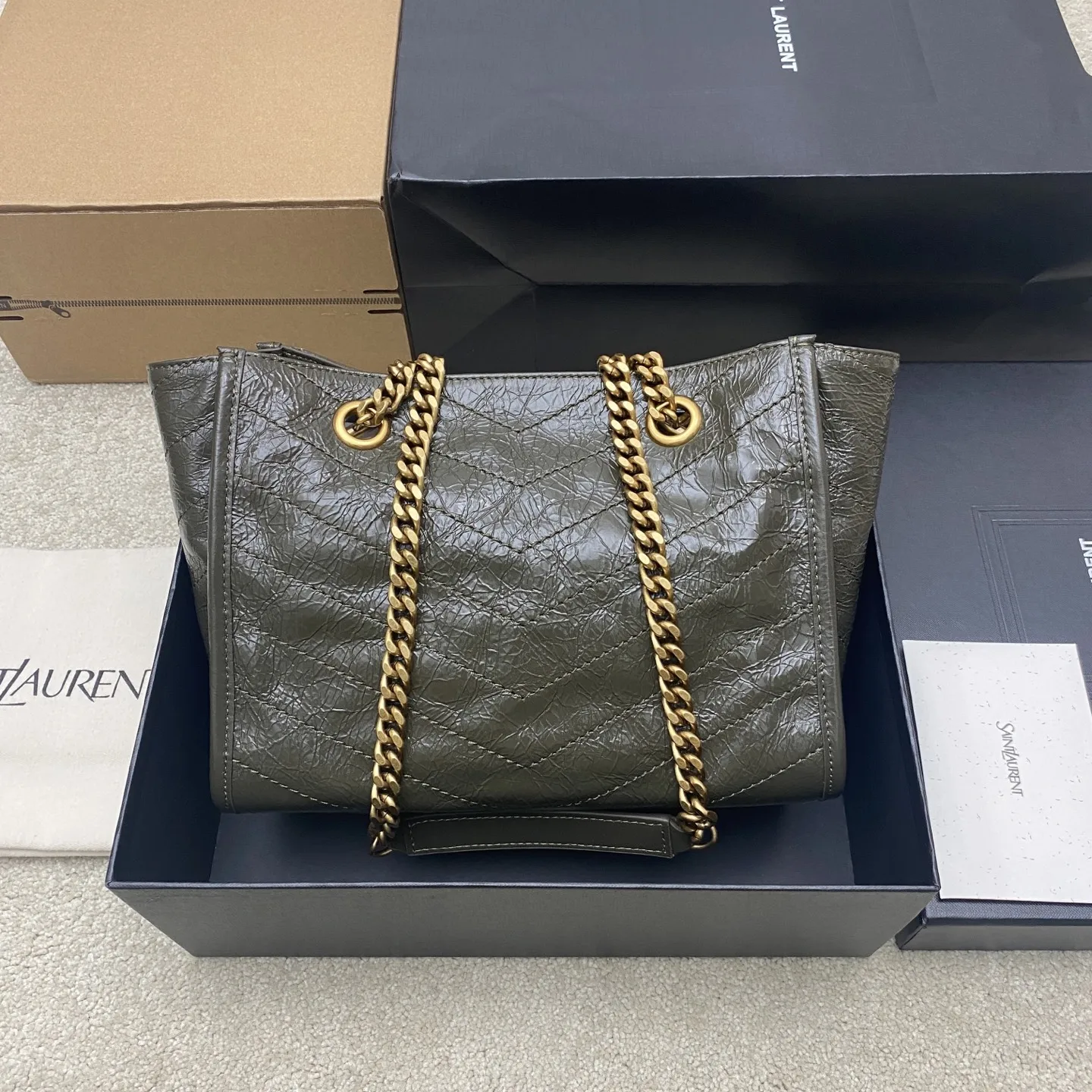 Oil wax green leather Saint Laurent Niki small shopping bag, black and gold color scheme is super textured! Oil wax cowhide material, natural wrinkles on the surface, soft and d..