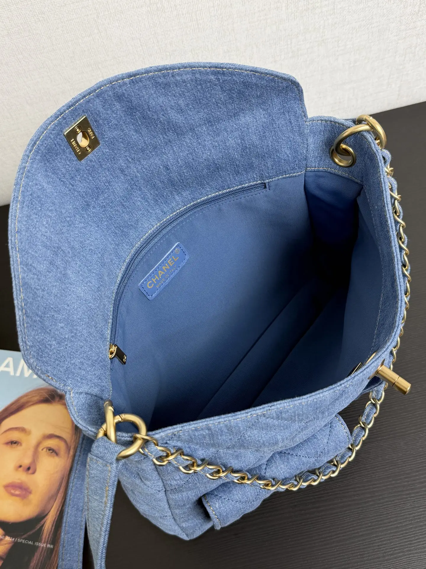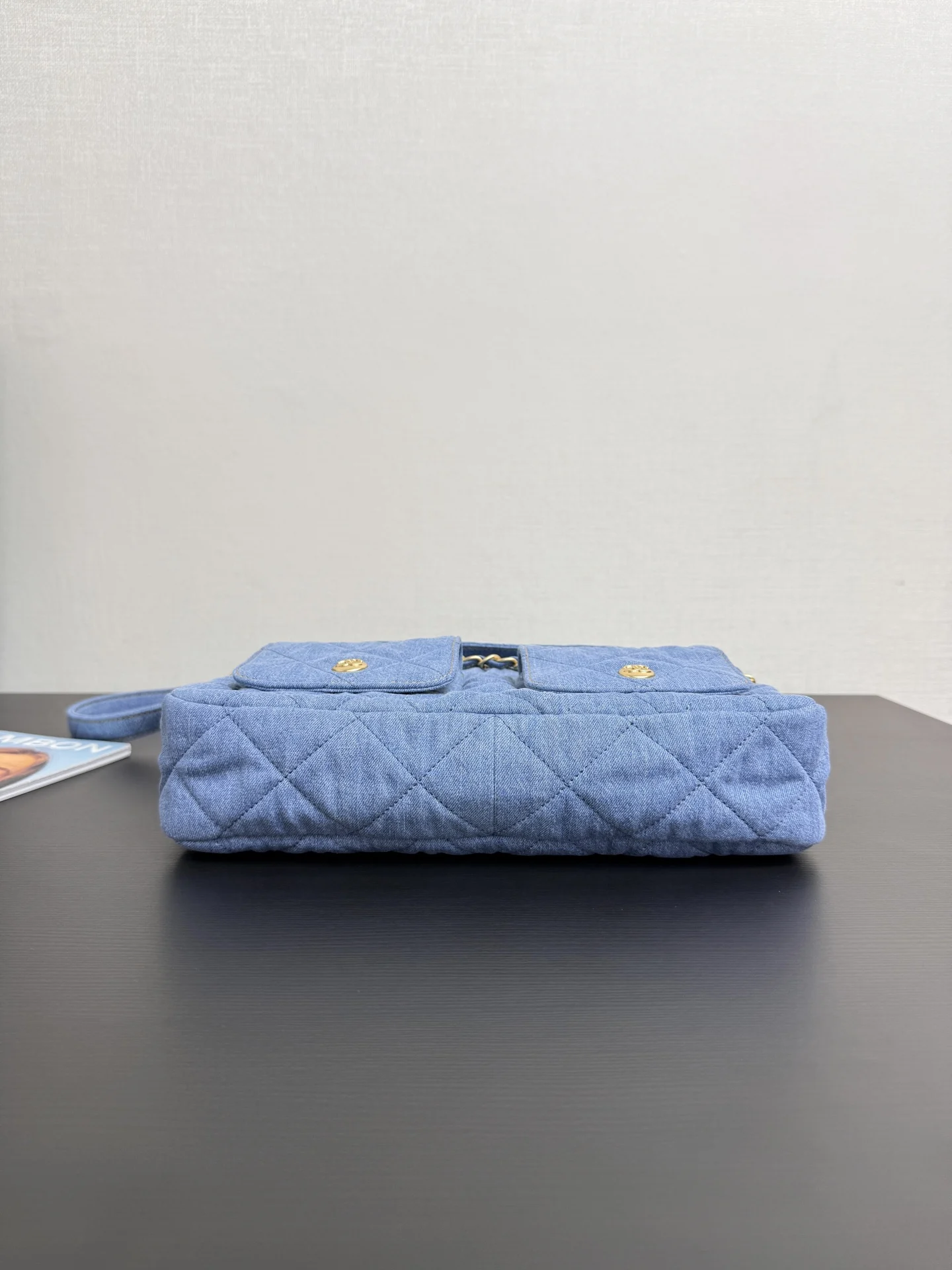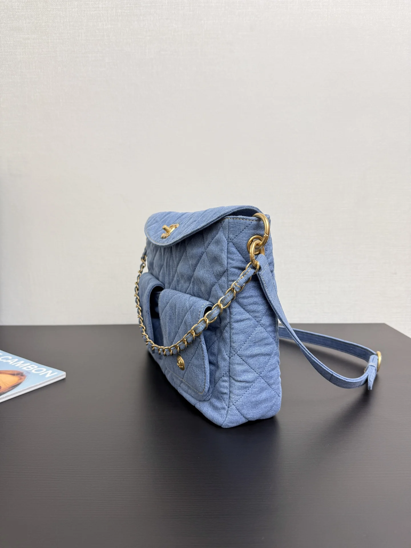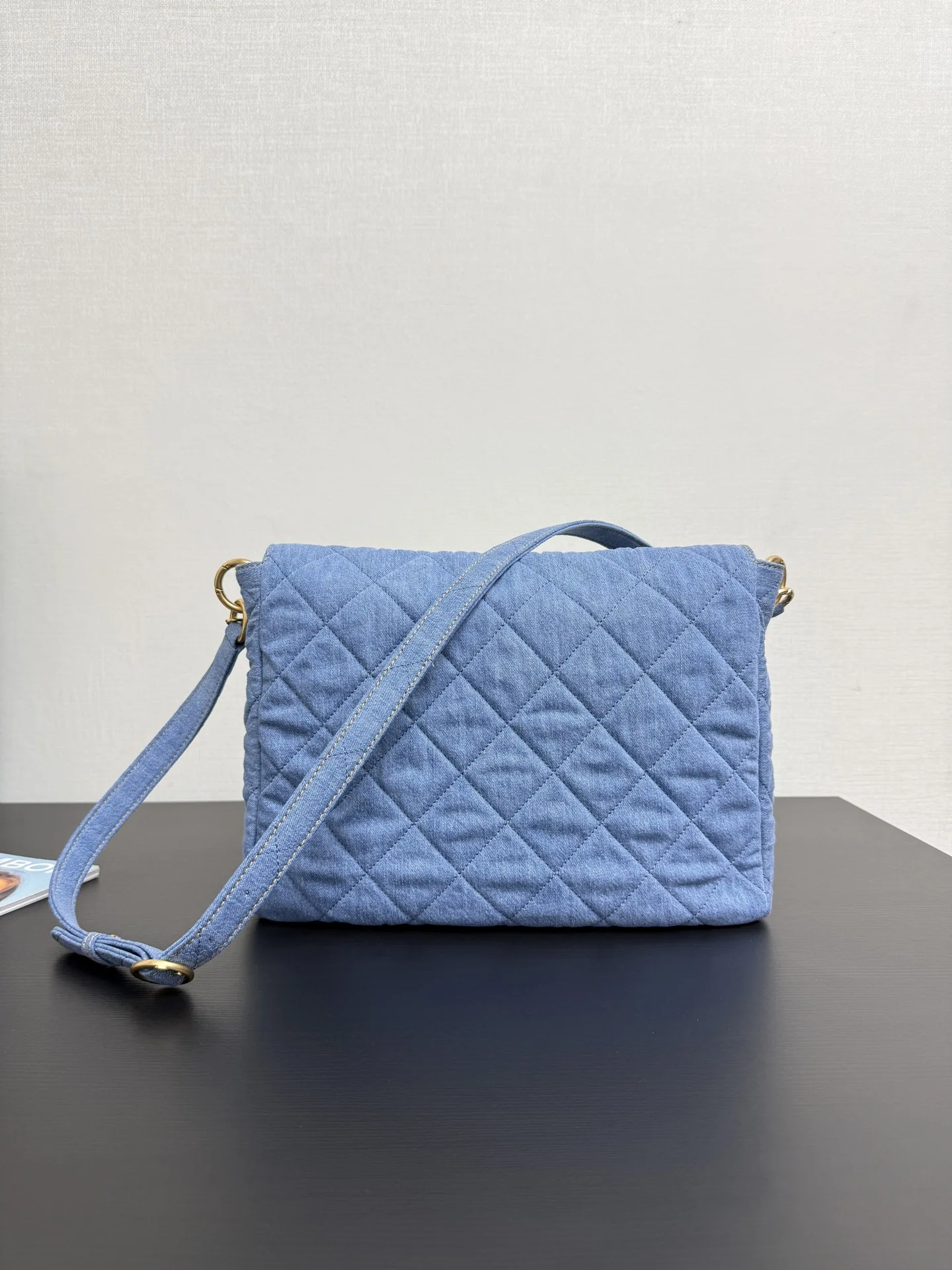 Original factory leather 25P Postman Bag in denim with two interchangeable straps for shoulder bag, underarm bag, single shoulder, and crossbody wear. Soft denim fabric. For a relaxed, slouchy look, the strap can be adjusted to its longest length. The interior is very spacious and can hold an iPad and magazines. Features a classic diamond pattern design, emphasizing a cool, clean, and sharp style. Two front pockets with magnetic closures for easy access to small items. Small size: 20 25 5cm. Large size: 22*30*5cm. 99464