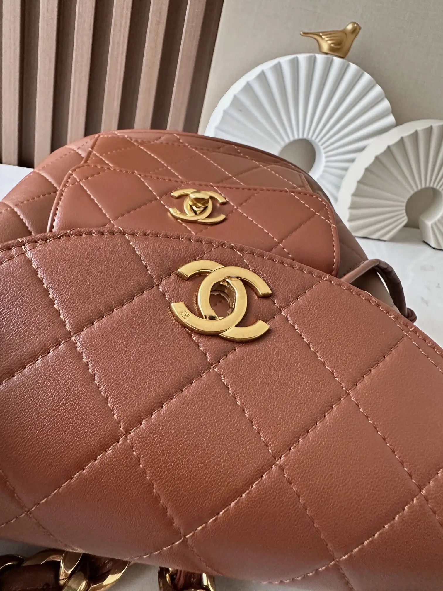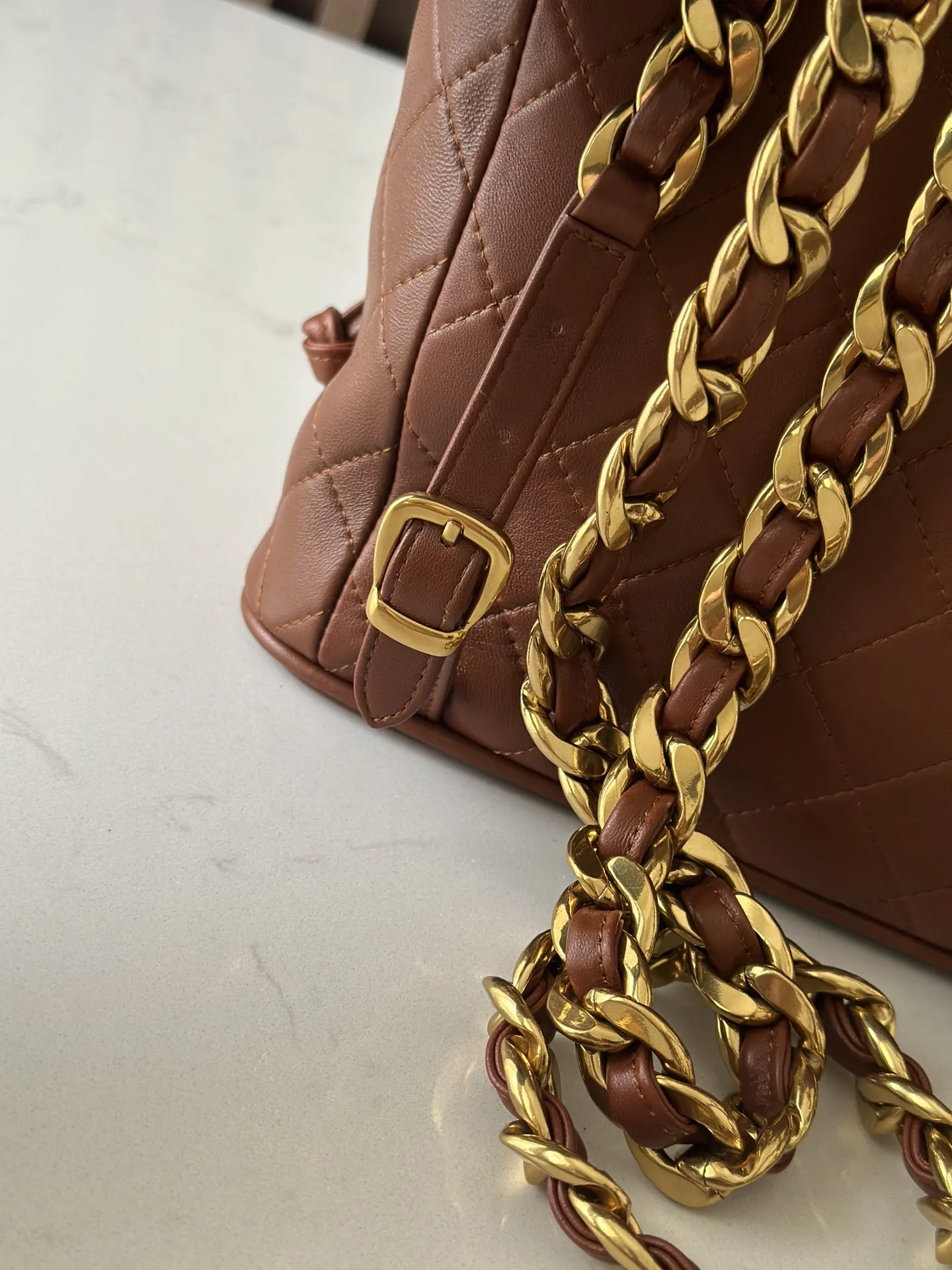 Chane Vintage Backpack. It s no exaggeration to say that this is a vintage backpack that can be passed down through generations! The classic double C logo and diamond pattern are paired with gold metal and leather chain shoulder straps for a luxurious feel. The soft and delicate lambskin makes you want to own and cherish it! It can be used in all seasons and can be matched with any style. It s a must-have in your bag collection Dimensions: 21 10 20.5cm A2210 Brown Lambskin.