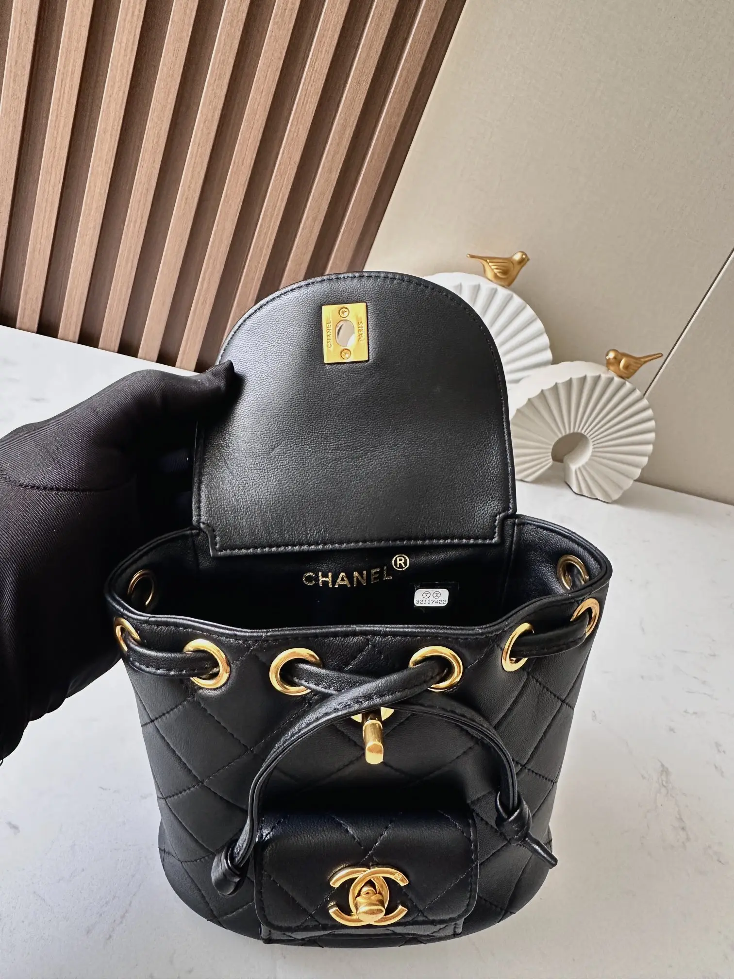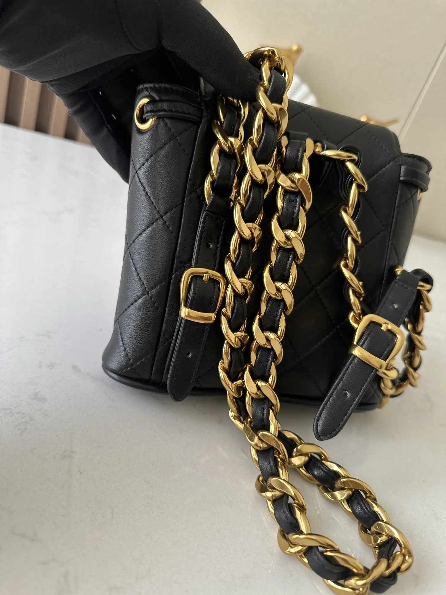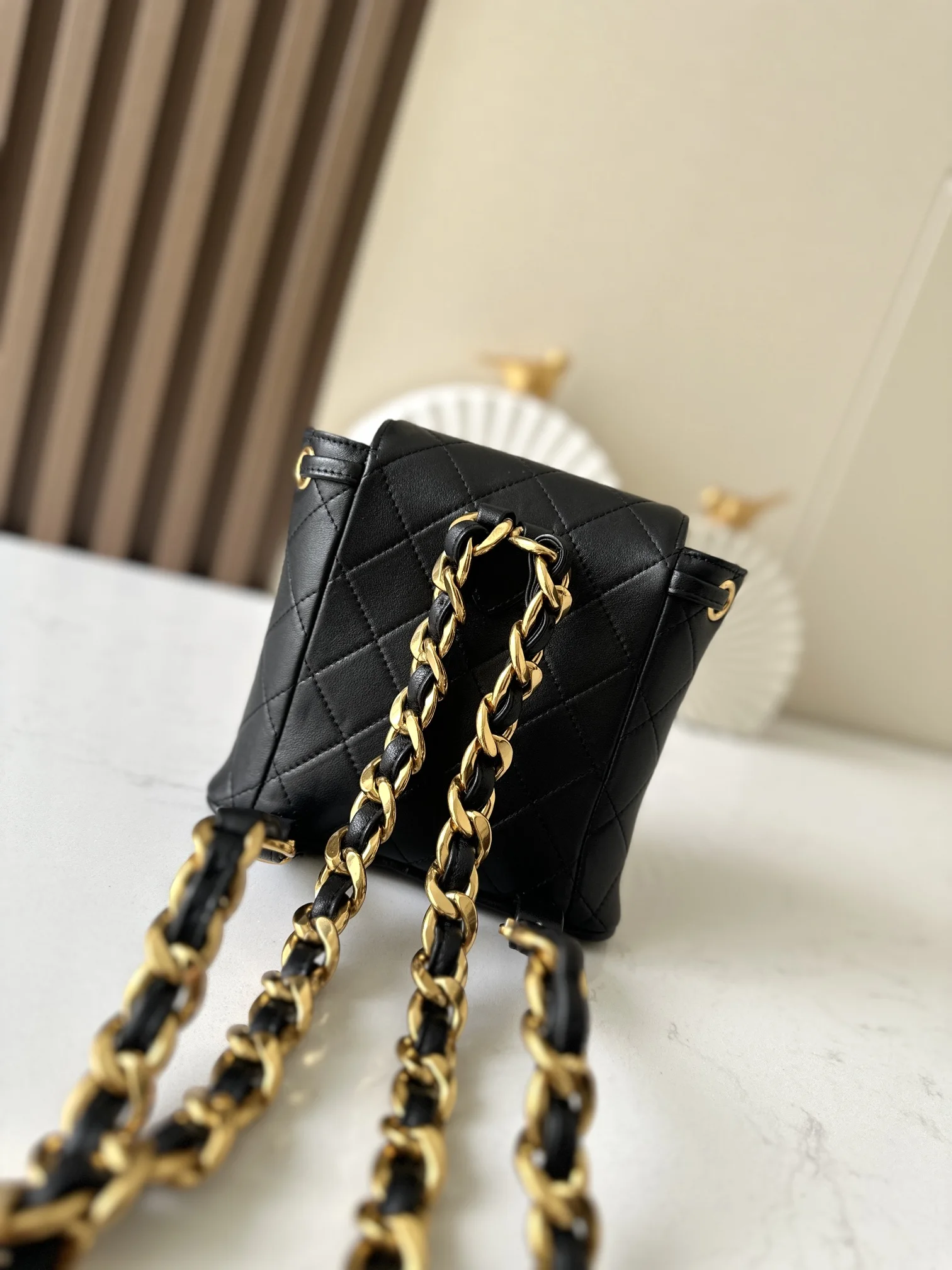 Chane Vintage Backpack. It s no exaggeration to say that this is a vintage backpack that can be passed down through generations! The classic double C logo and diamond pattern are paired with gold metal and leather chain shoulder straps for a luxurious feel. The soft and delicate lambskin makes you want to own and cherish it! It can be used in all seasons and can be matched with any style. It s a must-have in your bag collection Dimensions: 17 7 15cm A2211 Brown Lambskin.