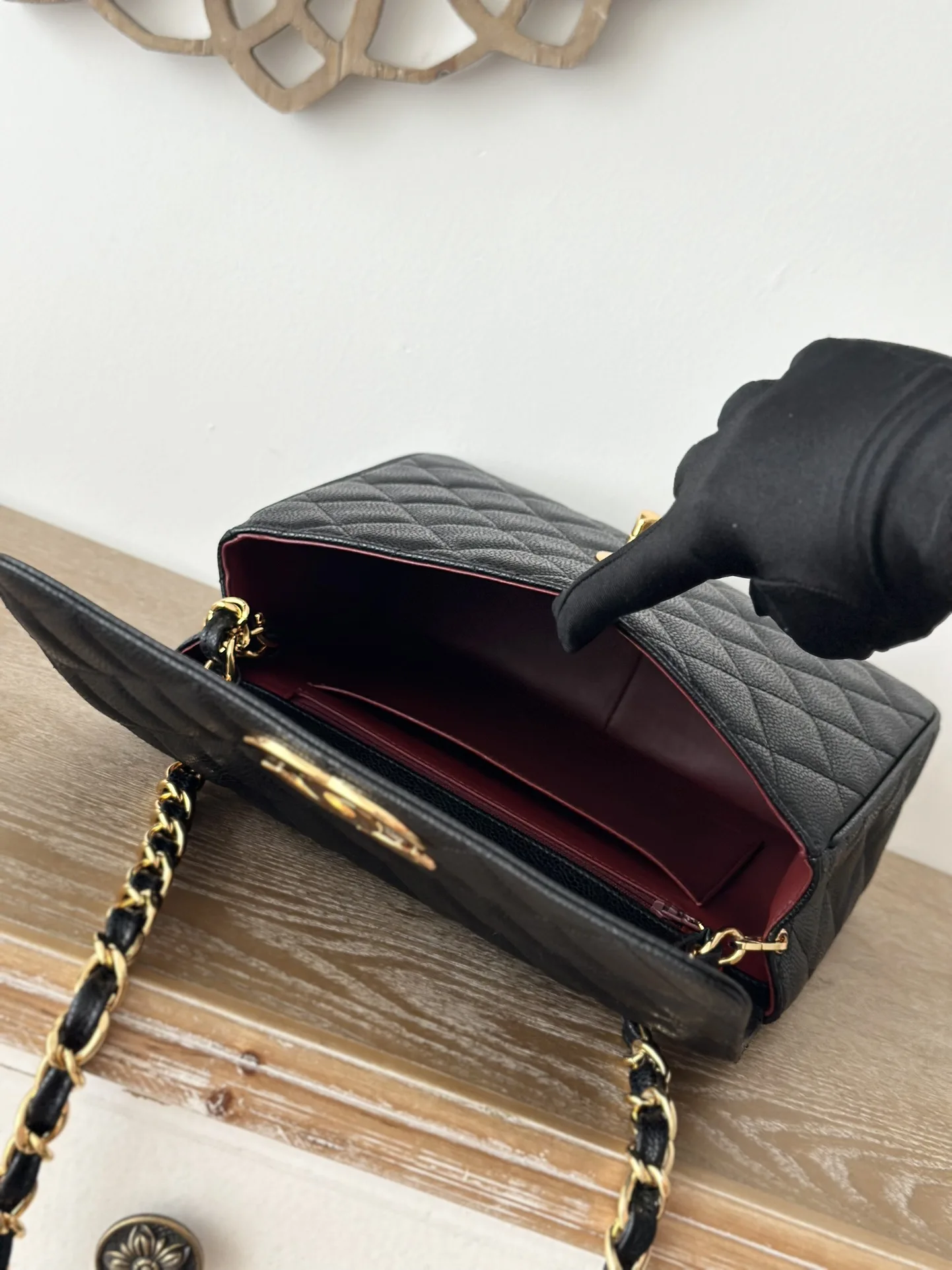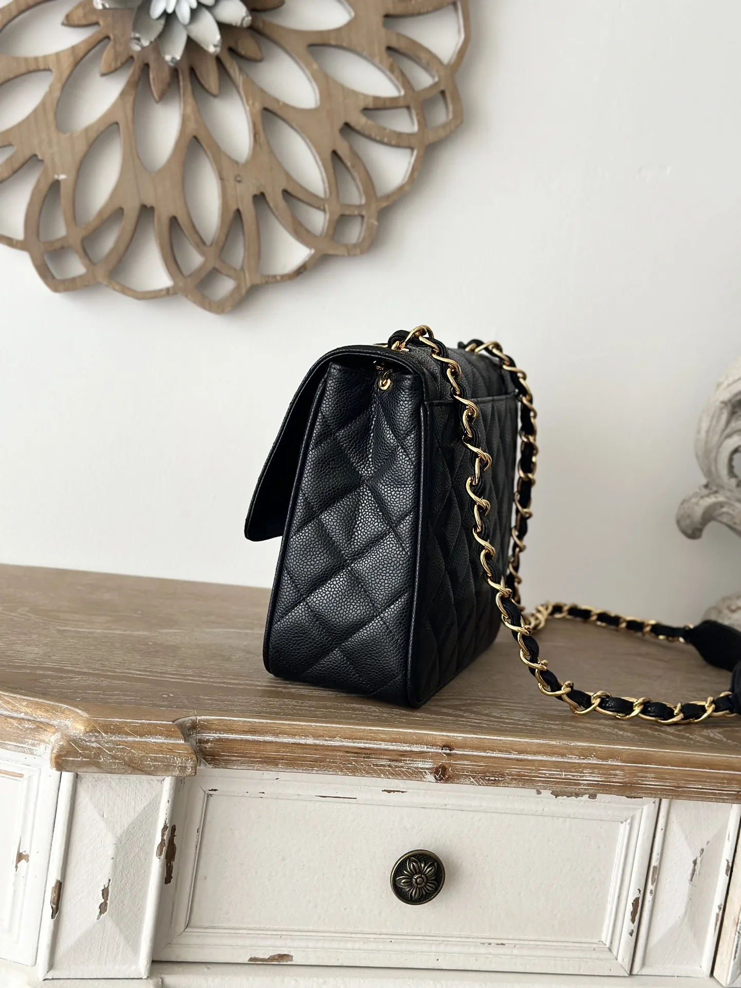 Victoria Beckham Style Black Caviar Leather In Stock Chane Vintage Rare Gold Buckle CF Chanel Classic Flap Bag, a re-release with slight modifications to Coco Chanel s design after Karl Lagerfeld took over Chanel in 1983, is Lagerfeld s proudest debut work. The large CF is very popular among celebrities and bloggers. Its highlight is the gold-plated large double C logo, which is no longer available in the current boutique version of the CF, which features a small double C. It features a flap design with a very large capacity and can be worn on the shoulder, crossbody, or with the chain shortened as a handbag. Dimensions 25 20 9cm, Serial Number A2218, Medium Vertical, Black Caviar Leather