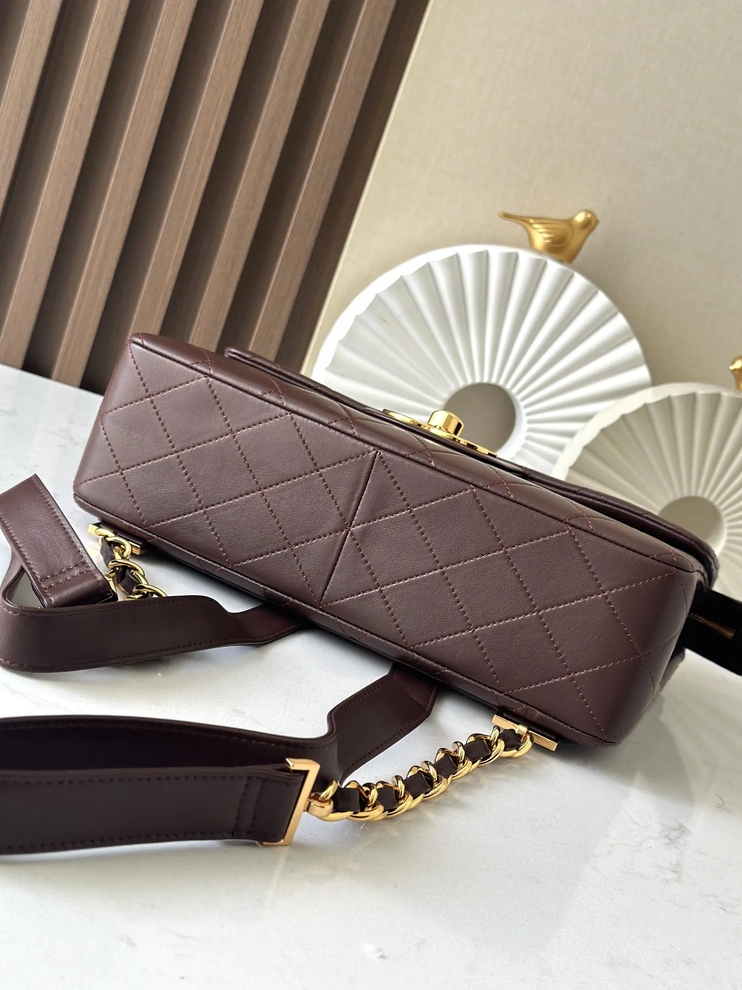 Victoria Beckham s style, a rare vintage Chanel backpack with large gold hardware, available now. The Chanel Classic Flap Bag is a reintroduction of Coco Chanel s design with slight modifications by Karl Lagerfeld after he took over Chanel in 1983, and is considered Lagerfeld s most successful debut creation. Among them, the large CF is very popular among celebrities and bloggers. Its highlight is the gold-plated large double C logo, which is no longer featured in the current boutique version of the CF, which has smaller double C s. Victoria Beckham likes to shorten the chain of this bag and use it as a handbag. It features a double-sided flap design and has a very large capacity for a chain bag, while being very lightweight. It can be worn on the shoulder, crossbody, or the chain can be shortened to be used as a handbag. Highly recommend getting Victoria Beckham s bag . Dimensions: 30.21.8cm. Serial number: A2219. Brown lambskin backpack.