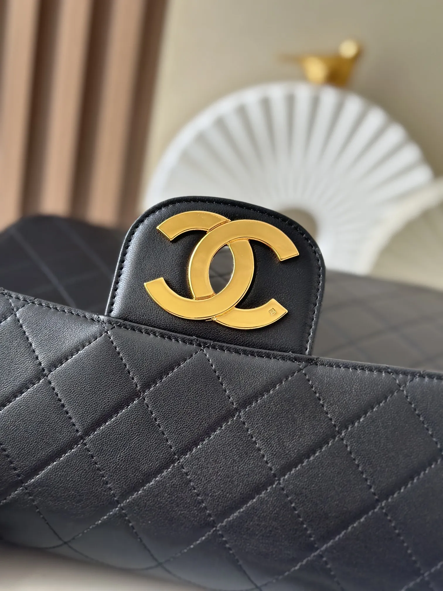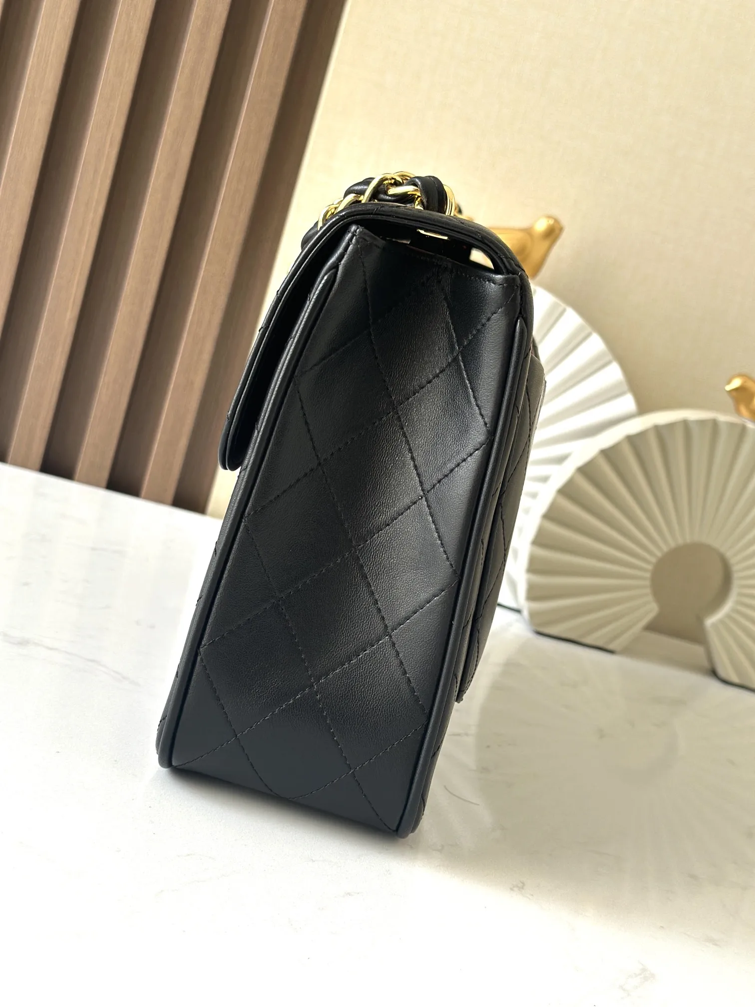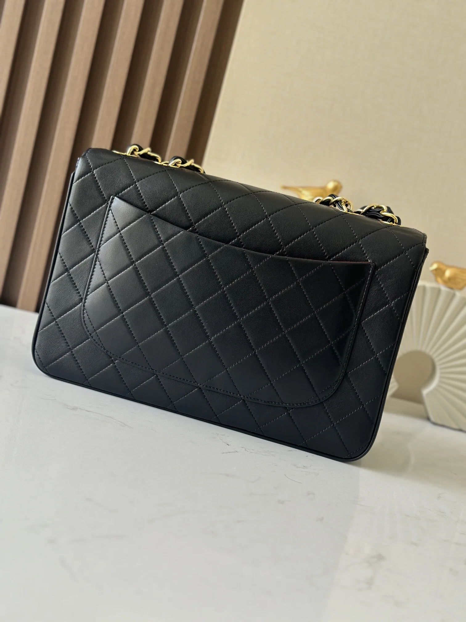 Victoria Beckham same style, rare Chanel Classic Flap Bag with large gold hardware in stock. The Chanel Classic Flap Bag is a re-release of Coco Chanel s design with slight modifications by Karl Lagerfeld after he took over Chanel in 1983, and is Lagerfeld s proudest pioneering work. Among them, the large CF is very popular among celebrities and bloggers. Its highlight is the gold-plated large double C logo, and the current store version of CF no longer has this design, they are all small double C s. Victoria Beckham likes to shorten the chain of this bag and use it as a handbag. It adopts a double-sided flap design, and the capacity is very large among chain bags, and it is very light in weight. It can be used as a shoulder bag, crossbody bag, or the bracelet can be shortened to become a handbag. Recommended to buy Victoria Beckham bag Size: 30.21.8cm Number: A2222 Black Lambskin.