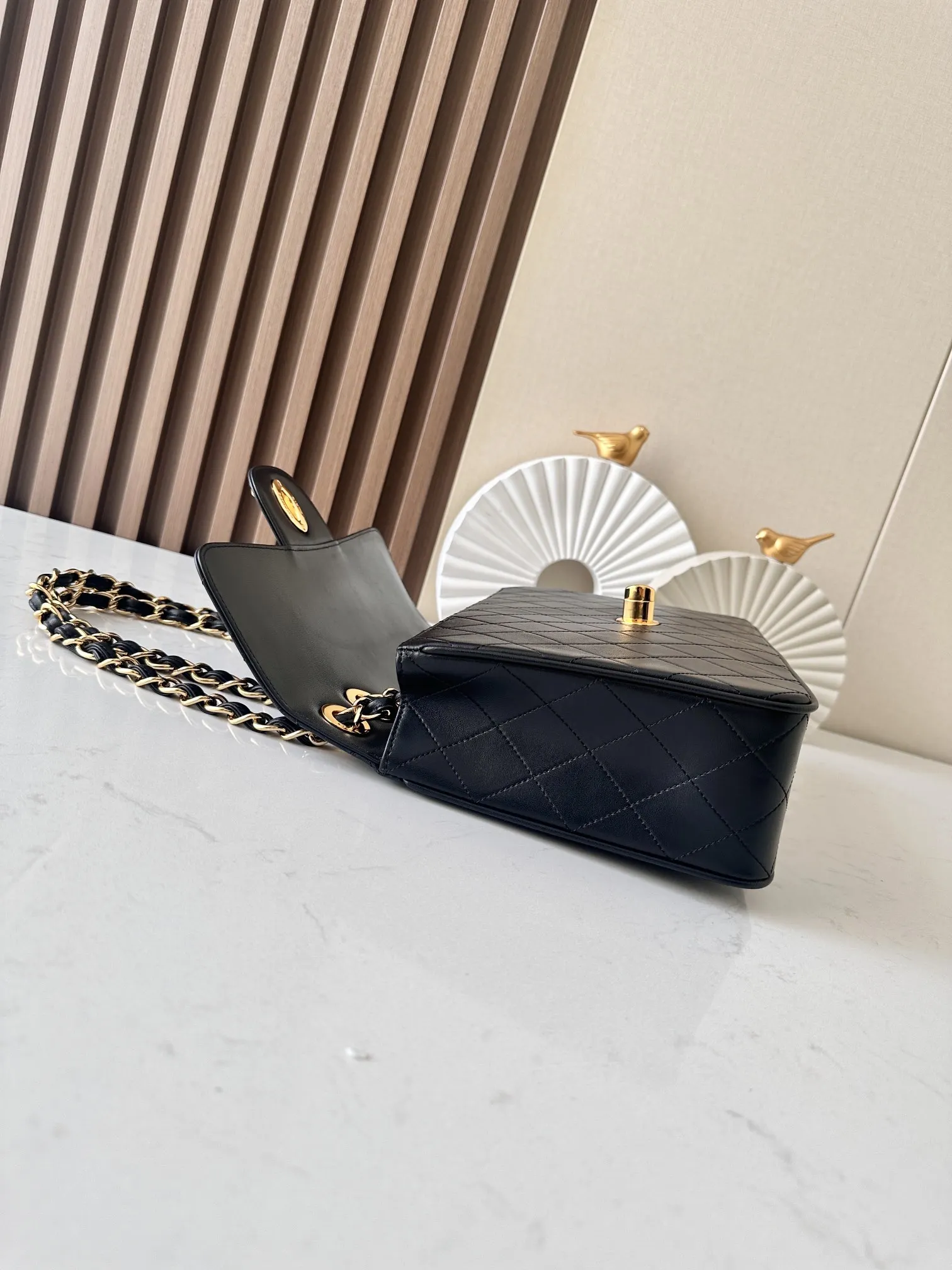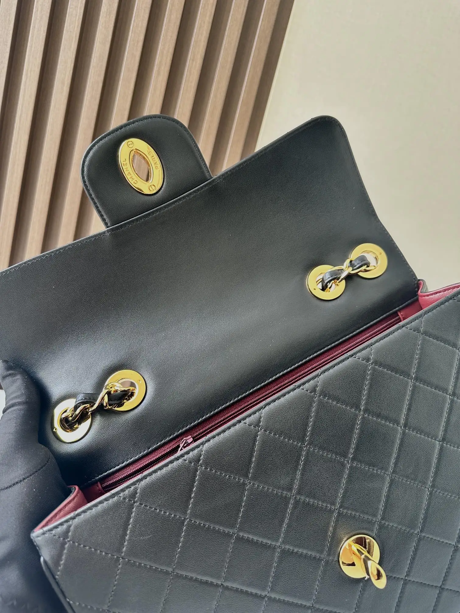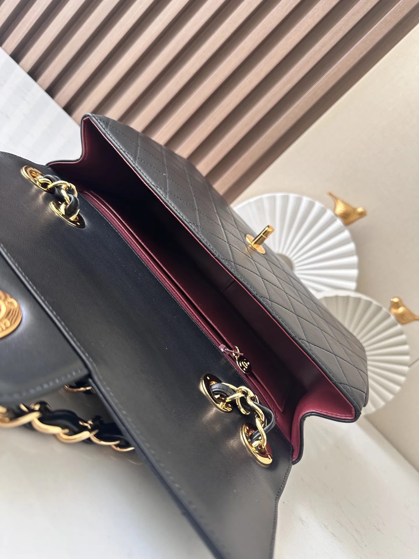 Victoria Beckham same style, rare Chanel Classic Flap Bag with large gold hardware in stock. The Chanel Classic Flap Bag is a re-release of Coco Chanel s design with slight modifications by Karl Lagerfeld after he took over Chanel in 1983, and is Lagerfeld s proudest pioneering work. Among them, the large CF is very popular among celebrities and bloggers. Its highlight is the gold-plated large double C logo, and the current store version of CF no longer has this design, they are all small double C s. Victoria Beckham likes to shorten the chain of this bag and use it as a handbag. It adopts a double-sided flap design, and the capacity is very large among chain bags, and it is very light in weight. It can be used as a shoulder bag, crossbody bag, or the bracelet can be shortened to become a handbag. Recommended to buy Victoria Beckham bag Size: 30.21.8cm Number: A2222 Black Lambskin.
