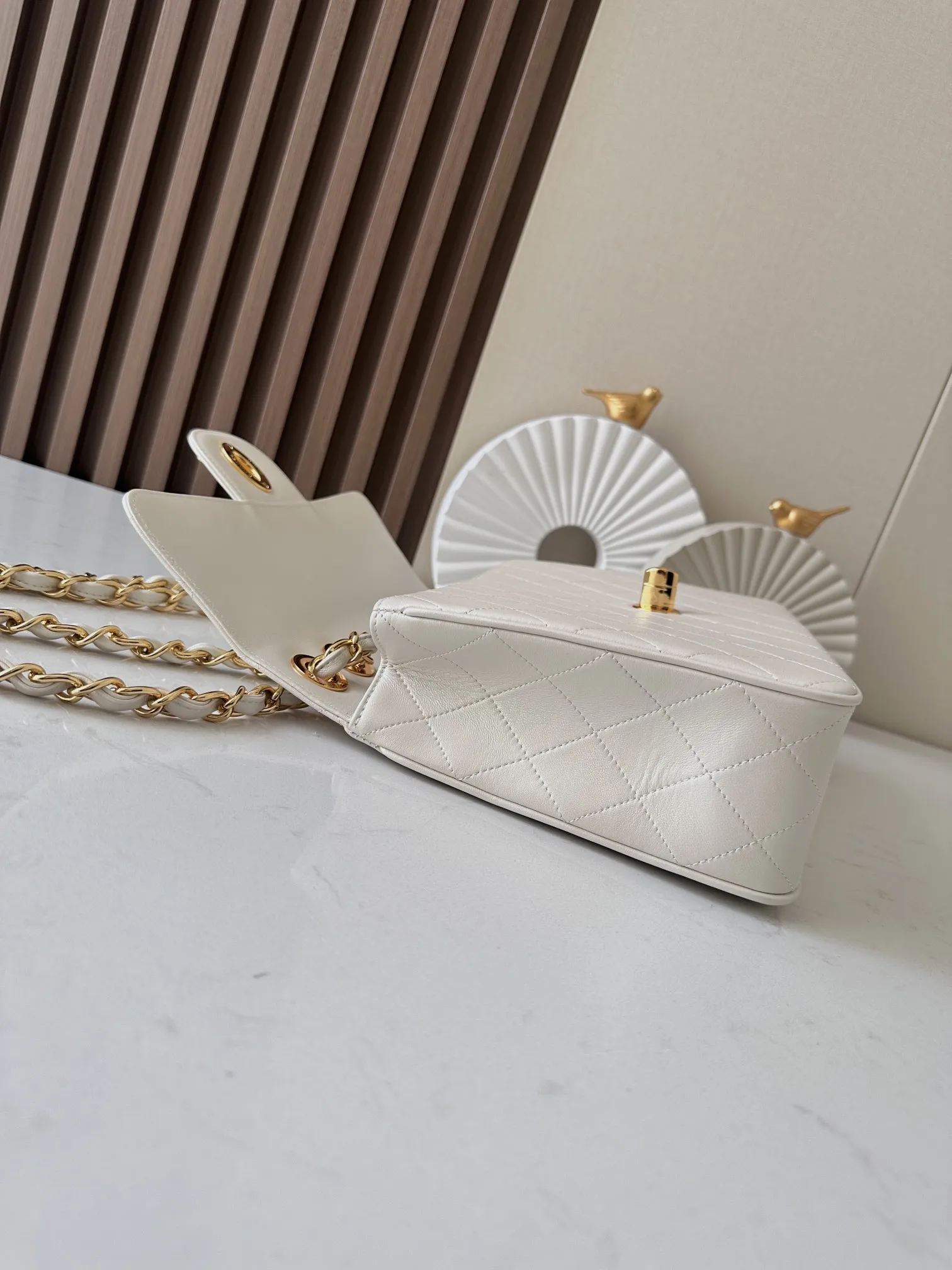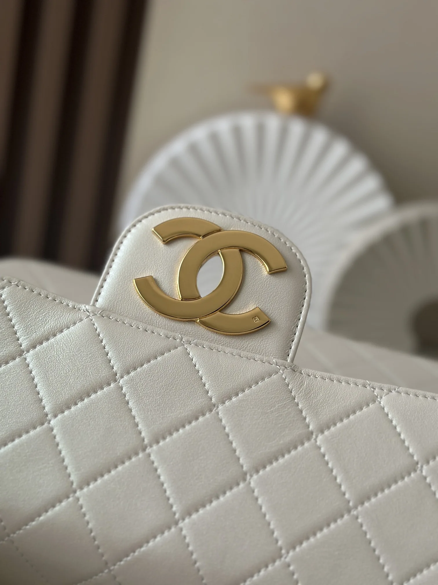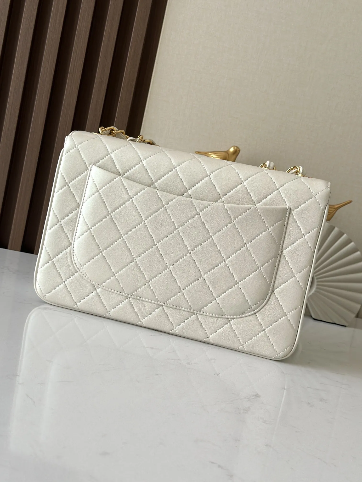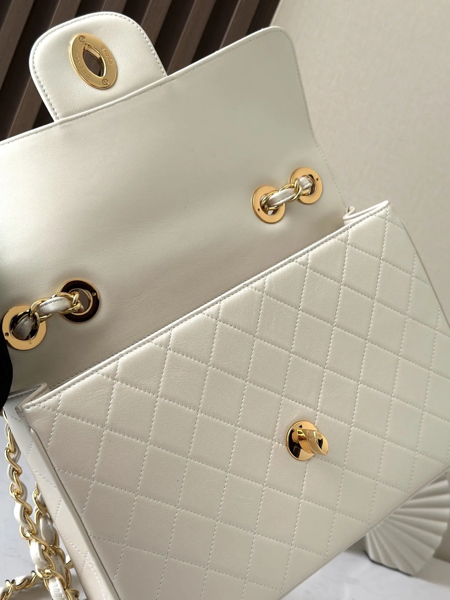 Victoria Beckham s favorite, rare Chanel Classic Flap Bag with large gold hardware in stock. The Chanel Classic Flap Bag was relaunched by Karl Lagerfeld in 1983 after he took over Chanel, with slight modifications to Coco Chanel s original design. It is considered Lagerfeld s most successful debut creation. The large CF, favored by celebrities and bloggers, features a gold-plated, oversized double C logo, a design no longer found in current boutique versions, which feature smaller double C s. Victoria Beckham often shortens the chain to use it as a clutch. Featuring a double-sided flap design, it offers a generous capacity for a chain bag and is lightweight. It can be worn on the shoulder, crossbody, or as a handbag by shortening the chain. Highly recommend this Victoria Beckham style bag. Size: 30.21.8cm. Serial number: A2222, Lambskin Pearly White.