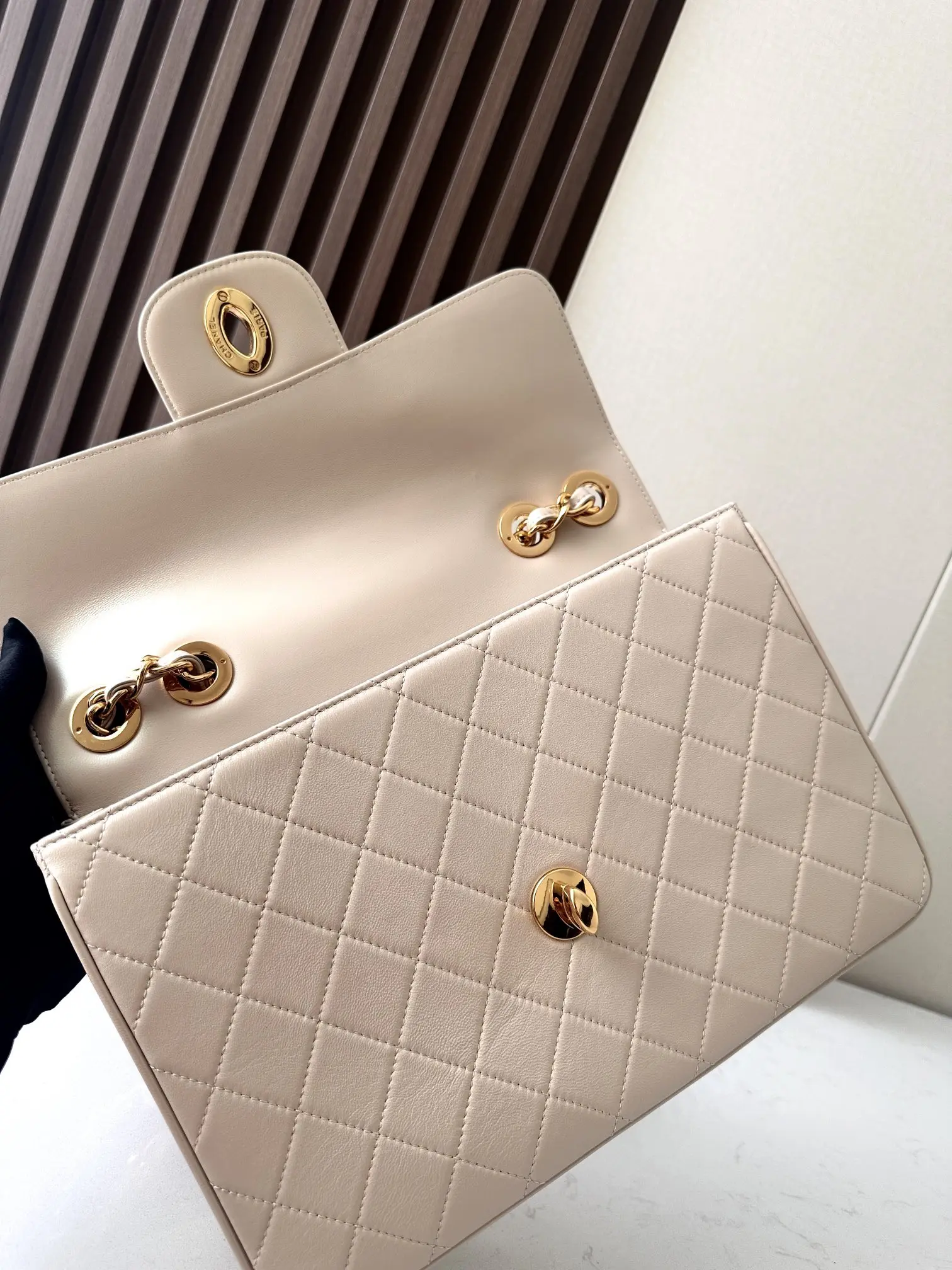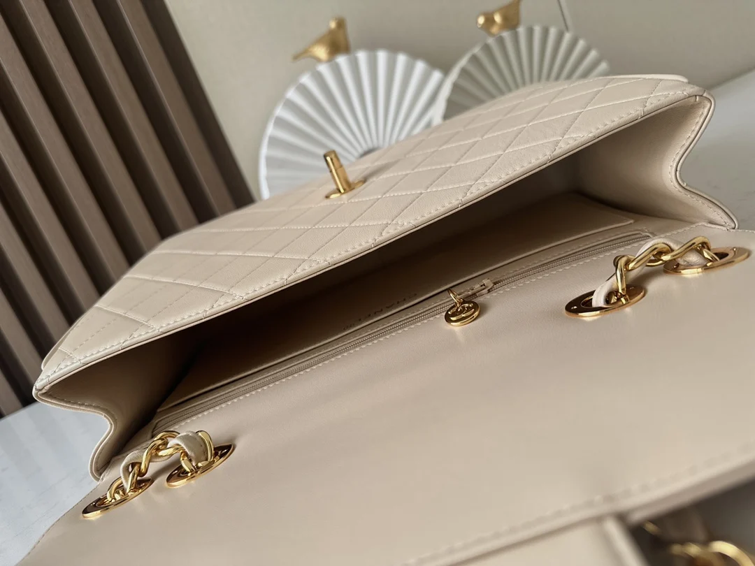Victoria Beckham s style, a rare vintage Chanel Classic Flap Bag with large gold hardware, available now. The Chanel Classic Flap Bag was relaunched by Karl Lagerfeld in 1983 after he took over Chanel, with slight modifications to Coco Chanel s original design. It is considered Lagerfeld s signature creation. The large CF, favored by celebrities and bloggers, features a prominent gold-plated double C logo, a design no longer found in current boutique versions, which feature smaller double C s. Victoria Beckham often shortens the chain of this bag to use it as a clutch. It features a double flap design, offering a generous capacity for a chain bag, and is lightweight. It can be worn on the shoulder, crossbody, or as a handbag by shortening the chain. Highly recommend this Victoria Beckham style bag . Dimensions: 30.21.8cm. Serial number: A2222. Lambskin with pearly apricot finish.