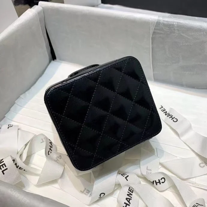 Small Chane Vintage Vanity Case. This is a vintage, quirky vanity case from Chanel. This green handbag has a pearlescent effect, reflecting different colors under different lights. The color detail is top-notch! The handle is meticulously handcrafted in terms of both curvature and color. It has a super large capacity and a built-in mirror. It adds a touch of sophistication to any outfit! Size: 11*9.5*8.5cm. Model: A2227. Small size. Color: Patent leather black.