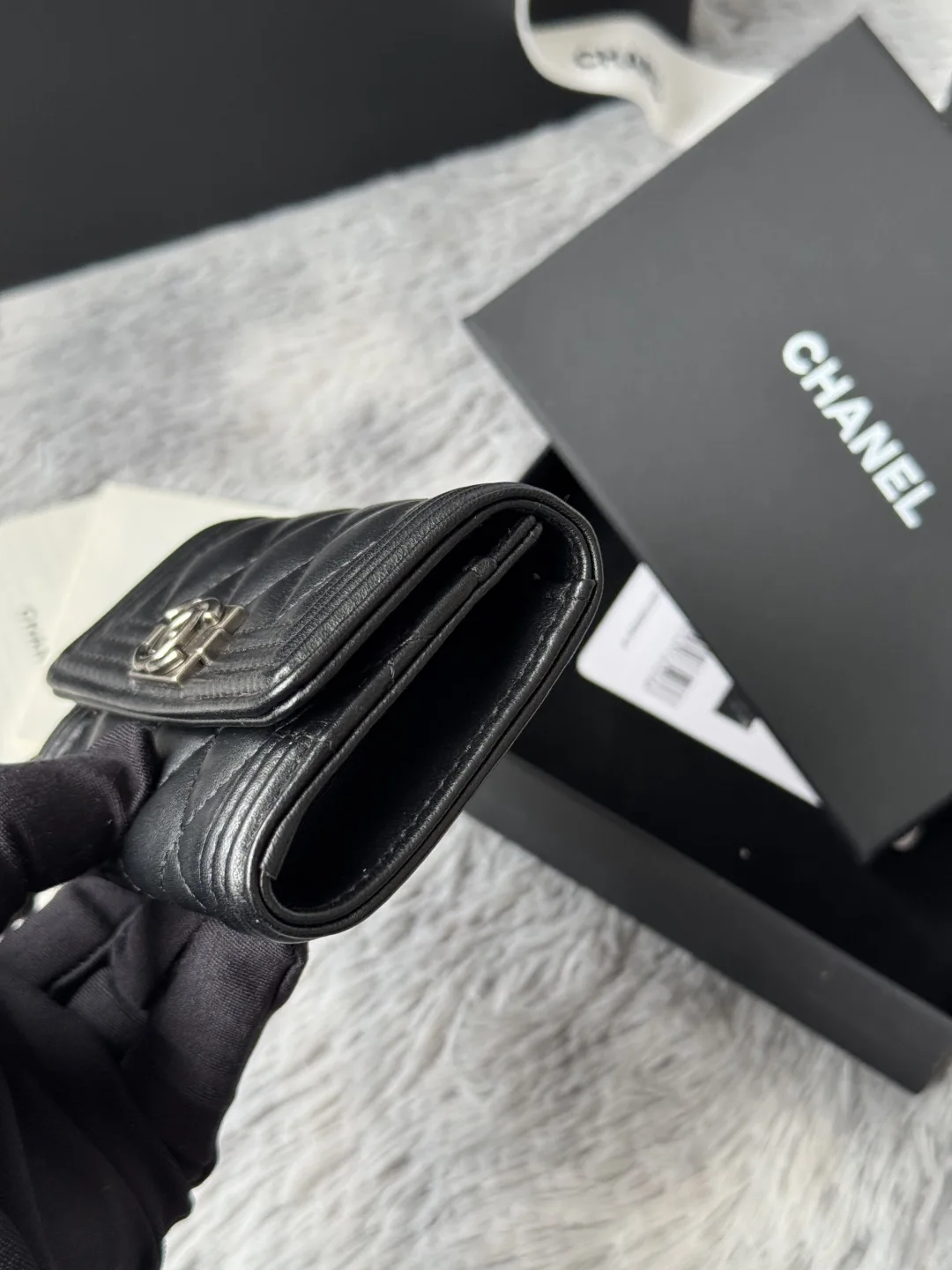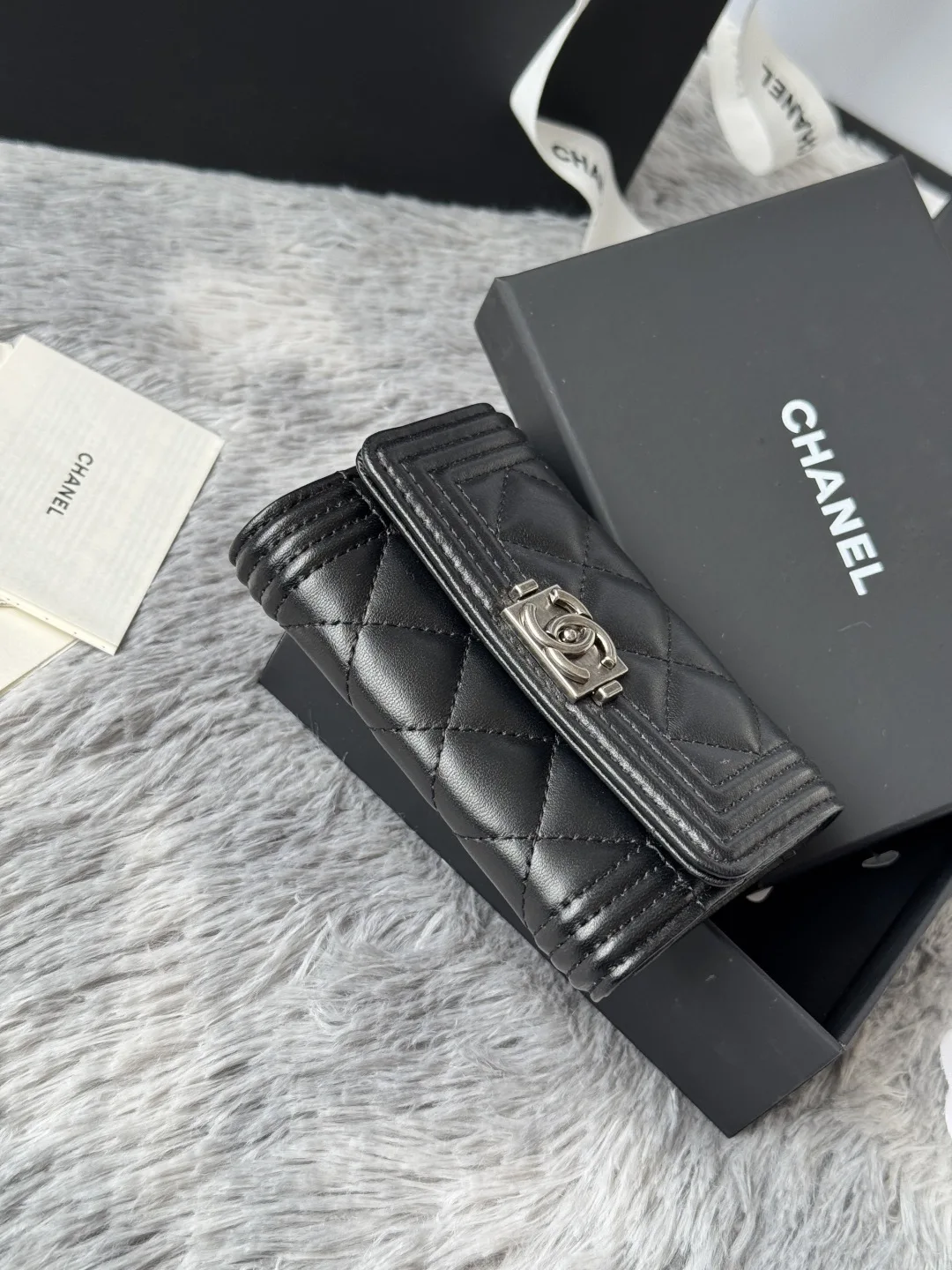 CHANEL leboy card holder now in stock. Diamond pattern, very durable and stylish with vintage gold and antique silver hardware. This card holder has a large capacity, holding appro..