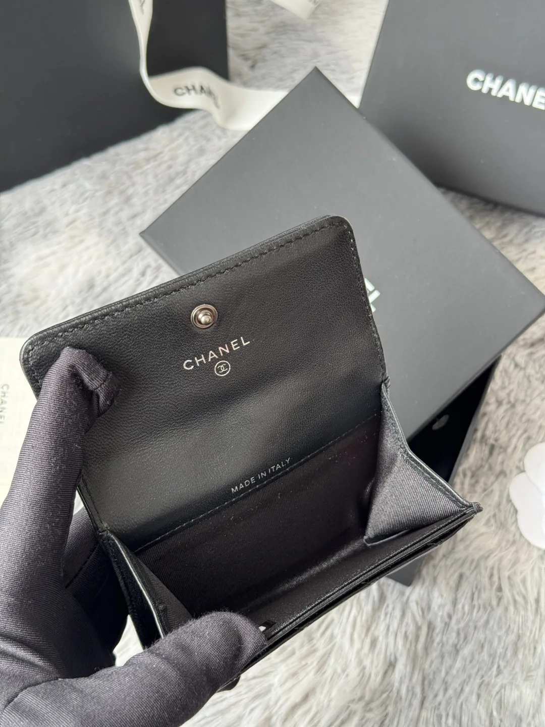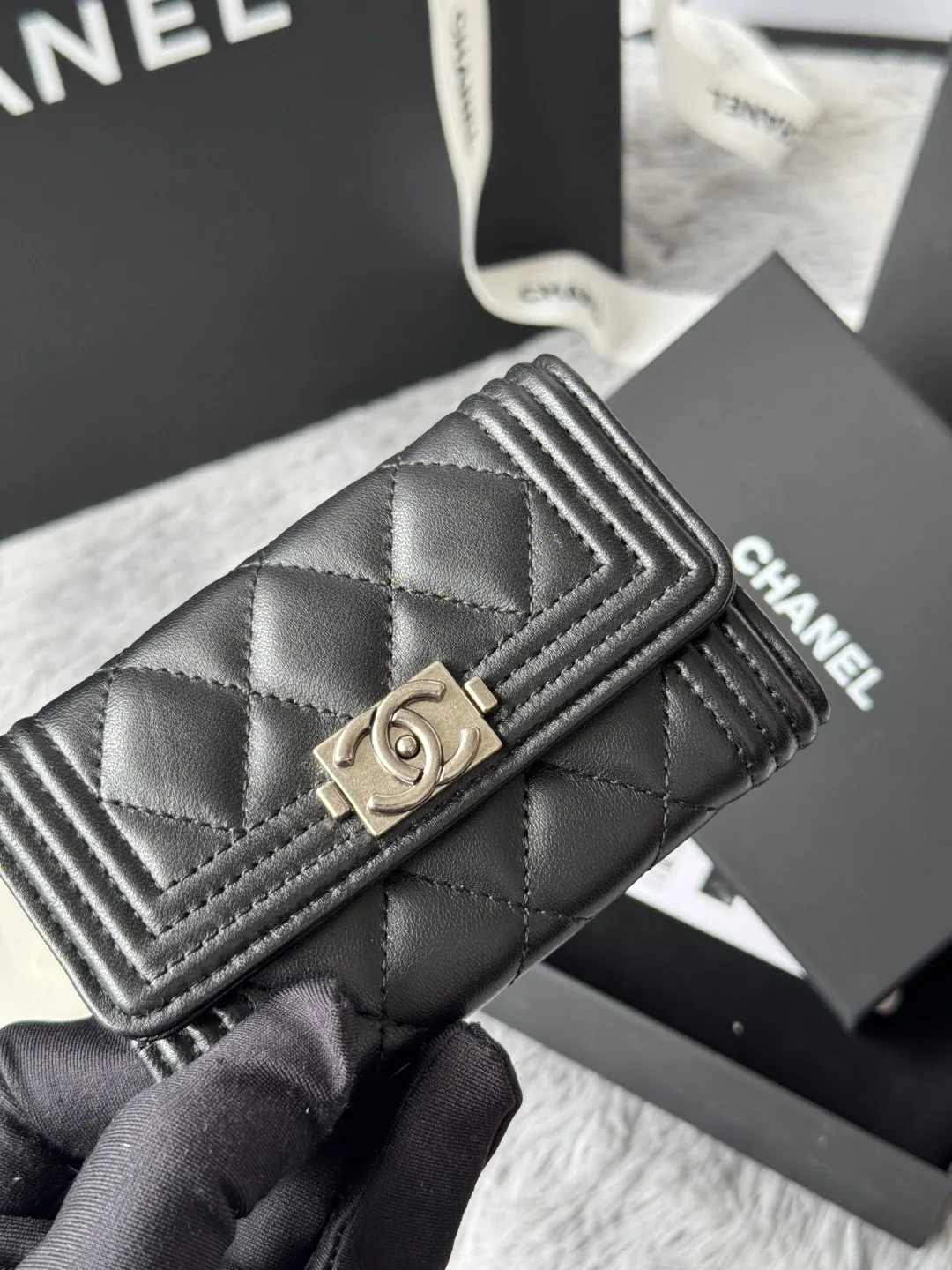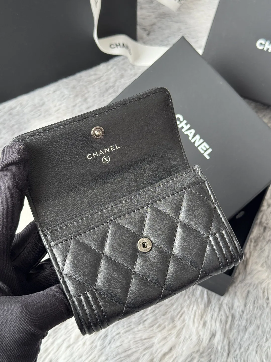 CHANEL leboy card holder now in stock. Diamond pattern, very durable and stylish with vintage gold and antique silver hardware. This card holder has a large capacity, holding approximately 1,000 RMB when folded in half, and can also fit 2-3 cards. Very practical. Style number A80603, dimensions 11*8.5*3cm.