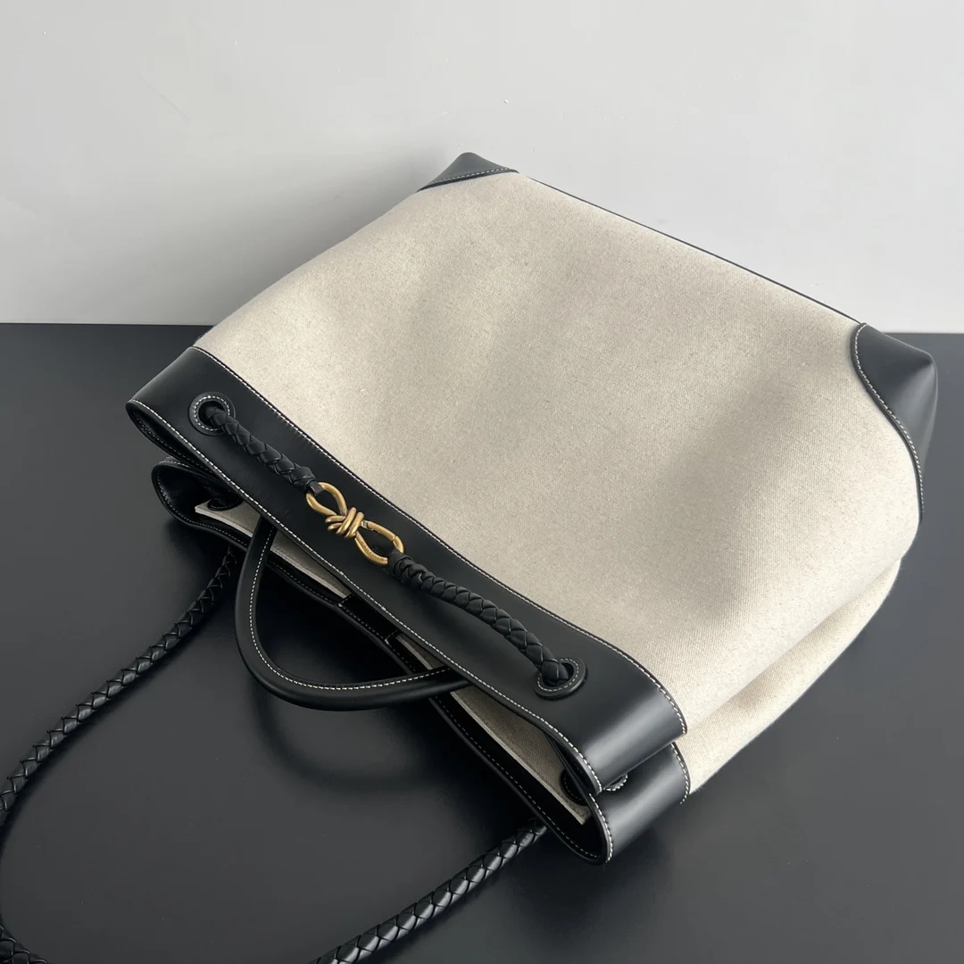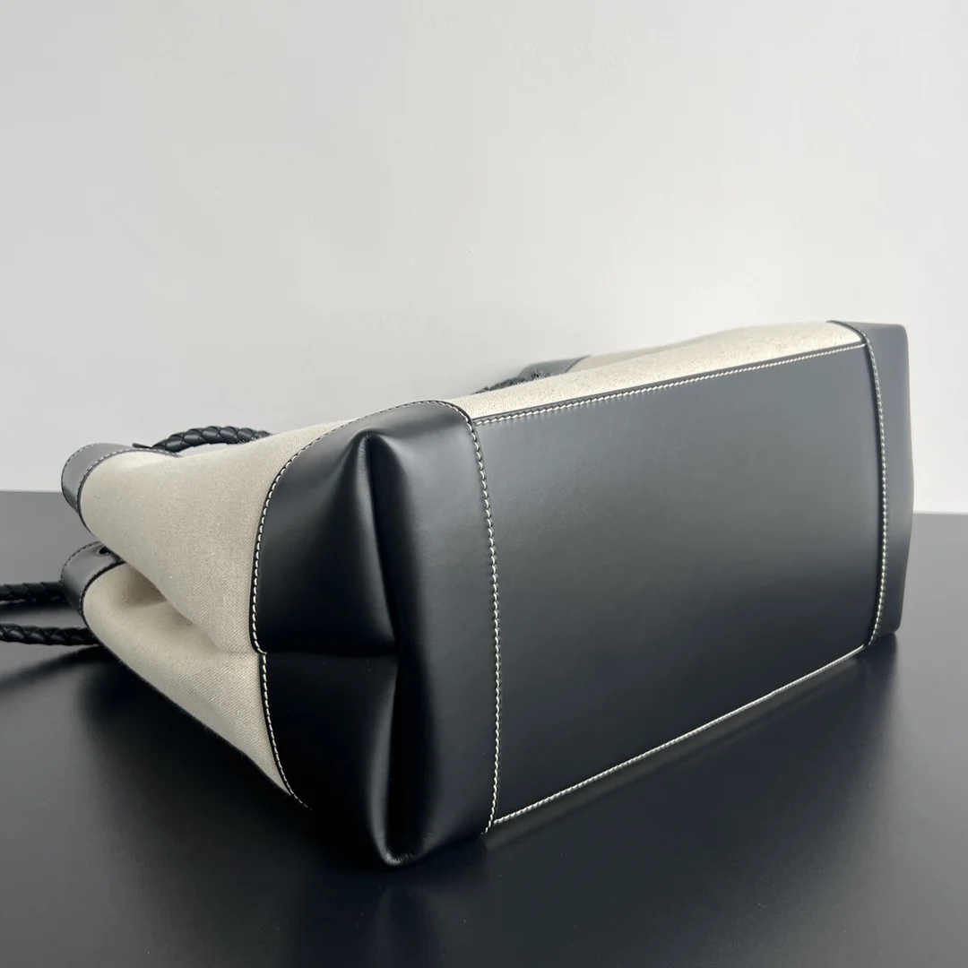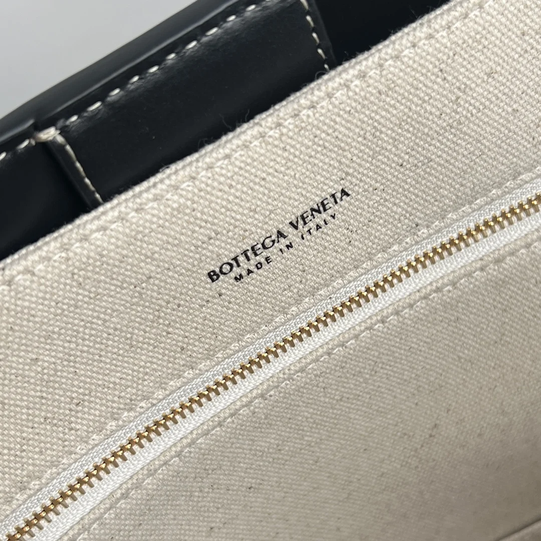 Bv Canvas and Leather Andiamo Bag 786194. Calfskin with canvas. Exquisite! A standout piece. Combining craftsmanship with carefully selected materials, it is durable while offering an extremely soft touch. Features a silver-tone metal knot leather-woven shoulder strap, offering multiple carrying options suitable for various occasions. Lightweight with a relaxed and effortless vibe, it feels gentler than full leather. Dimensions: 42x35x18.