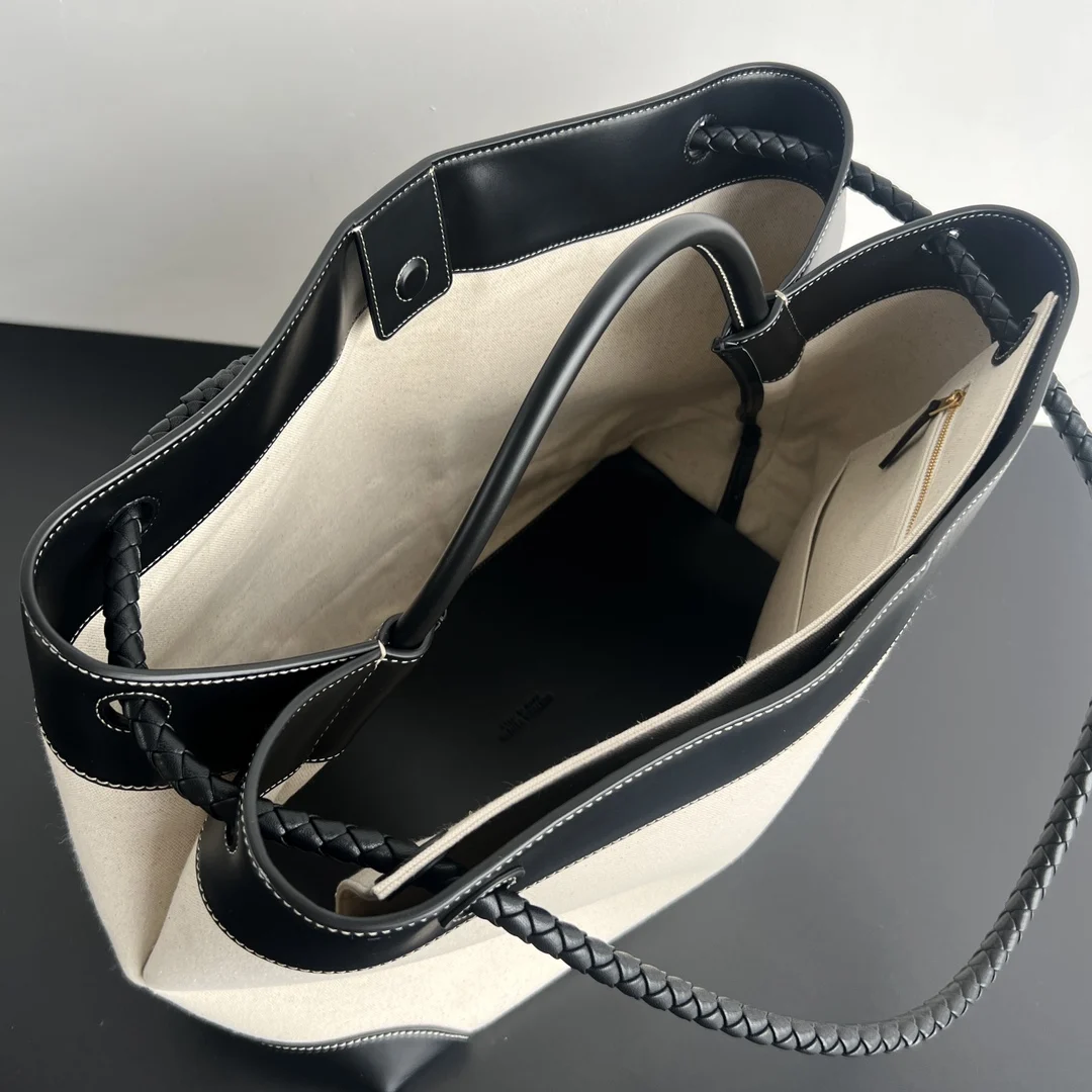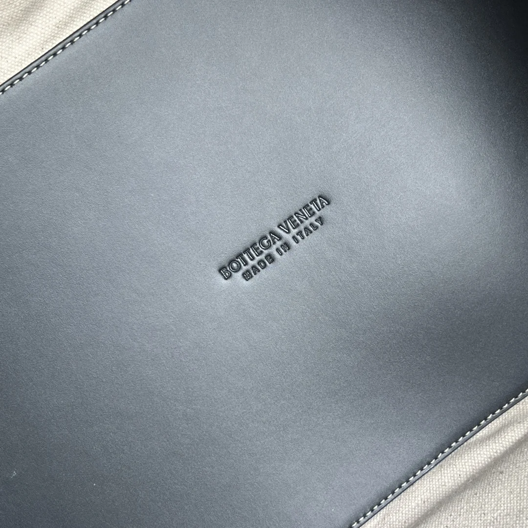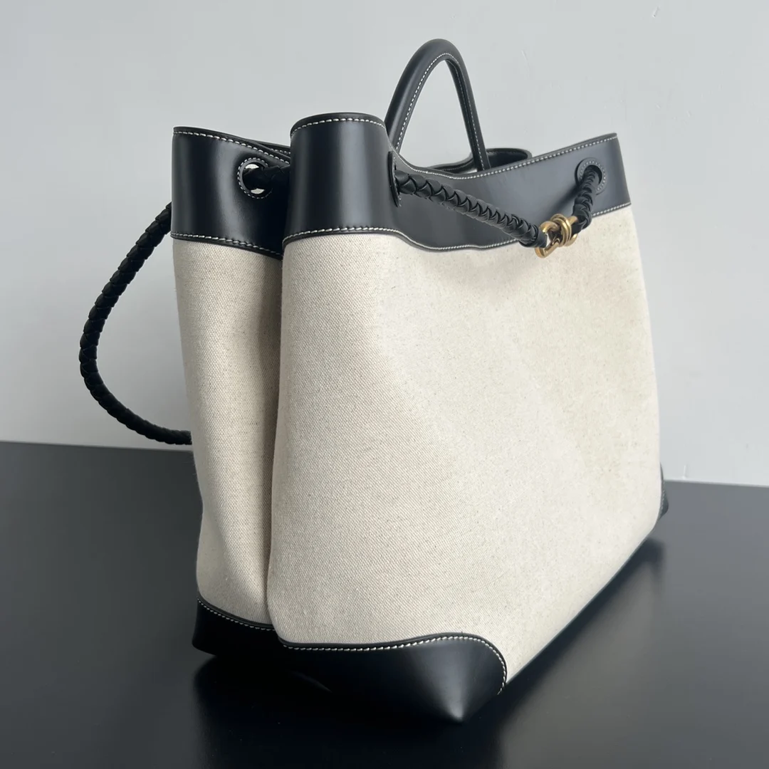 Bv Canvas and Leather Andiamo Bag 786194. Calfskin with canvas. Exquisite! A standout piece. Combining craftsmanship with carefully selected materials, it is durable while offering an extremely soft touch. Features a silver-tone metal knot leather-woven shoulder strap, offering multiple carrying options suitable for various occasions. Lightweight with a relaxed and effortless vibe, it feels gentler than full leather. Dimensions: 42x35x18.