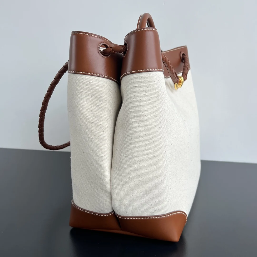 Bv Canvas and Leather Andiamo Bag 786194. Natural-colored calfskin paired with canvas is stunning! It has a standout feel . Combining exquisite craftsmanship with carefully selected materials, it is durable while offering an extremely soft touch. The brass metal knot leather-woven shoulder strap allows for multiple carrying options, suitable for various occasions. It s lightweight and exudes a relaxed, lazy vibe, and feels gentler than full leather when carried . Dimensions: 42x35x18.