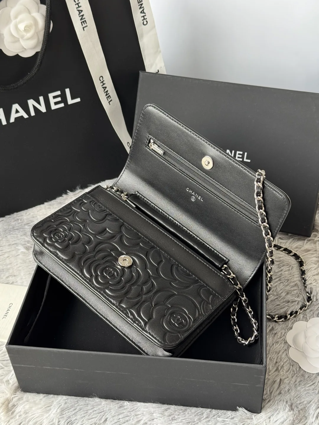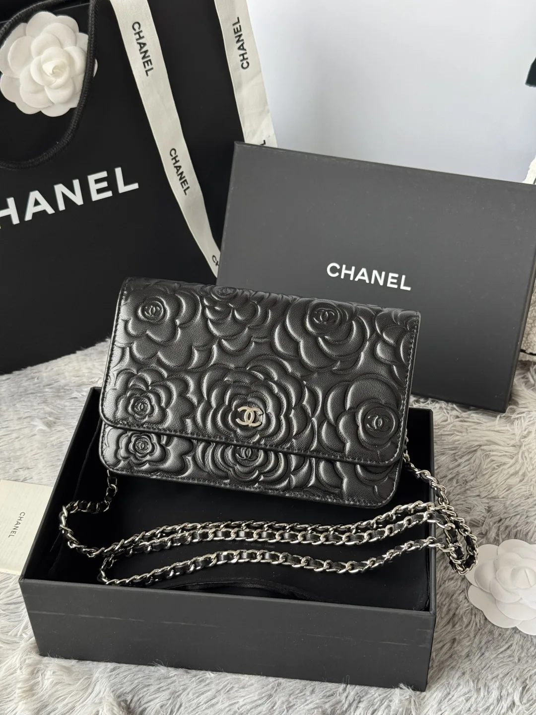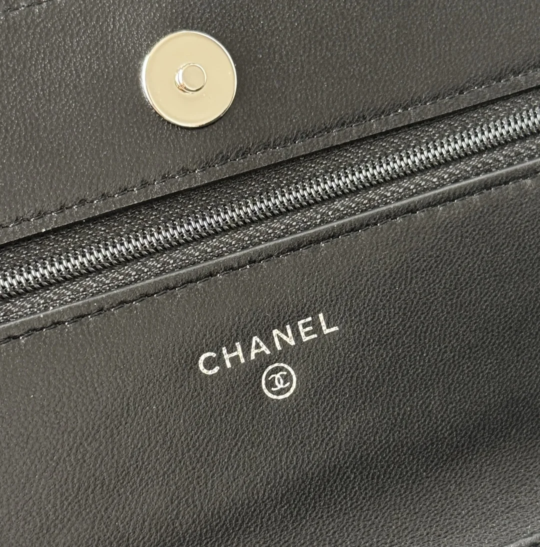 Chanel Camellia WOC Wallet On Chain Magnetic Closure Lambskin 0577A Classic Camellia Crossbody Small Bag In Stock Lambskin, Black Gold Hardware, Silver Hardware, Style Code: AP0250..
