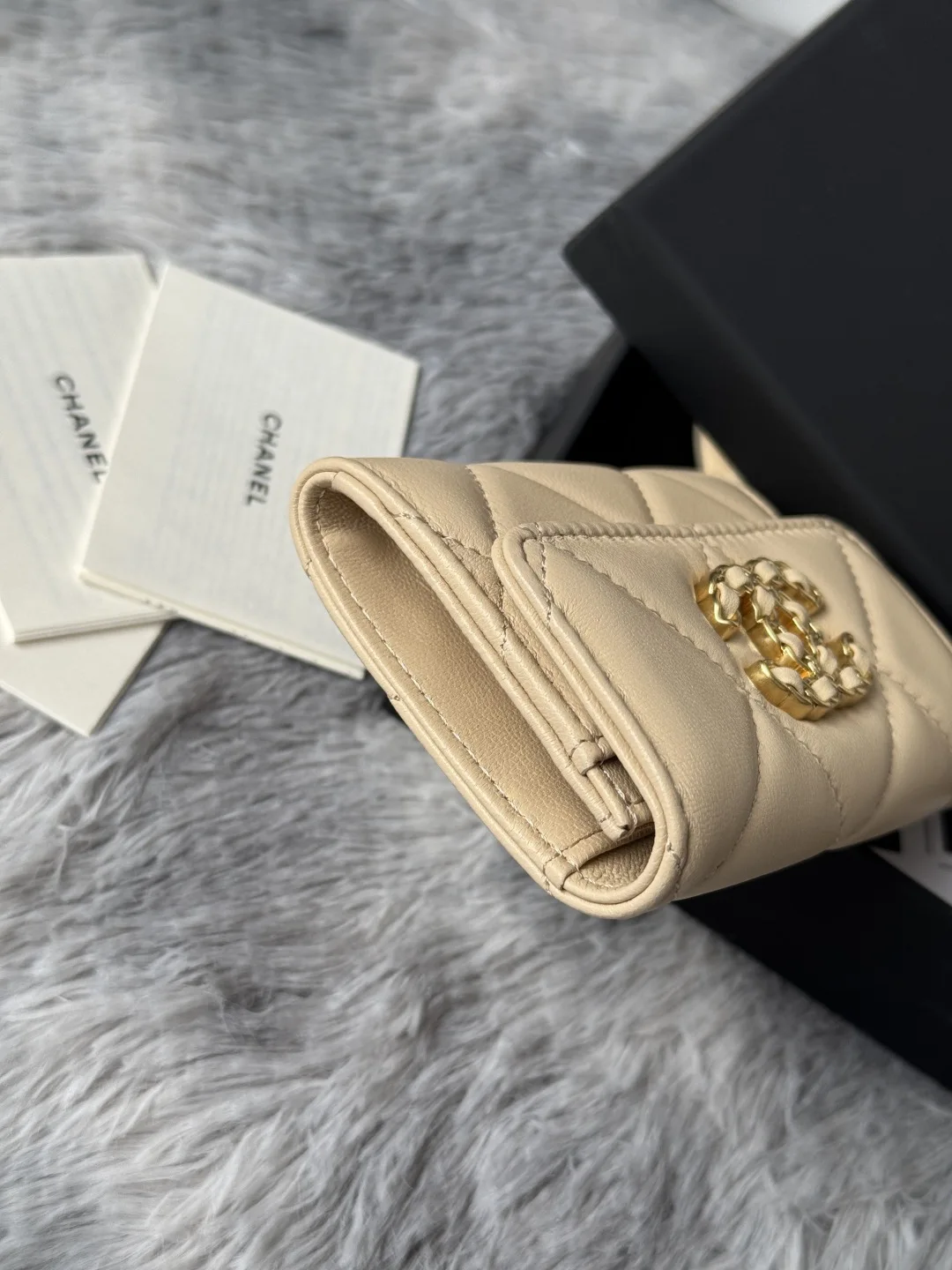 The latest CHANEL flap coin purse features the newest logo paired with large diamond quilting. Crafted from imported lambskin and vintage hardware, this cardholder offers ample spa..