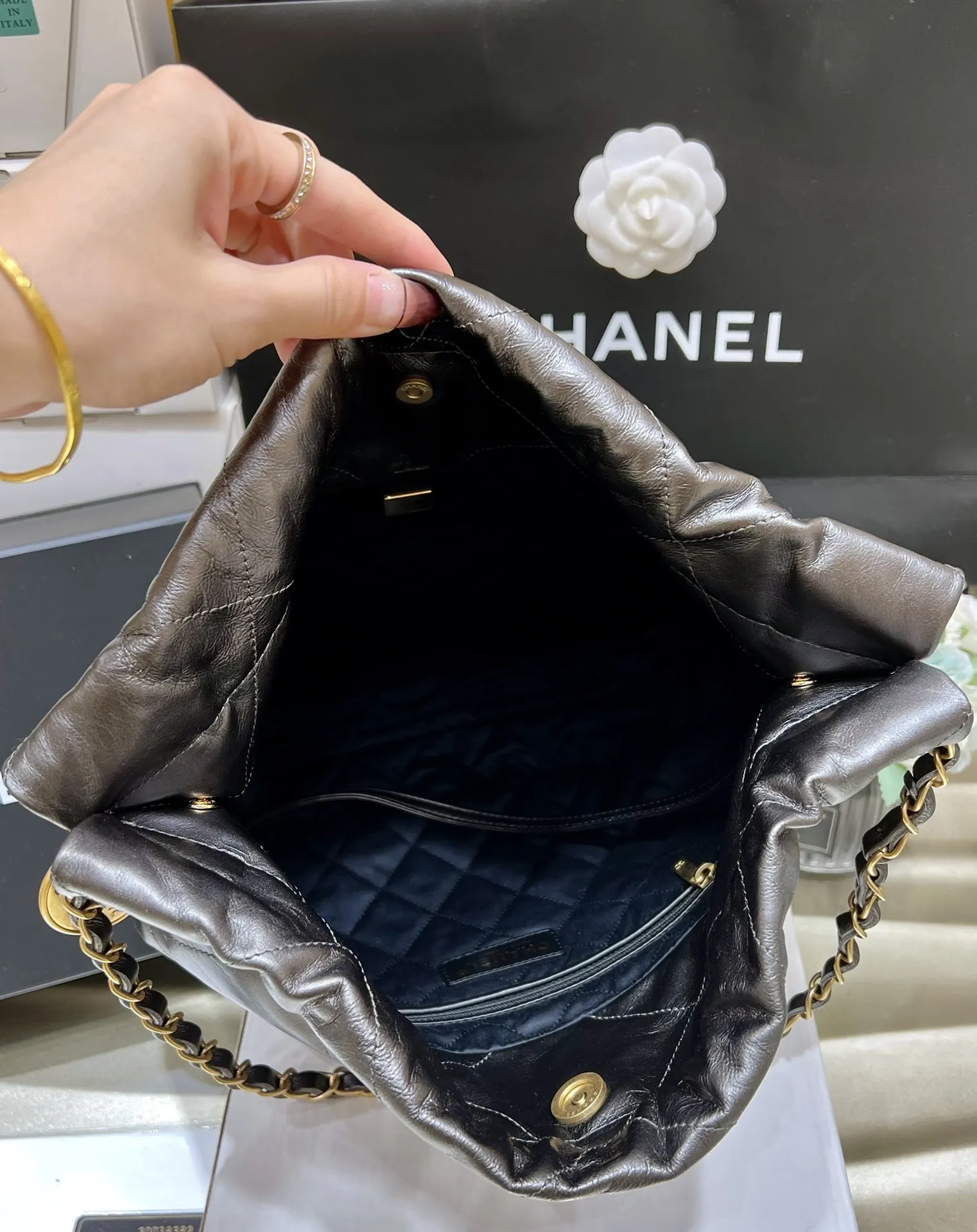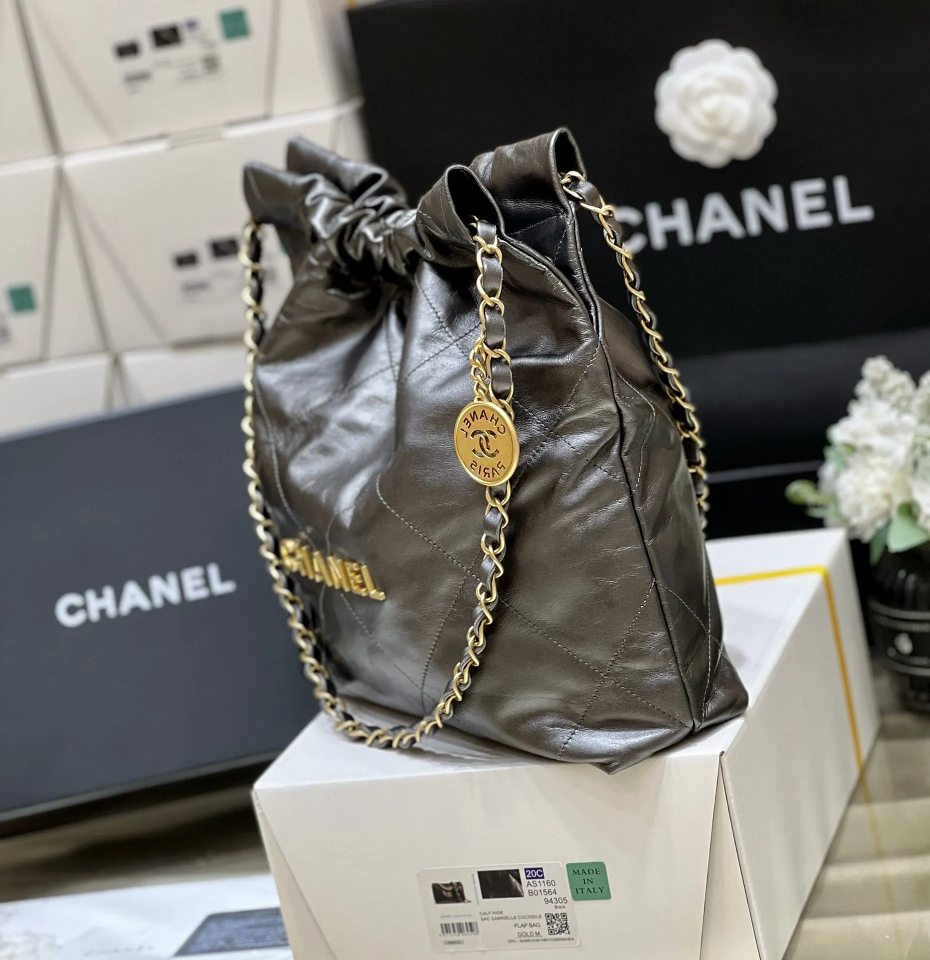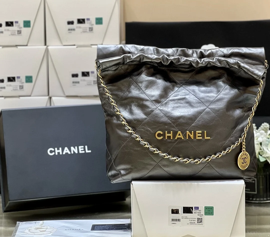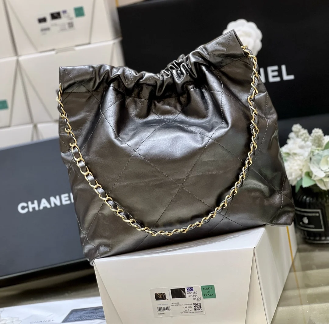 23C Early Spring Resort Collection 22BAG Trash Bag in White with Black Thread is now in stock! It s absolutely stunning! A true showstopper! Heavy-hitting goods have arrived! I m captivated by the new white thread! Get ready for another frenzy of must-have items This Trash Bag carries a unique significance, as it s a luxury item with a purely numerical name! This 22 is crafted from square-quilted, original factory-sourced calfskin, the perfect material to achieve that effortlessly chic look. It s also easy to maintain, unlike the delicate lambskin some initially expected. Design-wise: No one can resist the allure of the Chanel logo. The classic leather-woven chain is adorned with a vintage coin, adding a touch of sweetness! Inside, there s a detachable pouch for storing small items, and magnetic closures on both sides to secure the opening. The capacity is incredibly spacious and practical! Small AS3260 (35x37x7cm), Medium AS3261 (39 42 8cm).