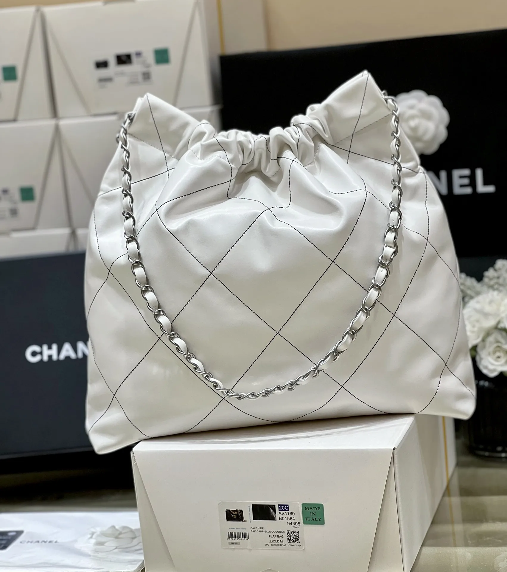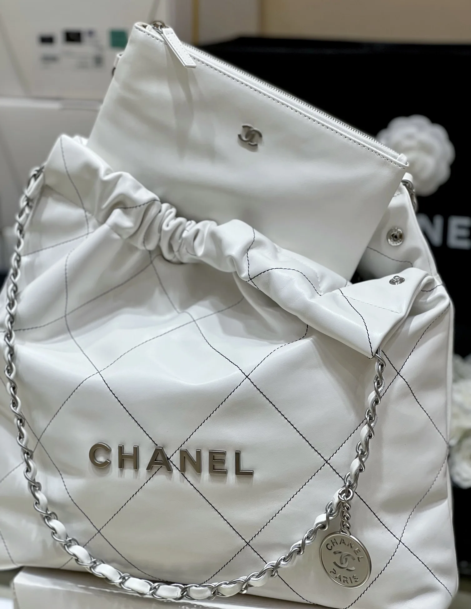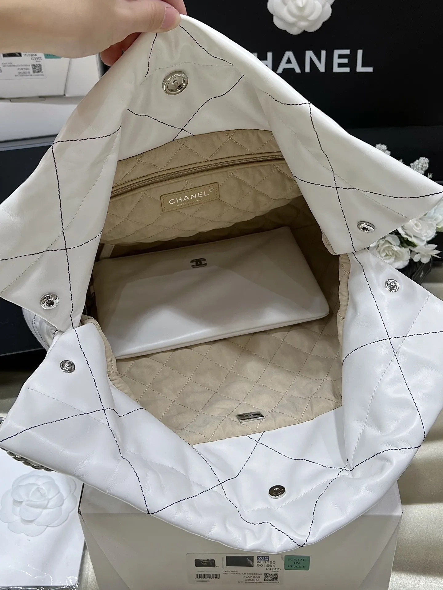 23C Early Spring Resort Collection 22BAG Trash Bag in White with Black Thread is now in stock! It s absolutely stunning! A true showstopper! Heavy-hitting goods have arrived! I m captivated by the new white thread! Get ready for another frenzy of must-have items This Trash Bag carries a unique significance, as it s a luxury item with a purely numerical name! This 22 is crafted from square-quilted, original factory-sourced calfskin, the perfect material to achieve that effortlessly chic look. It s also easy to maintain, unlike the delicate lambskin some initially expected. Design-wise: No one can resist the allure of the Chanel logo. The classic leather-woven chain is adorned with a vintage coin, adding a touch of sweetness! Inside, there s a detachable pouch for storing small items, and magnetic closures on both sides to secure the opening. The capacity is incredibly spacious and practical! Small AS3260 (35x37x7cm), Medium AS3261 (39 42 8cm).