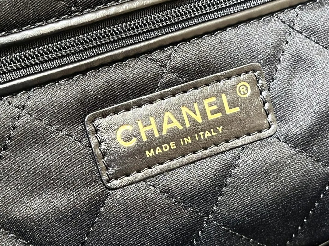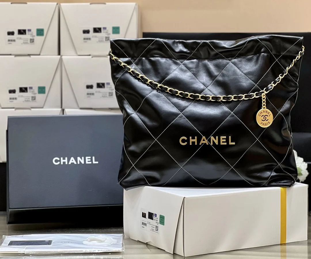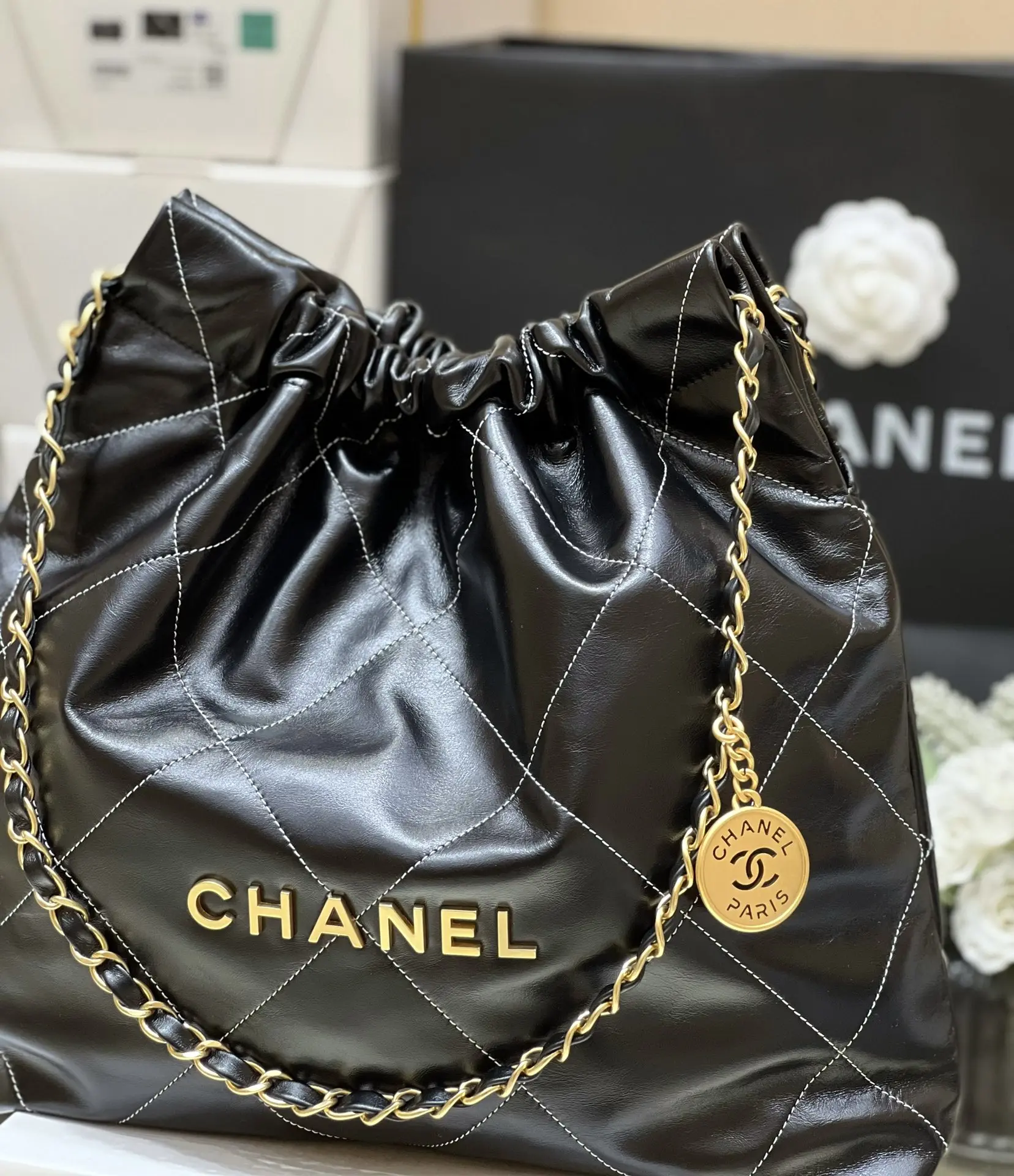 23C Early Spring Resort Collection 22BAG Trash Bag in Black with White Stitching is now in stock! It s absolutely stunning! A true showstopper! Heavy-hitting goods have arrived! I m captivated by the new white stitching! Get ready for another frenzy of must-have items This trash bag carries a unique significance, as it s a luxury item with a purely numerical name! This 22 is crafted from original factory square-grained calfskin, the perfect material to achieve that effortlessly chic look. It s also very easy to care for, unlike the delicate lambskin some initially expected. Design-wise: No one can resist the allure of the Chanel logo. The classic leather-woven chain is adorned with a vintage coin, adding a touch of sweetness! Inside, there s a detachable pouch for storing small items, and magnetic closures on both sides to secure the opening. The capacity is incredibly spacious and practical! Small AS3260 (35x37x7cm), Medium AS3261 (39 42 8cm).