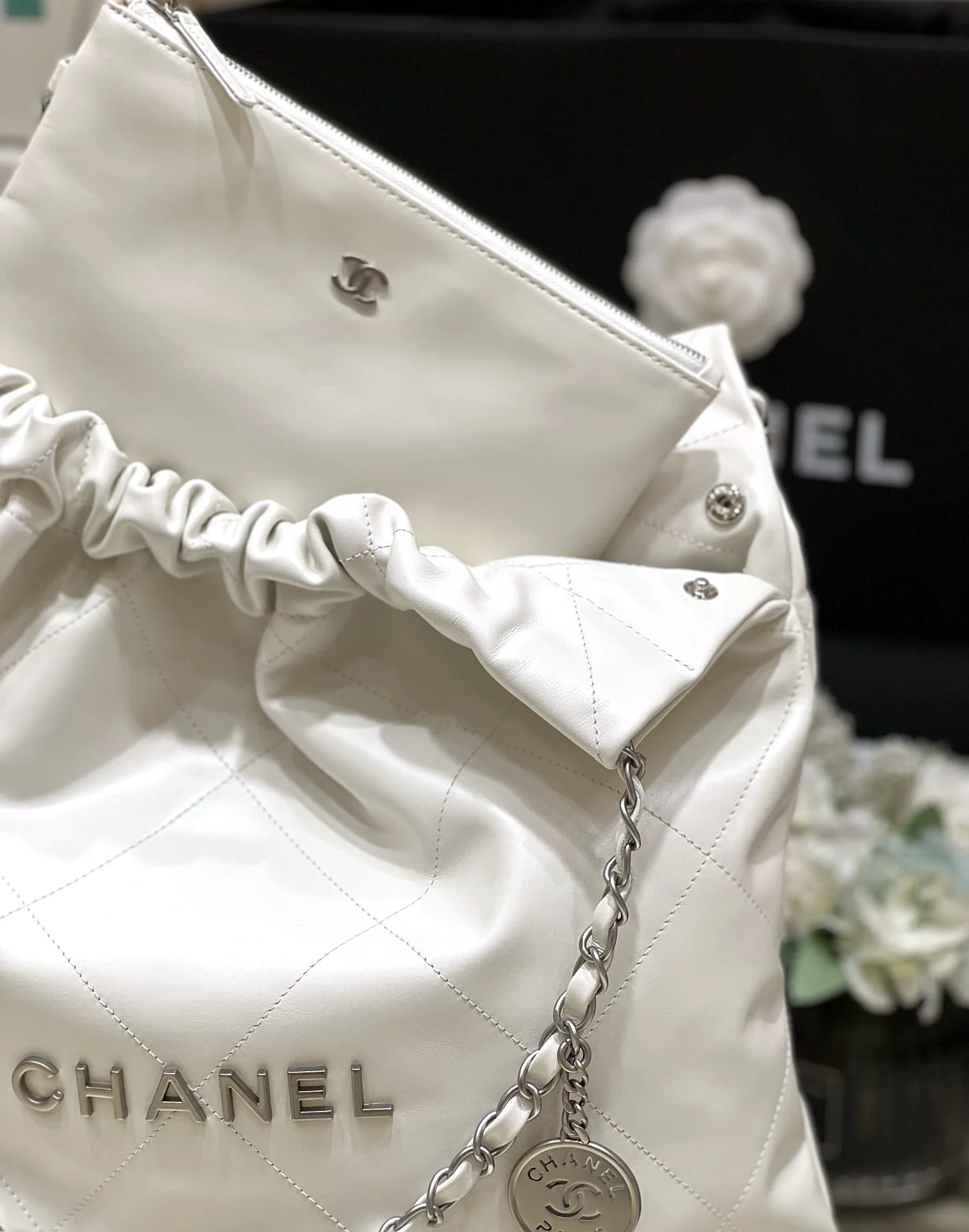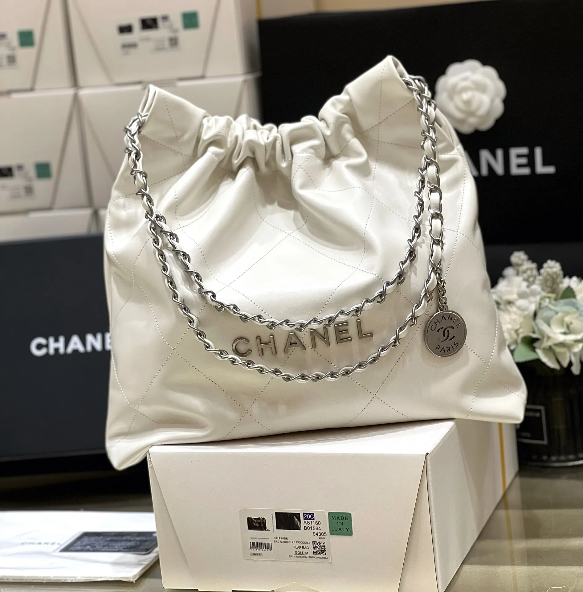 Authentic Medium White with Antique Silver 2022cc Spring Summer Hottest 22 Bag Trash Bag Medium Size, Purchased for 37000, Exclusive Original Factory Square Frame Calfskin, This Se..