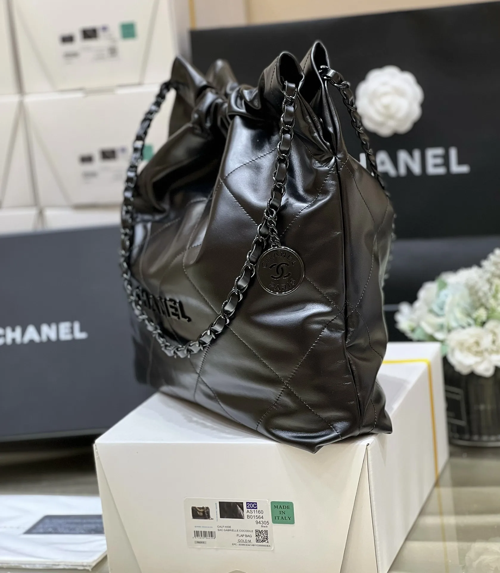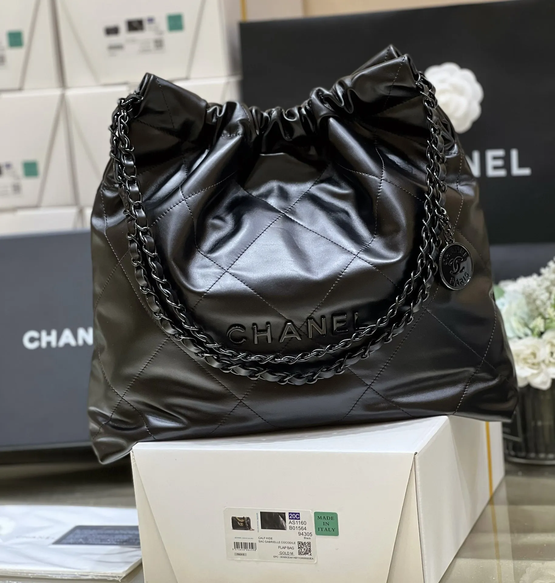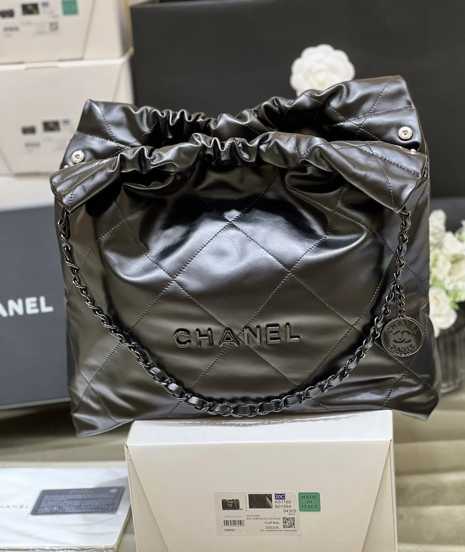 Authentic development of new color for pure original medium 22k trash bag, no color difference black leather paired with gun-tone hardware, an absolutely perfect match. Authentic m..