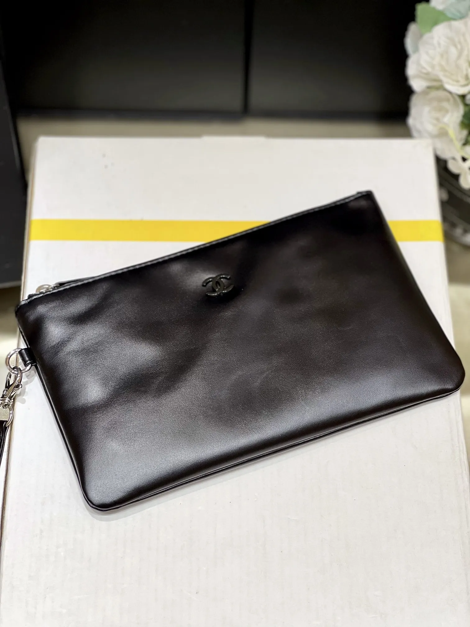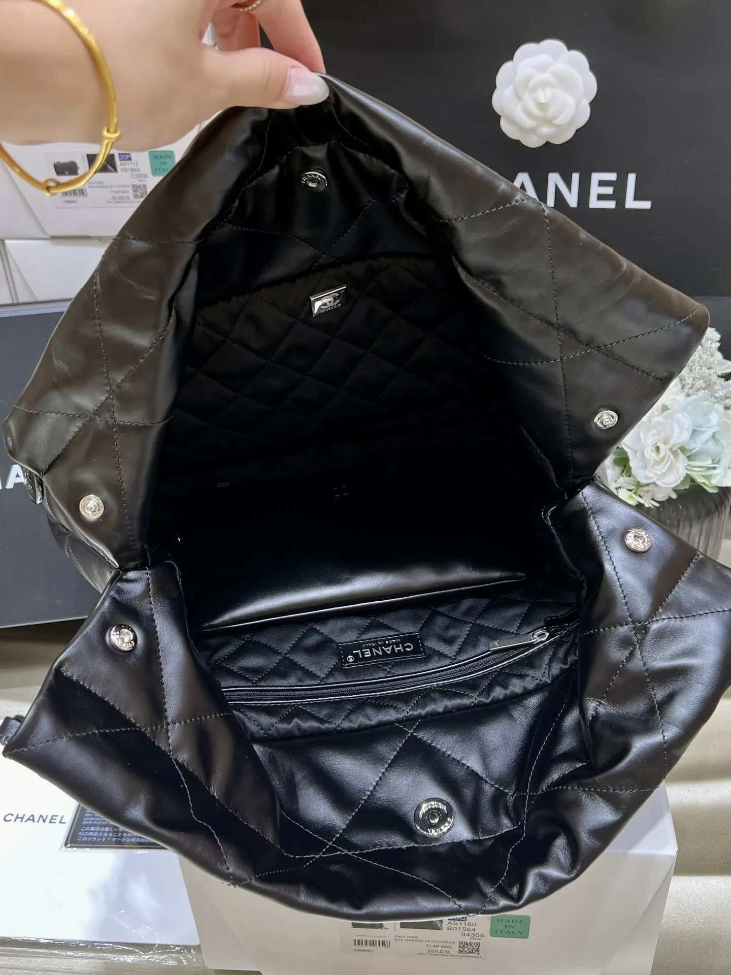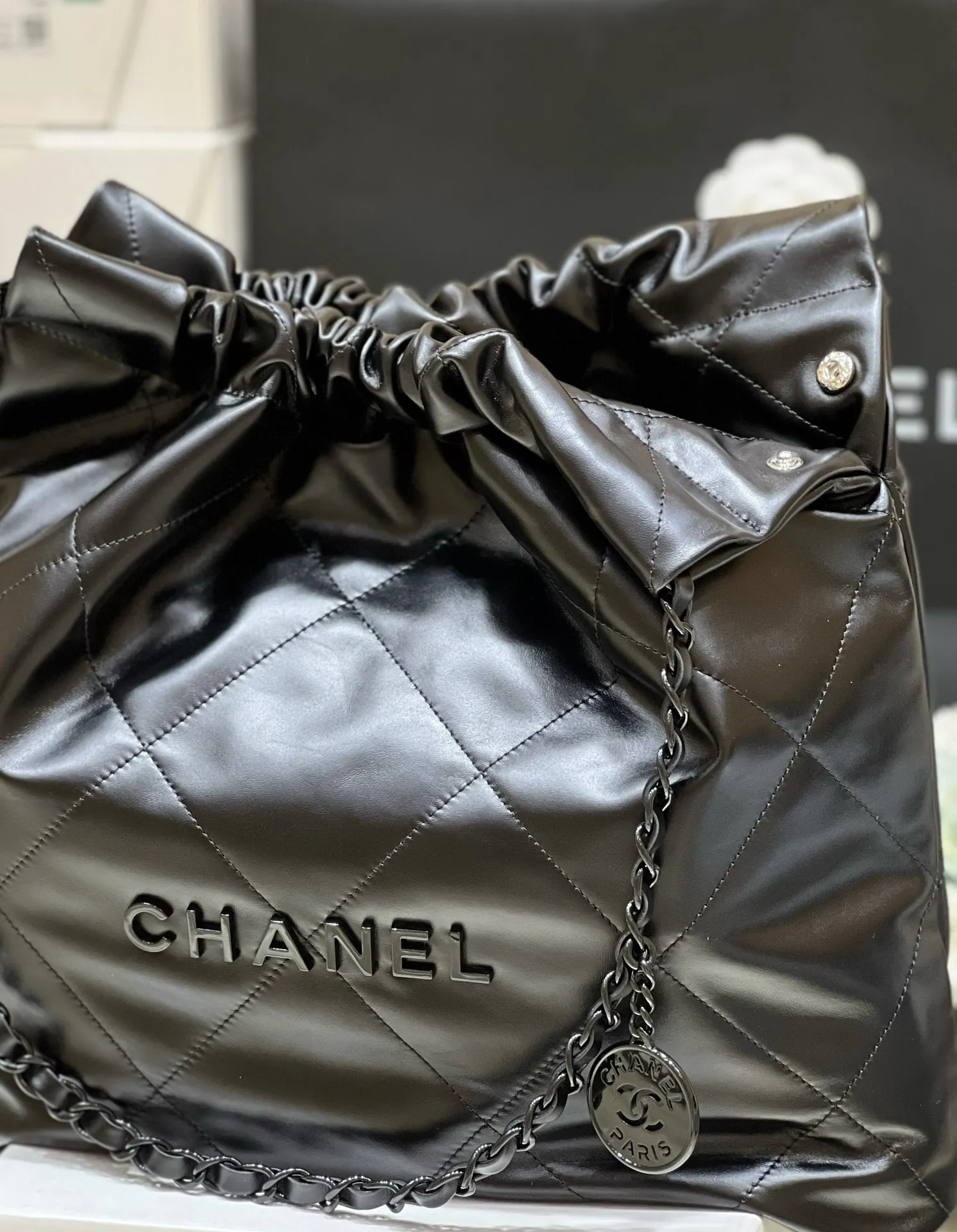 Authentic development of new color for pure original medium 22k trash bag, no color difference black leather paired with gun-tone hardware, an absolutely perfect match. Authentic m..