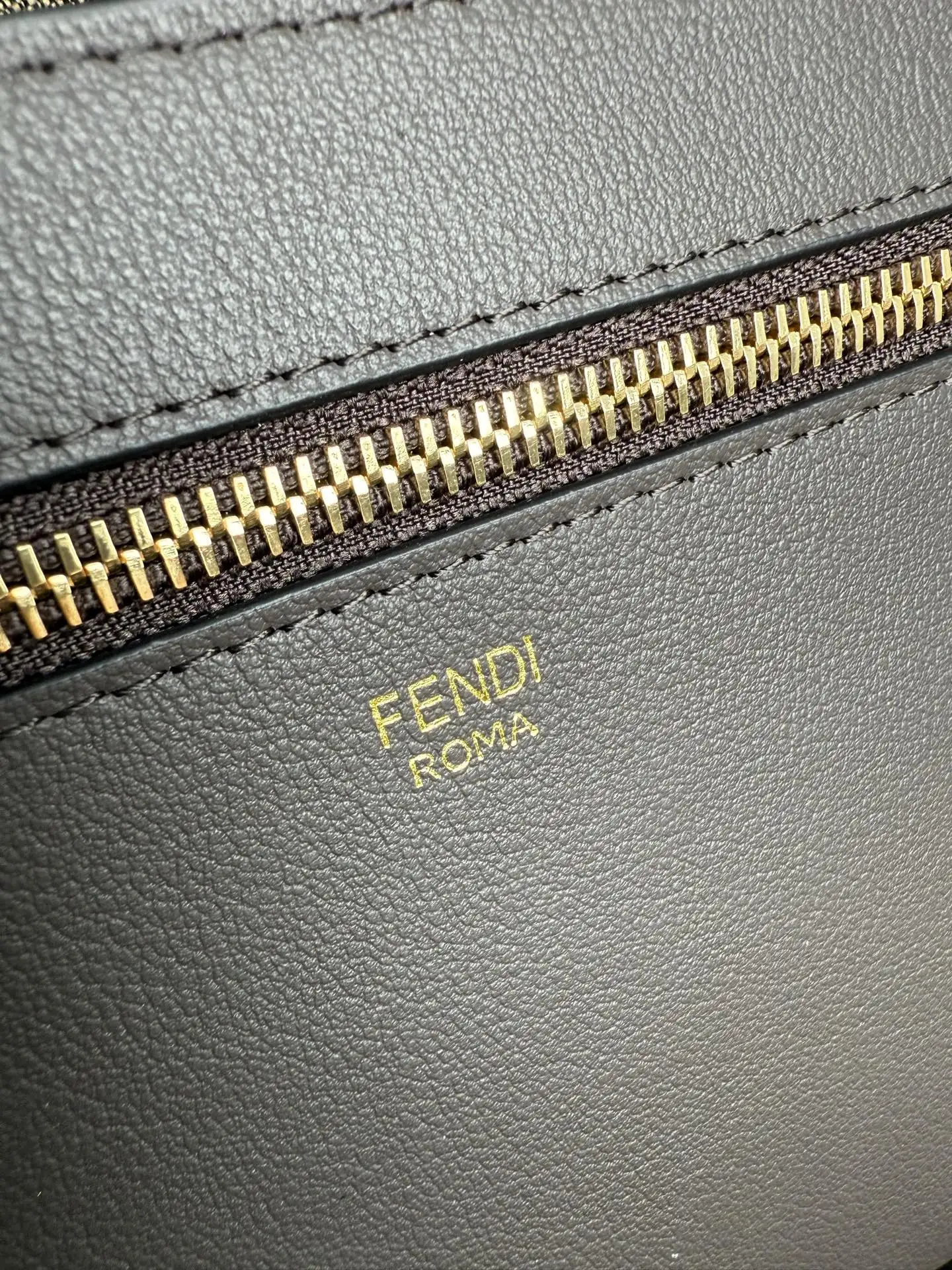 Brown calfskin handles for carrying by hand or on the shoulder, decorated with hand-stitched large visible stitching, representing the classic Selleria craftsmanship originating from 1925 and passed down through generations of FENDI artisans. Made in Italy.