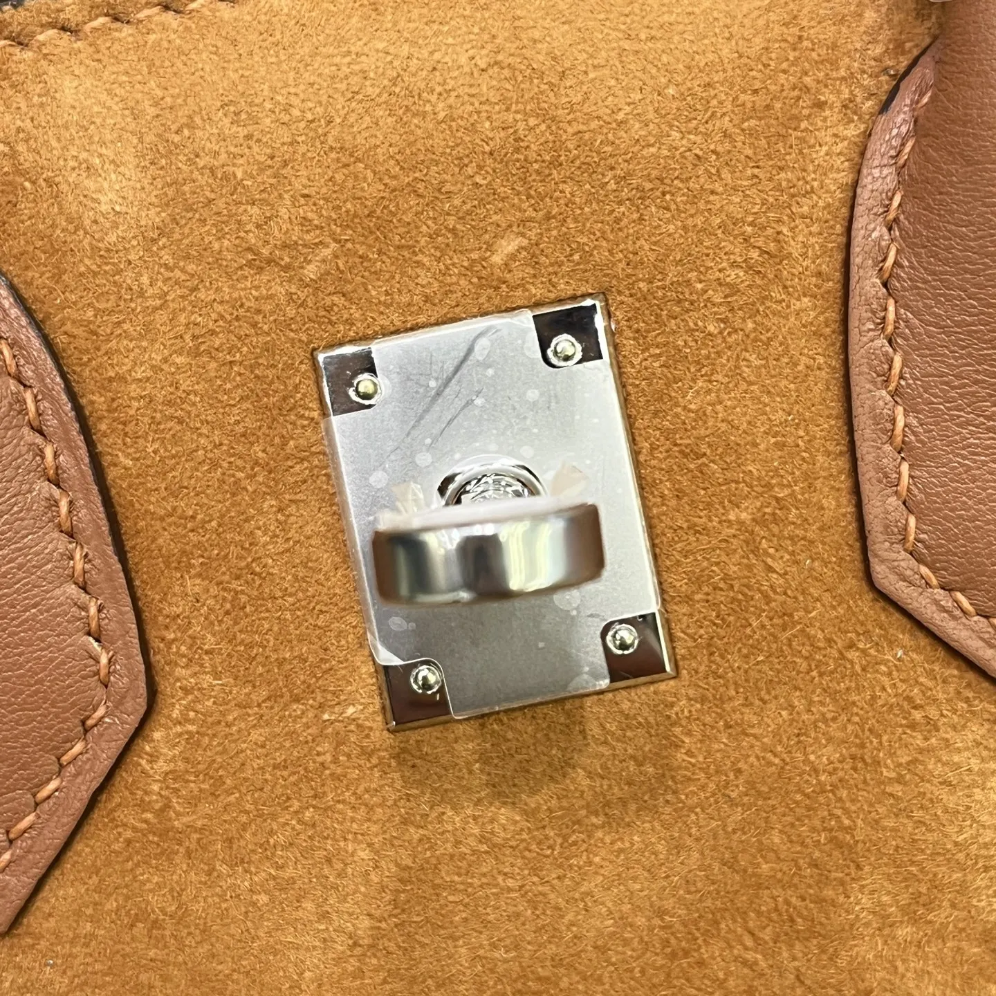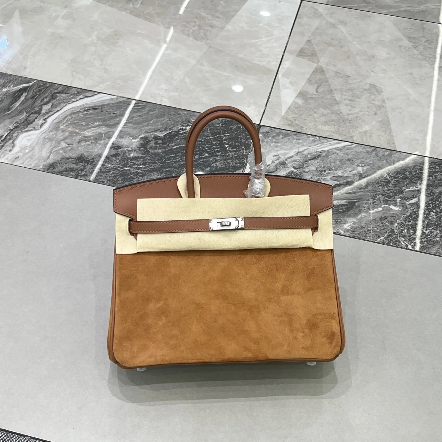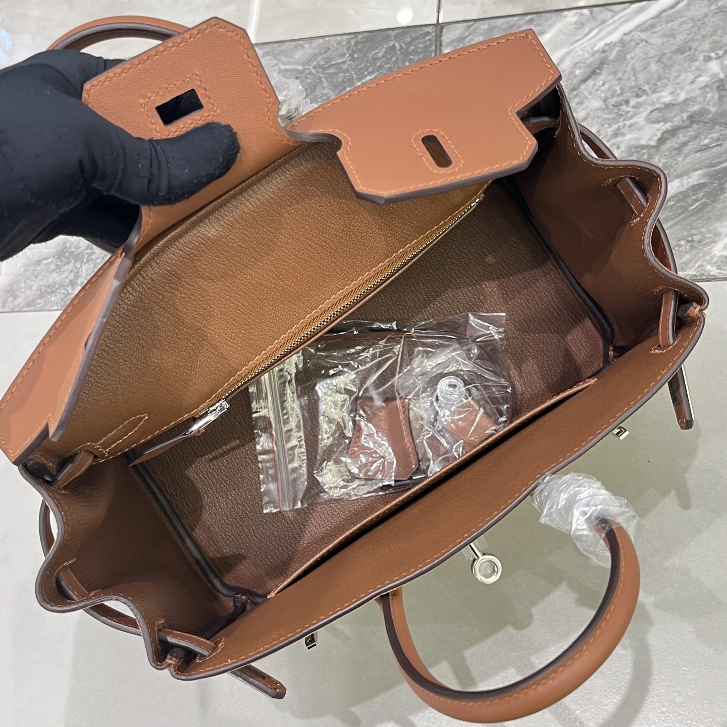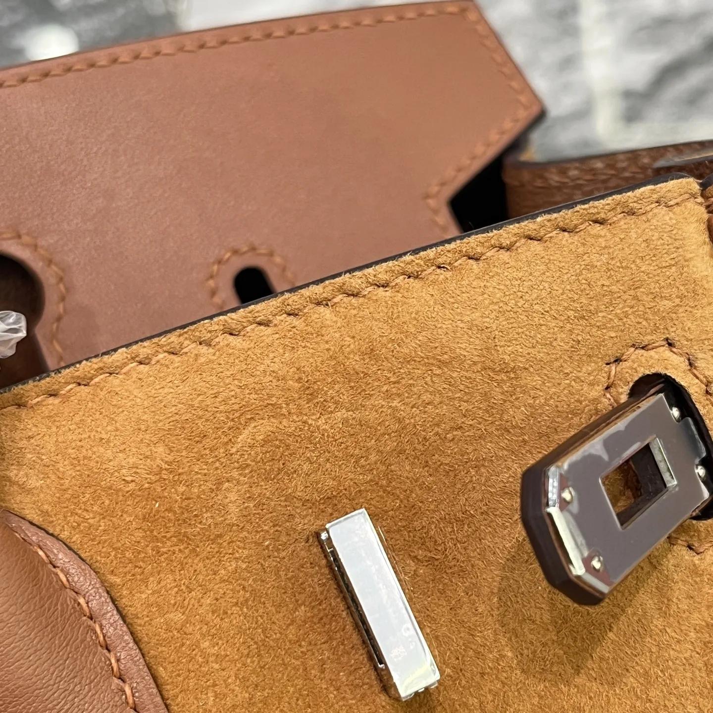 Birkin 25 Gold Brown with Silver Hardware Swift Leather Suede Lining in Goatskin Hand-stitched with Waxed Thread, Hand-hammered Copper Nails, All-Steel Hardware