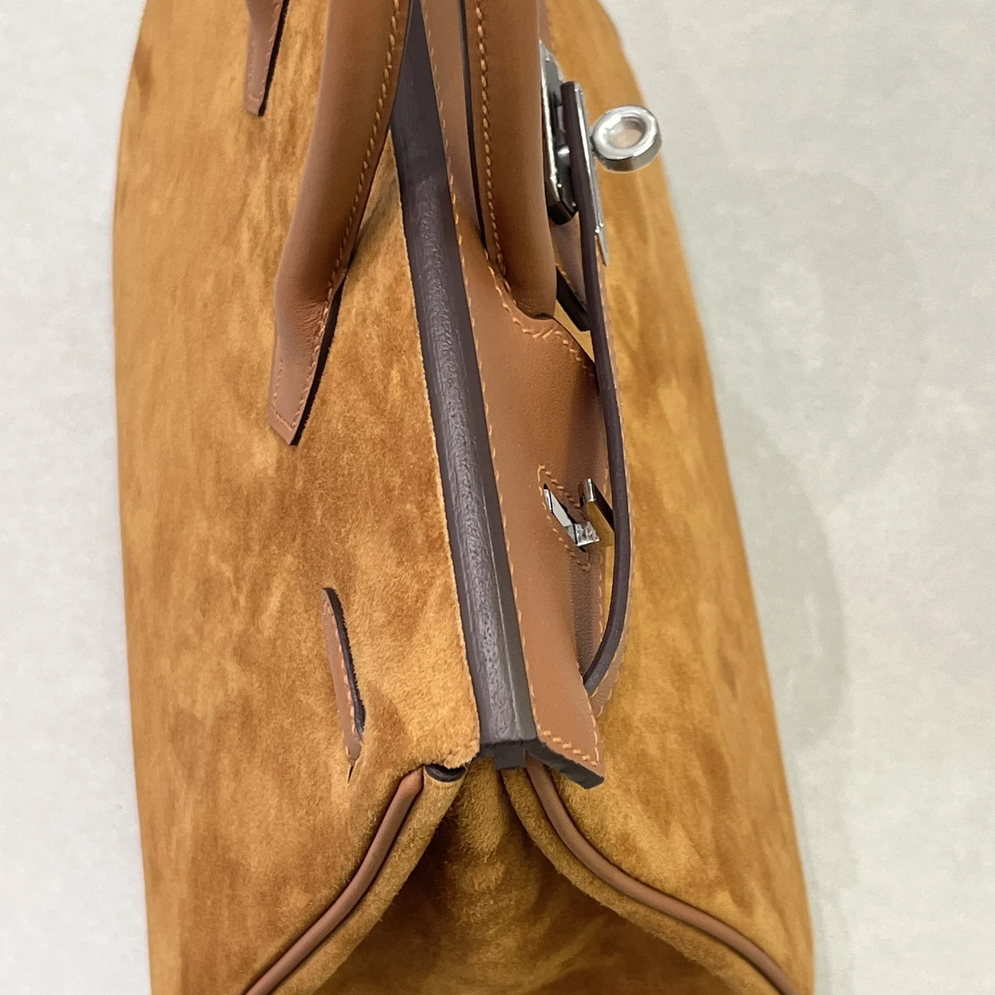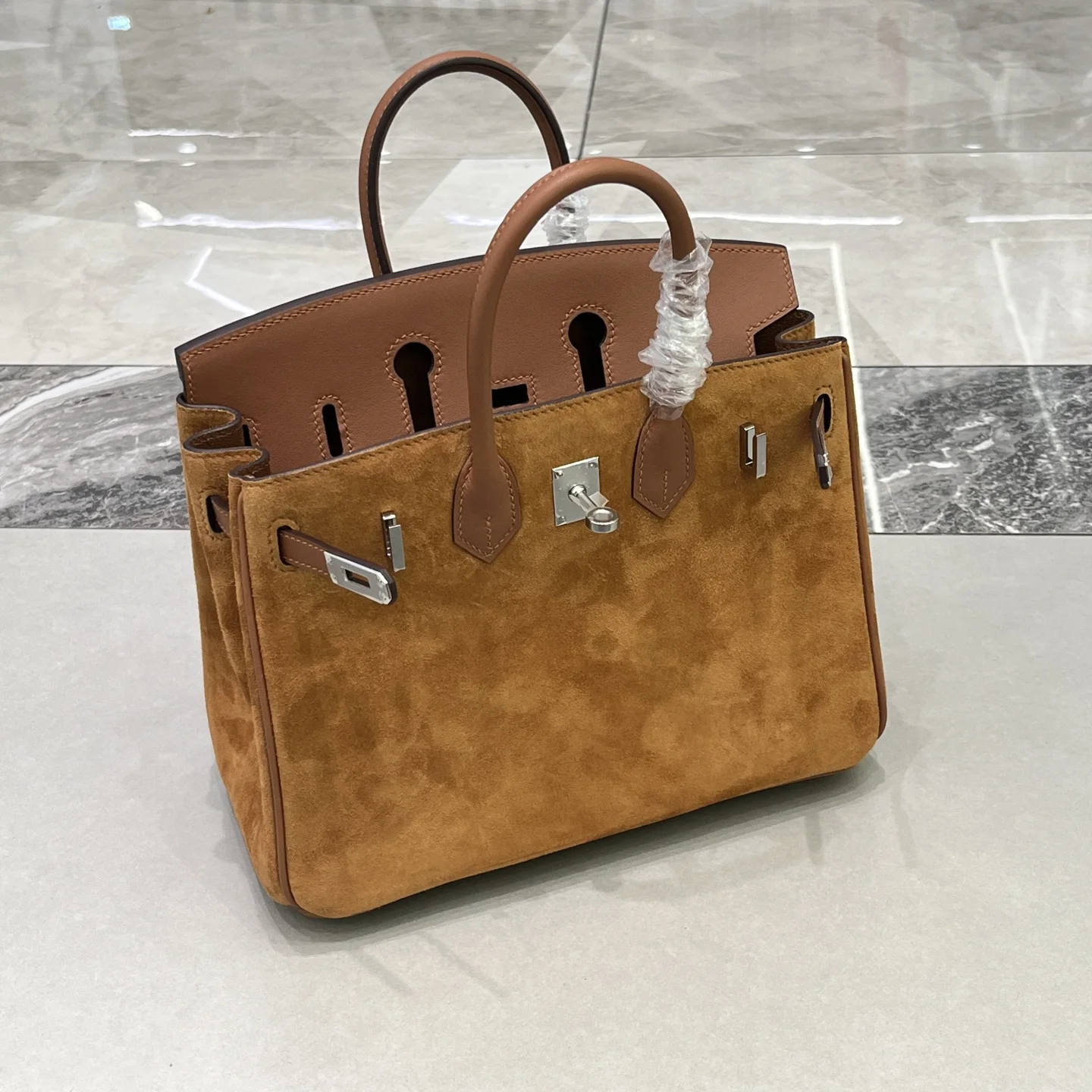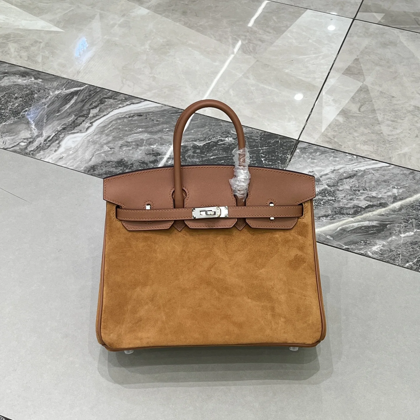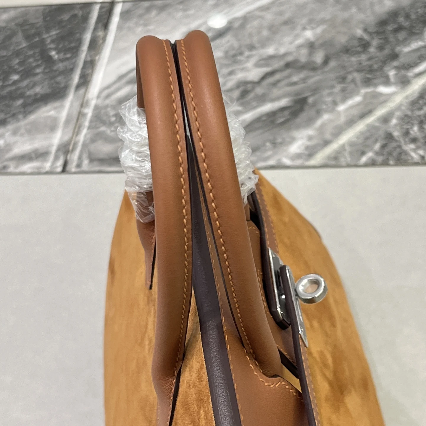 Birkin 25 Gold Brown with Silver Hardware Swift Leather Suede Lining in Goatskin Hand-stitched with Waxed Thread, Hand-hammered Copper Nails, All-Steel Hardware