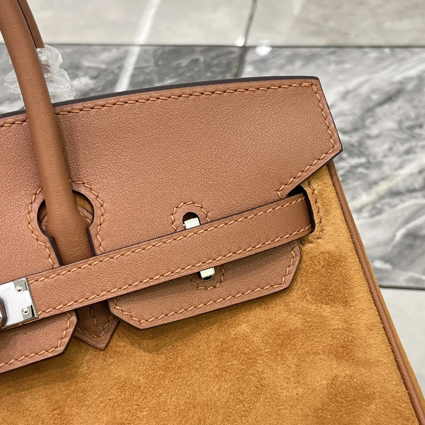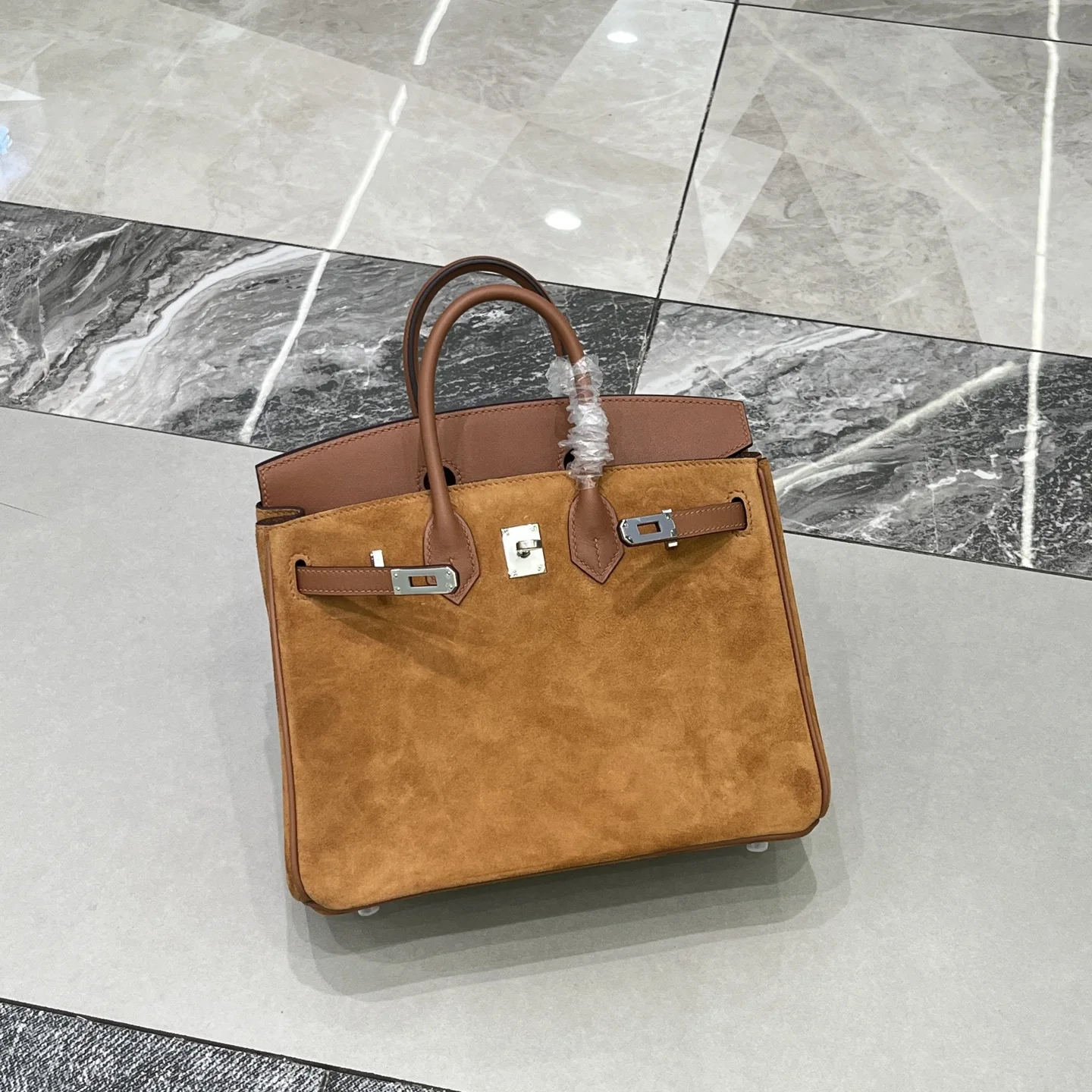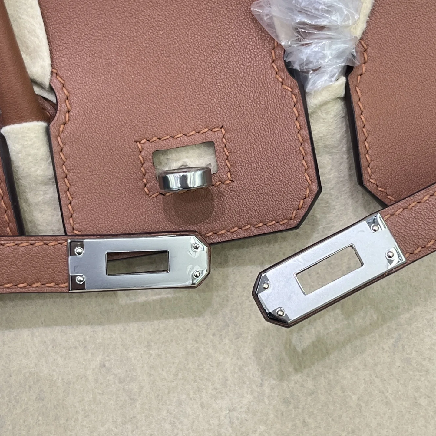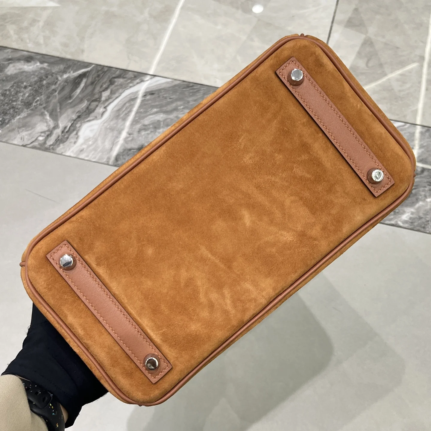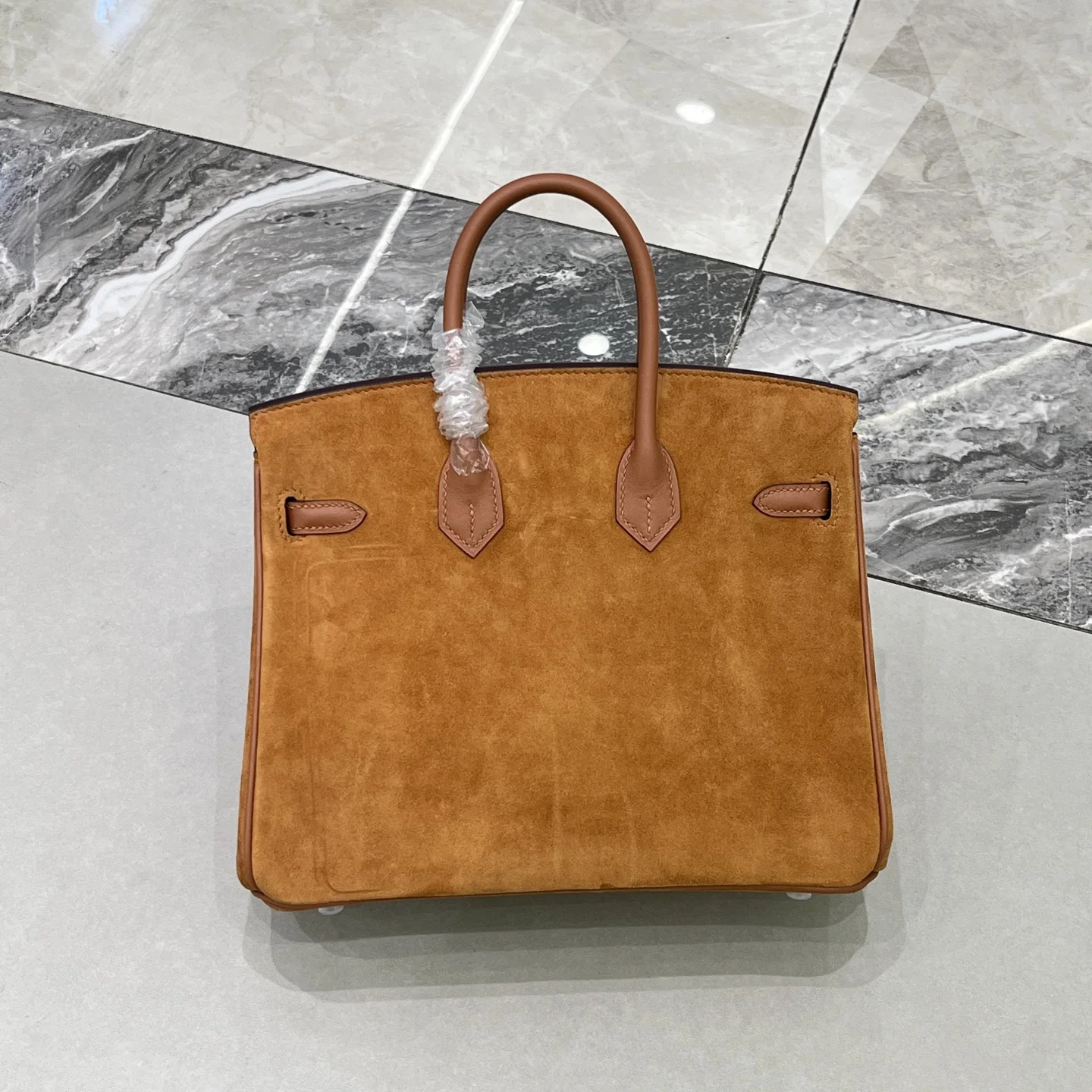 Birkin 25 Gold Brown with Silver Hardware Swift Leather Suede Lining in Goatskin Hand-stitched with Waxed Thread, Hand-hammered Copper Nails, All-Steel Hardware