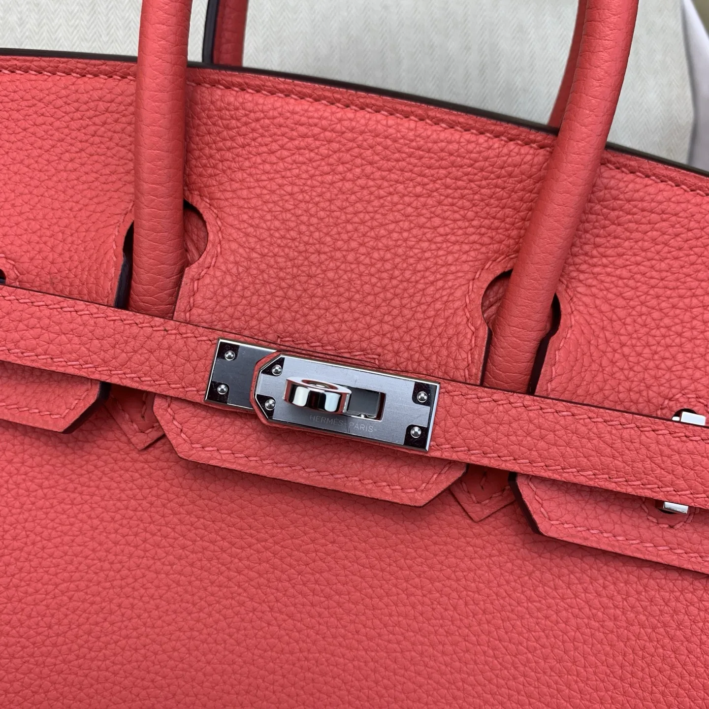 In stock: Birkin 25cm Togo Watermelon Red with Silver Hardware. The classic and timeless code of elegance. The Togo leather texture is exceptional, feeling like calfskin to the tou..