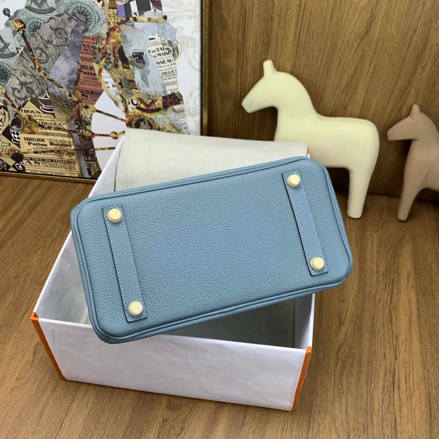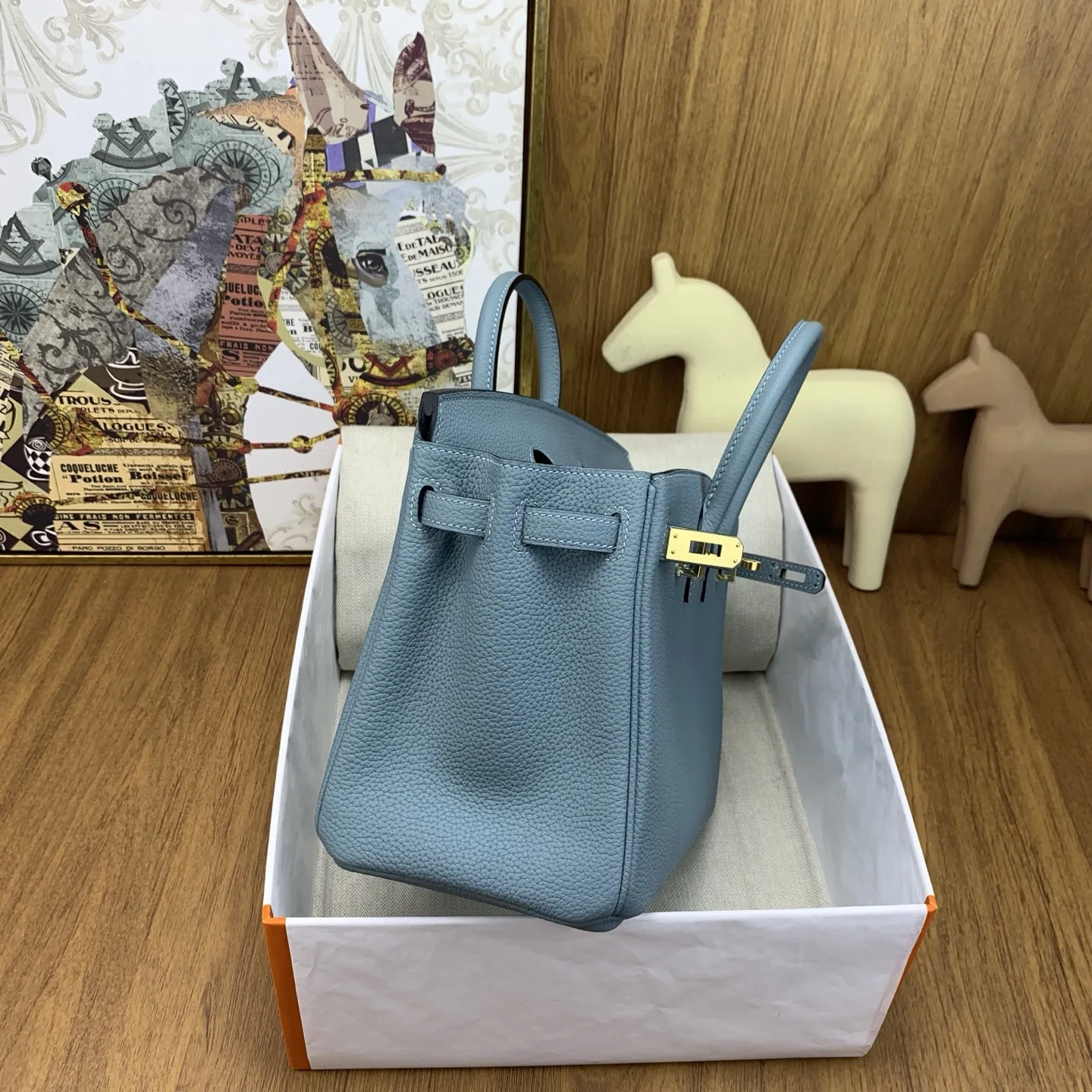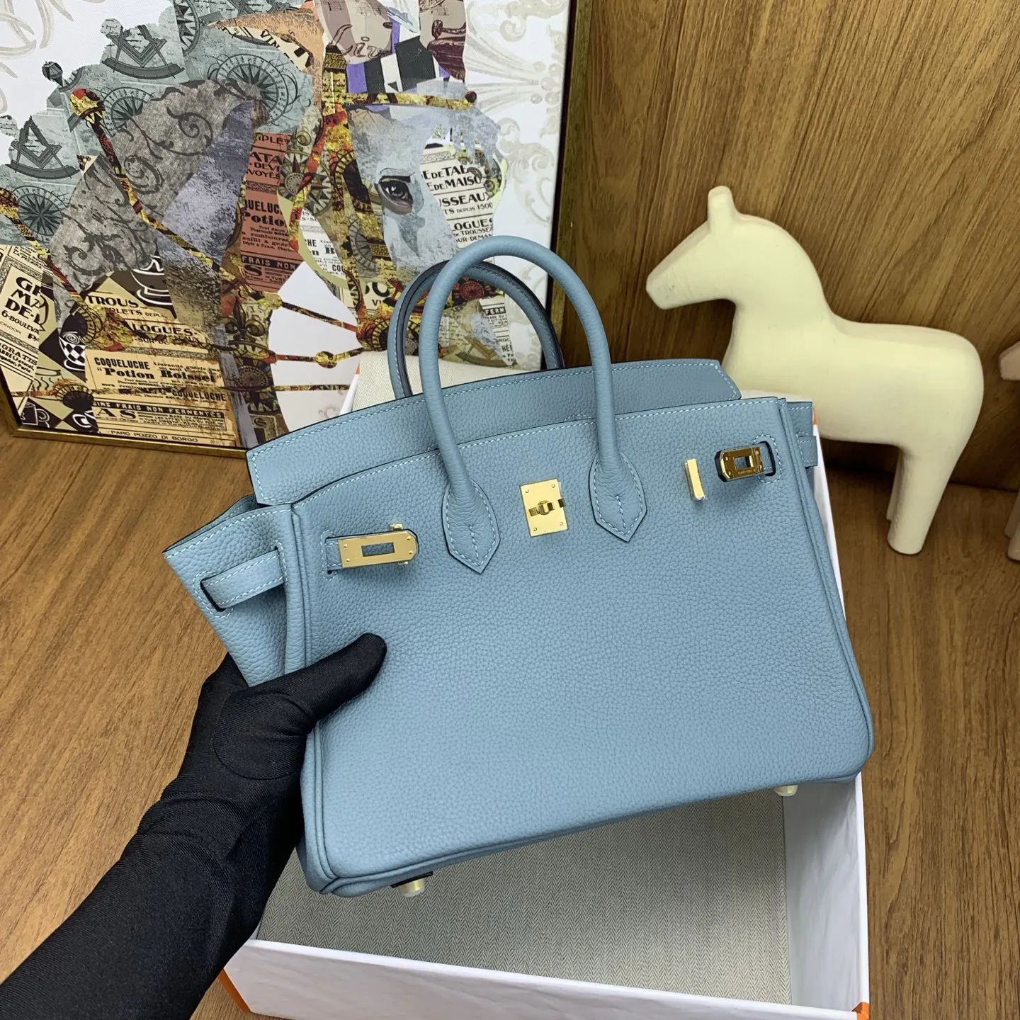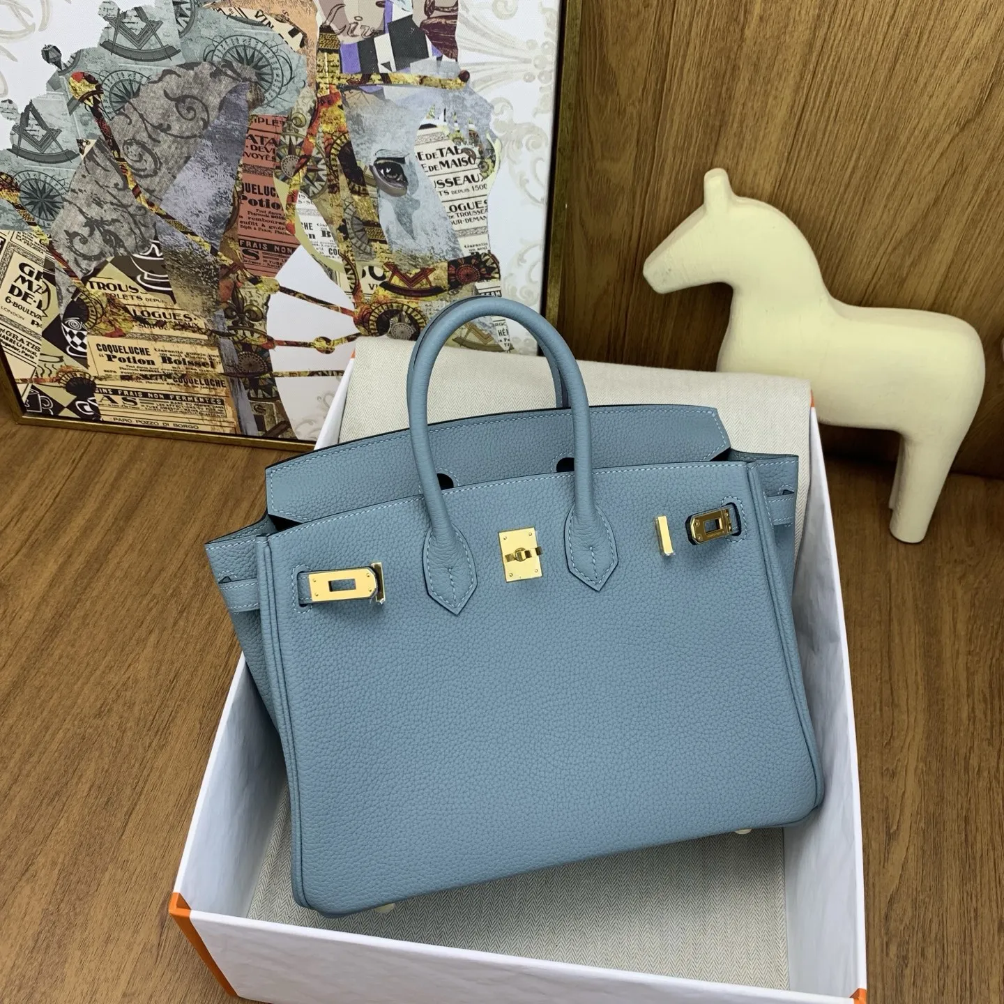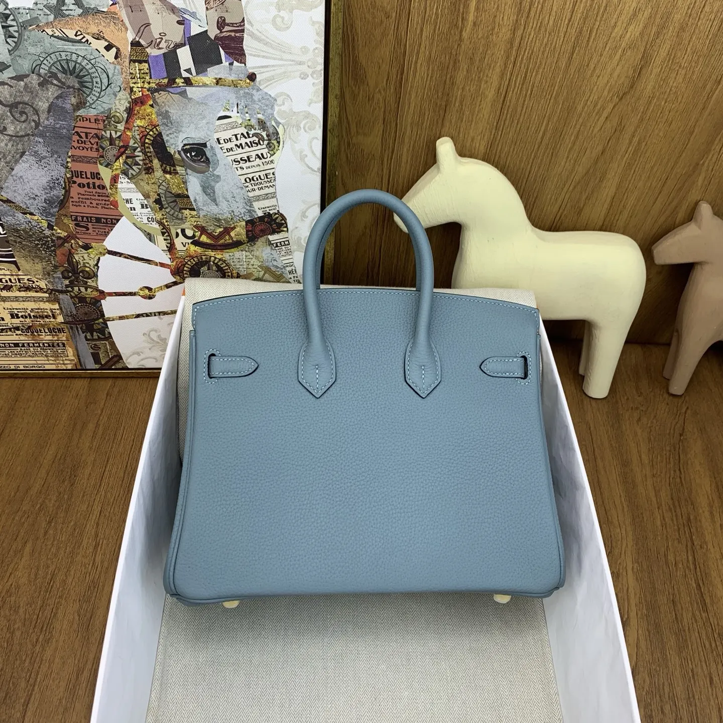 In stock Birkin 25cm togo 7G Ciel with silver hardware the timeless code of elegance. The Togo leather is of exceptional quality, feeling like calfskin to the touch, and develops a beautiful sheen with use. It exudes a natural air of sophistication, adding an air of luxury to any outfit. It s perfect for the office with a suit, or for a relaxed yet stylish look with a hoodie. It s also a showstopper at evening events. The Birkin is truly captivating at first sight and a lifelong treasure. Owning one is an experience like no other, a true soulmate in the world of handbags. We highly recommend adding owning a Birkin to your life s to-do list it s an investment you won t regret!