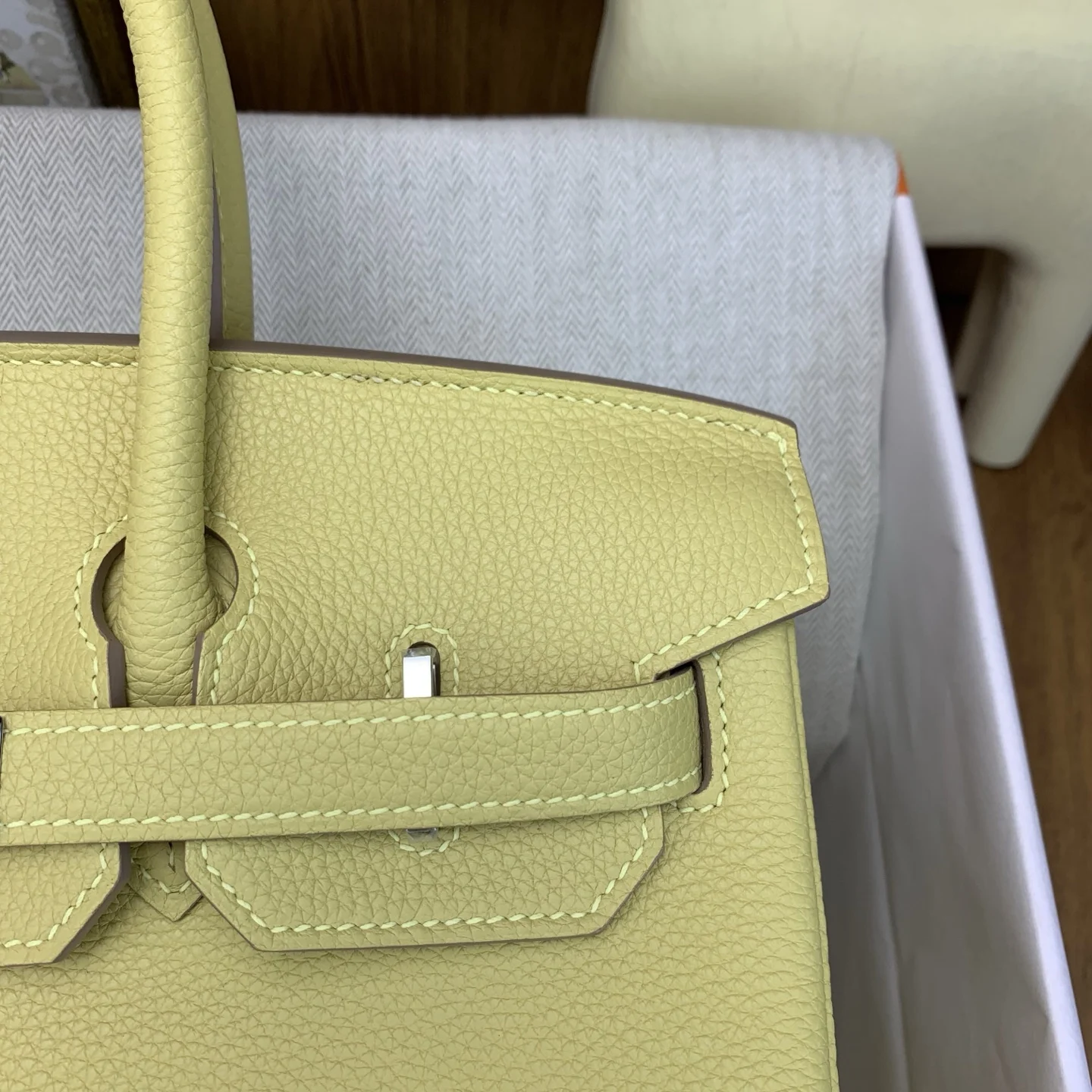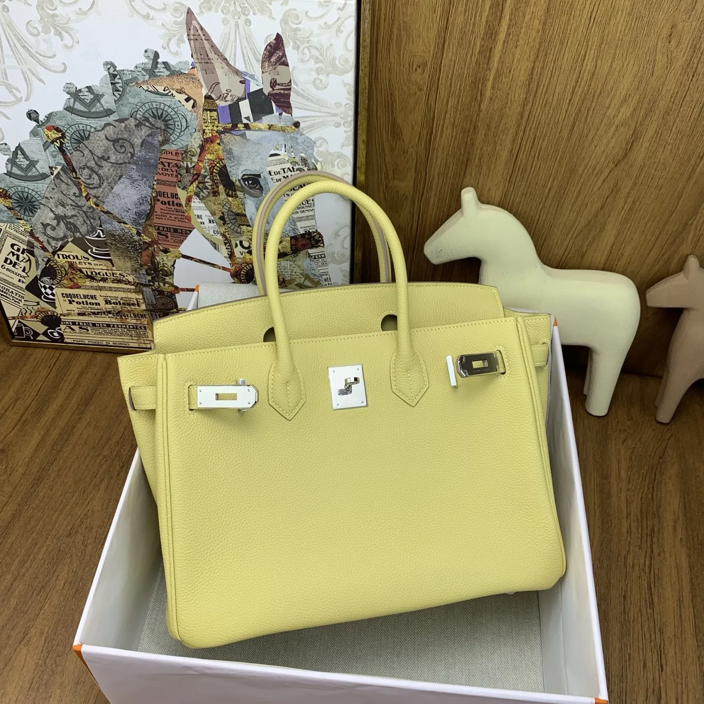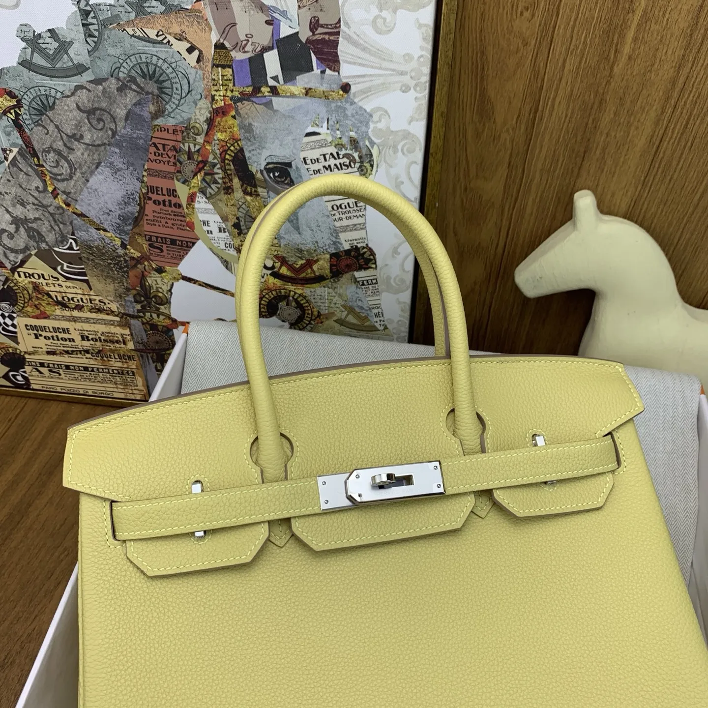 In stock Birkin 30cm togo lZ Jaune Poussin with silver hardware. The timeless elegance of Togo leather is unmatched, with a texture that feels like petting calfskin and develops ..