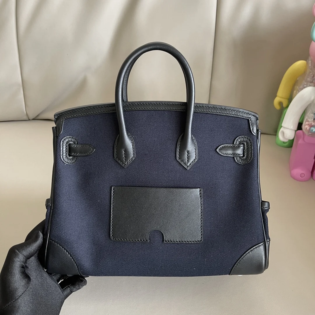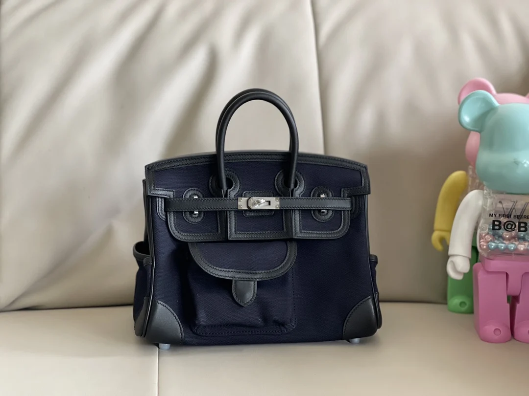 New Platinum Cargo Series, Size 25, Swift Leather combined with Canvas, Deep Blue, Silver Hardware, European and American Fashion, Synchronized with Boutique Wax Thread Sewing, All..