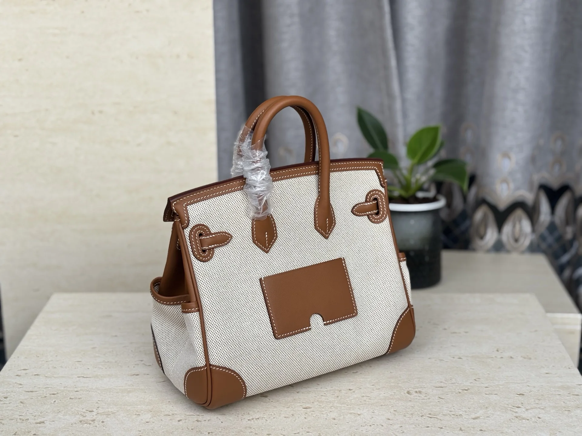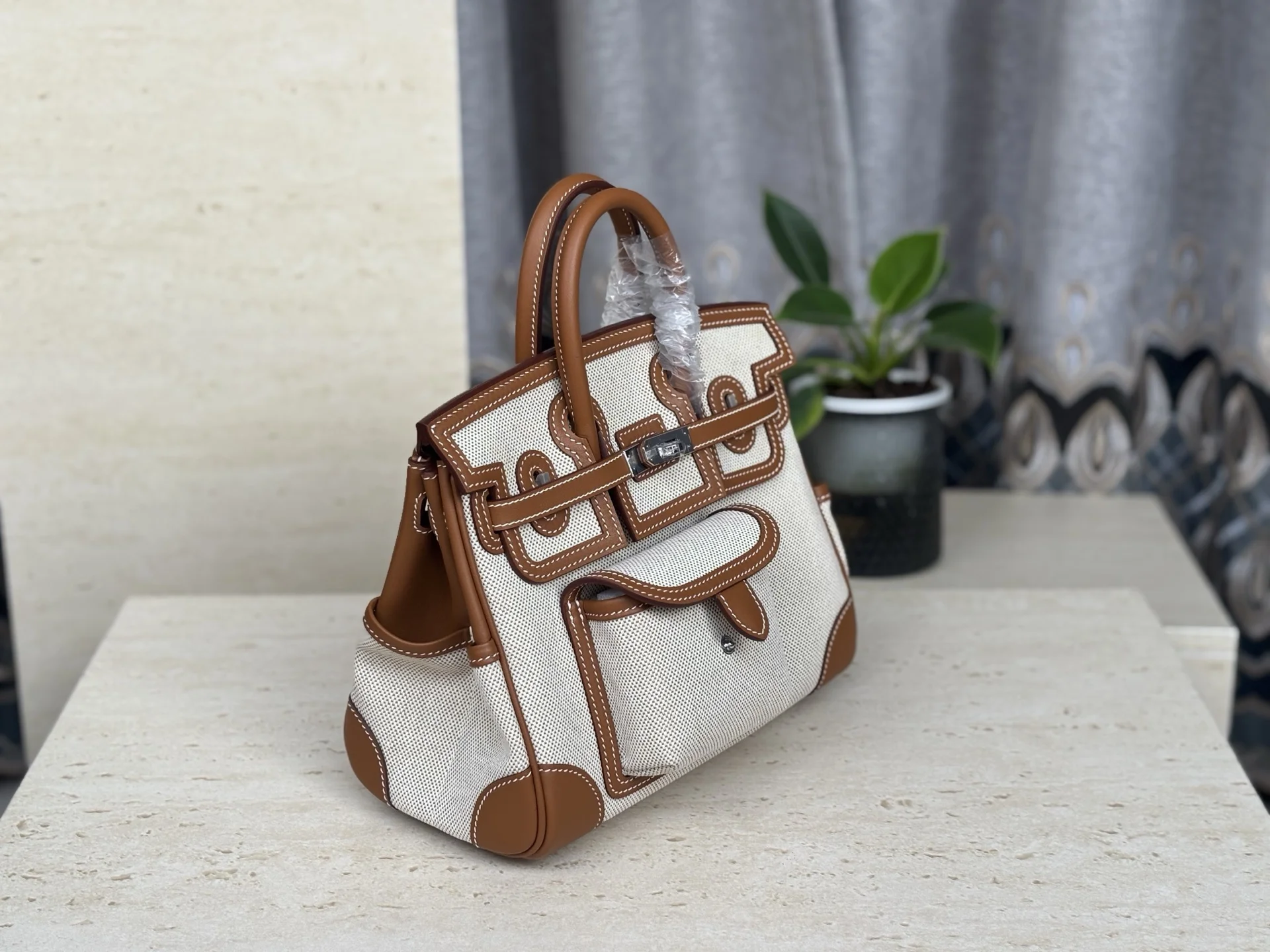 New Platinum Cargo Series, Size 25, Swift Leather combined with Canvas, Gold Brown, Silver Hardware, European and American Fashion, Synchronized with Boutique Wax Thread Sewing, A..