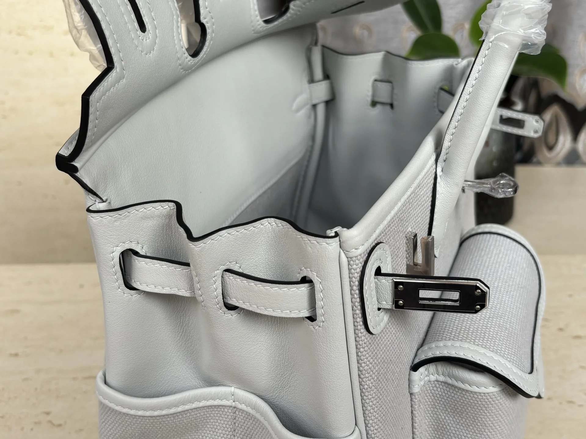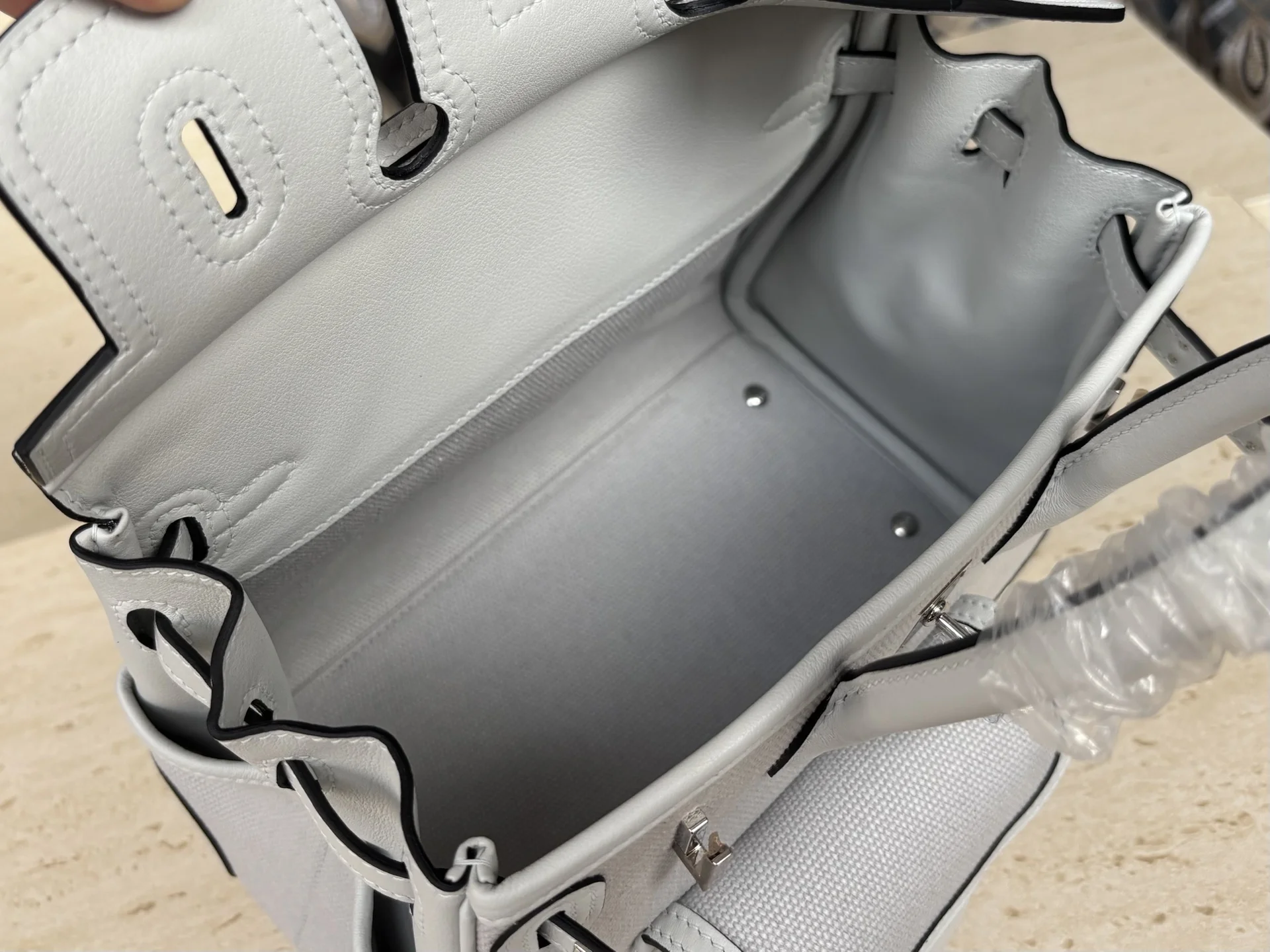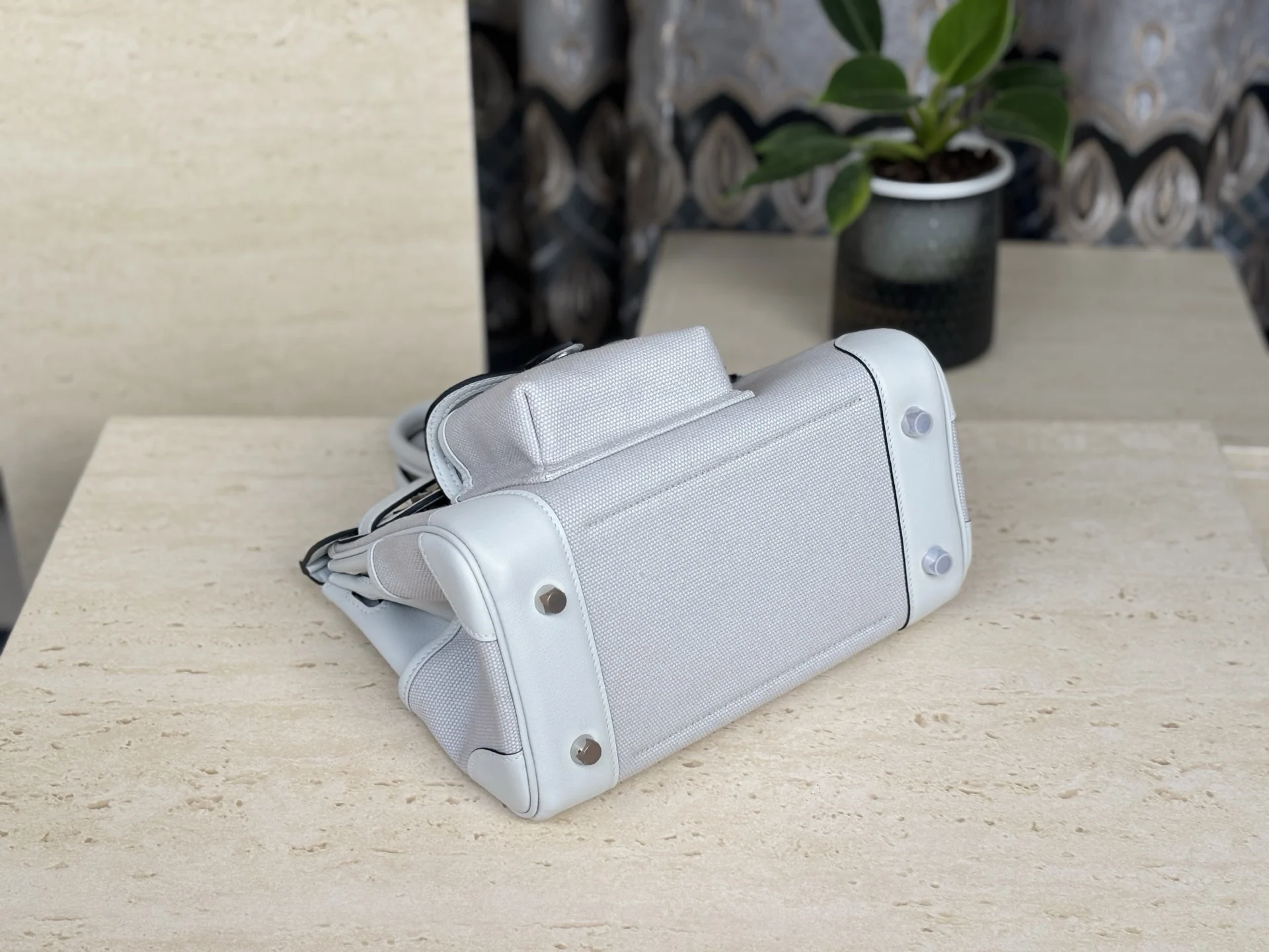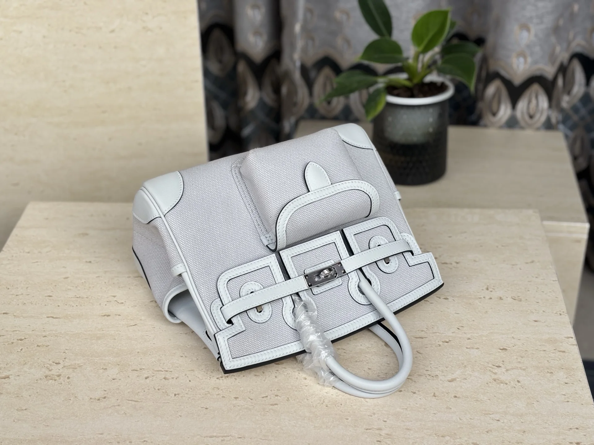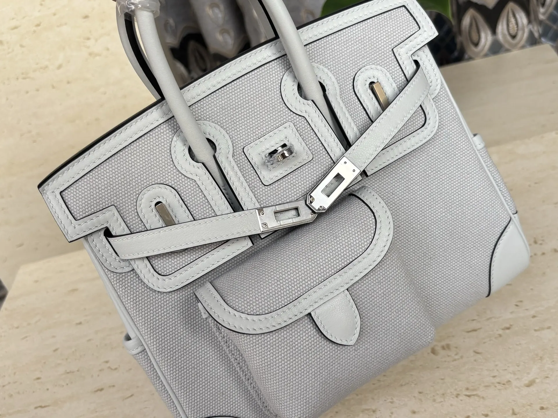 New Platinum Cargo Series, Size 25, Swift Leather combined with Canvas, Platinum Grey with Silver Hardware, European and American Fashion, Synchronized with Boutique Wax Thread Sewing, All-Steel Hardware, Private Customization
