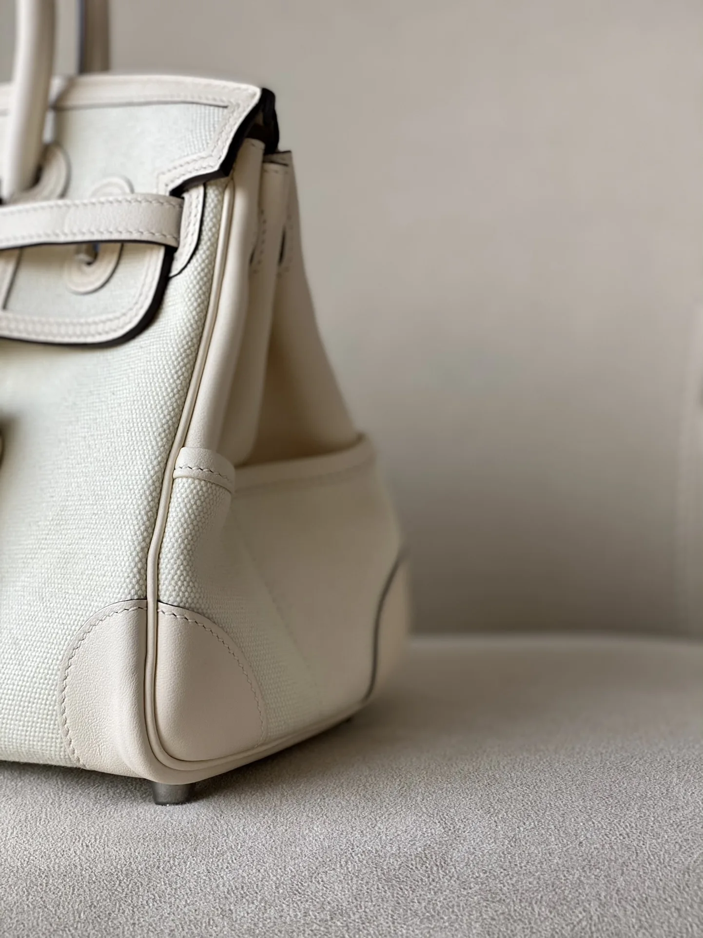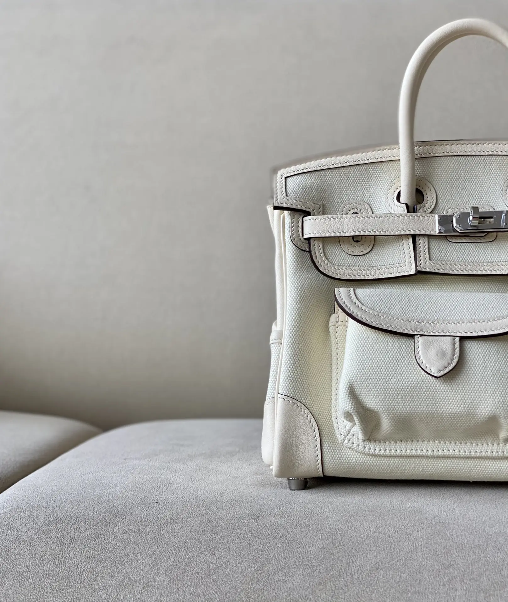 Birkin 25 Cargo Bag Material: Canvas and Swift leather Size: 25 x 20 x 13 cm. This canvas and Swift leather combination is produced in very limited quantities, offering a vintage feel that improves with age. The unique feature of this bag is its five external pockets, making it ideal for men or cool women.