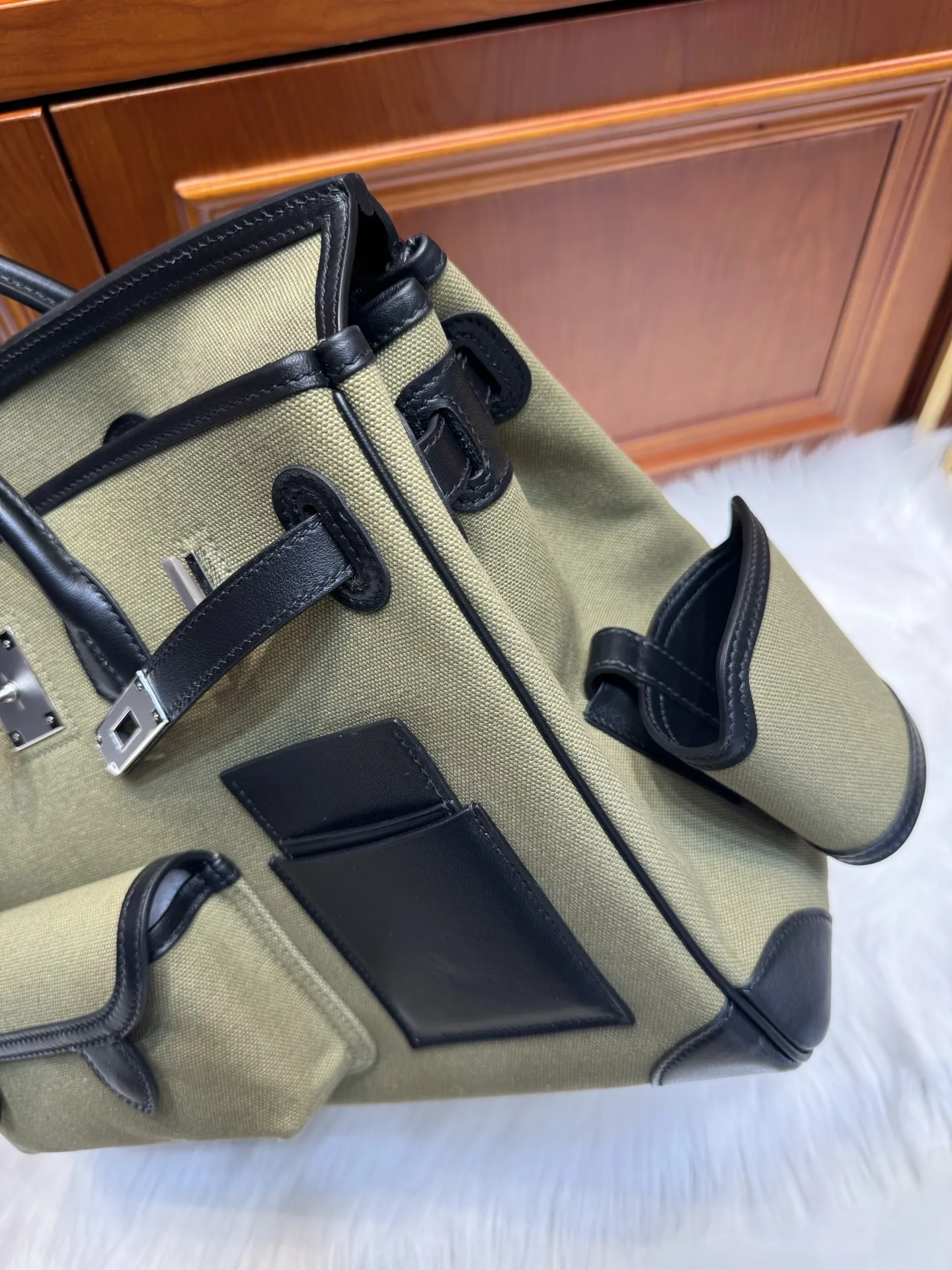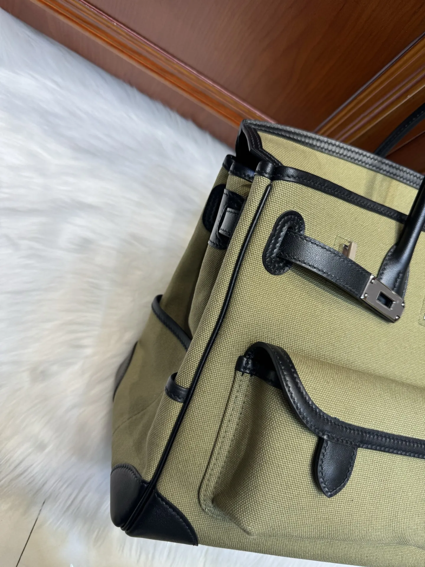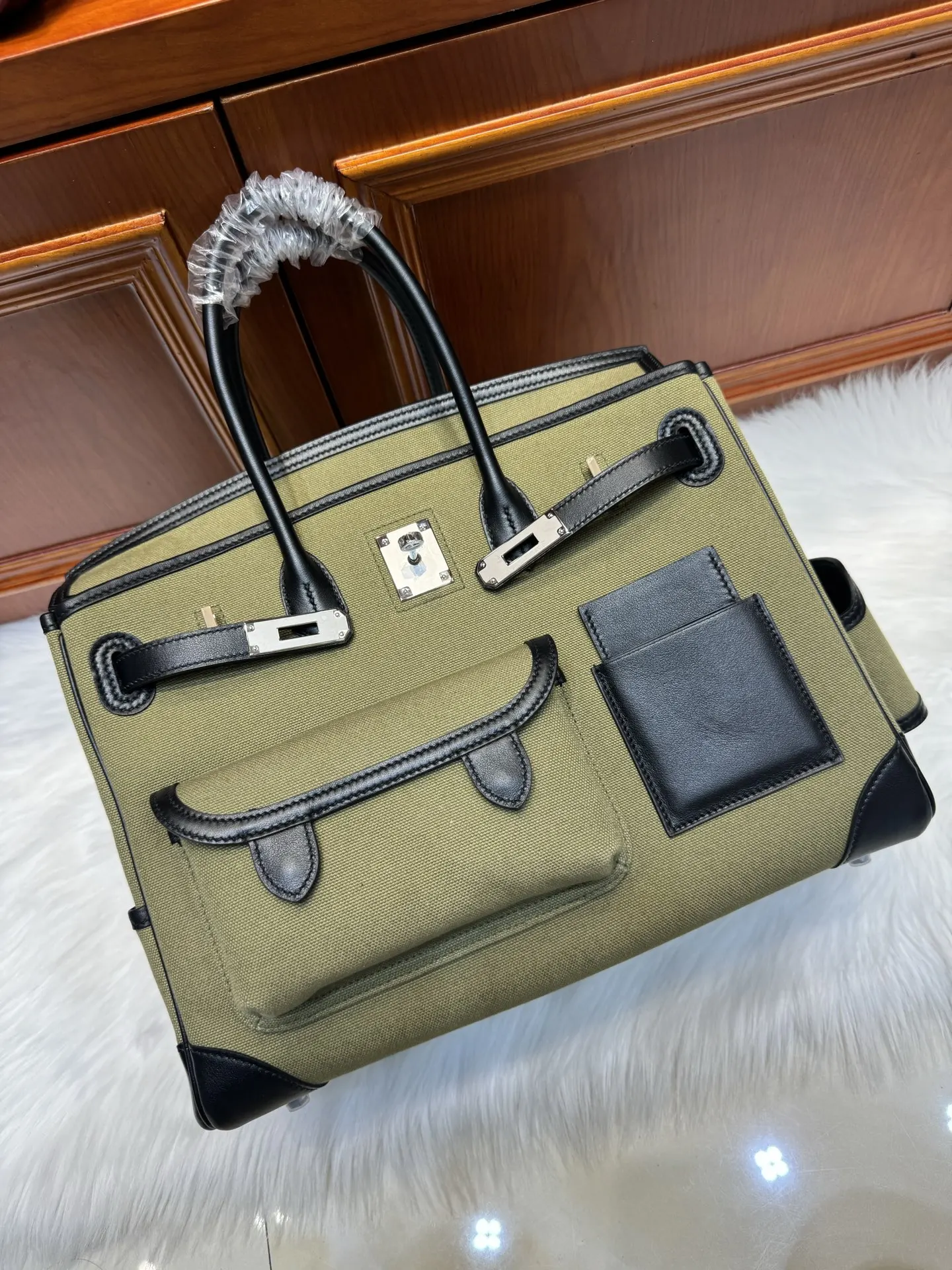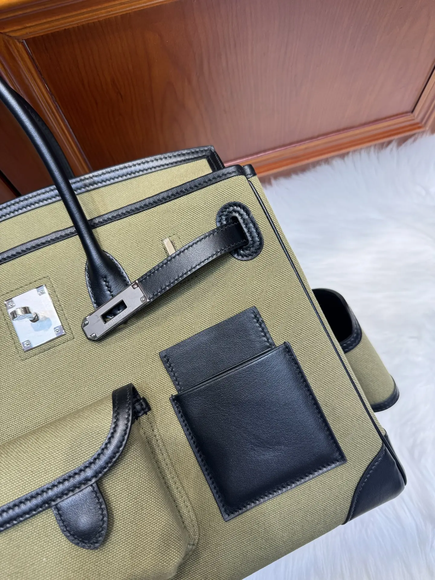 Platinum Birkin Cargo 35cm Black Swift Leather with Military Green Canvas and Silver Hardware