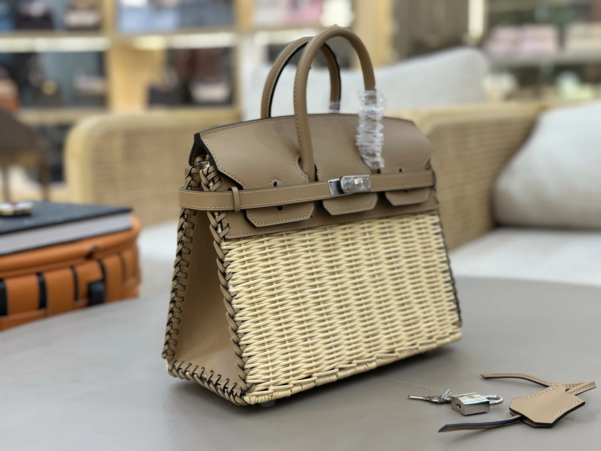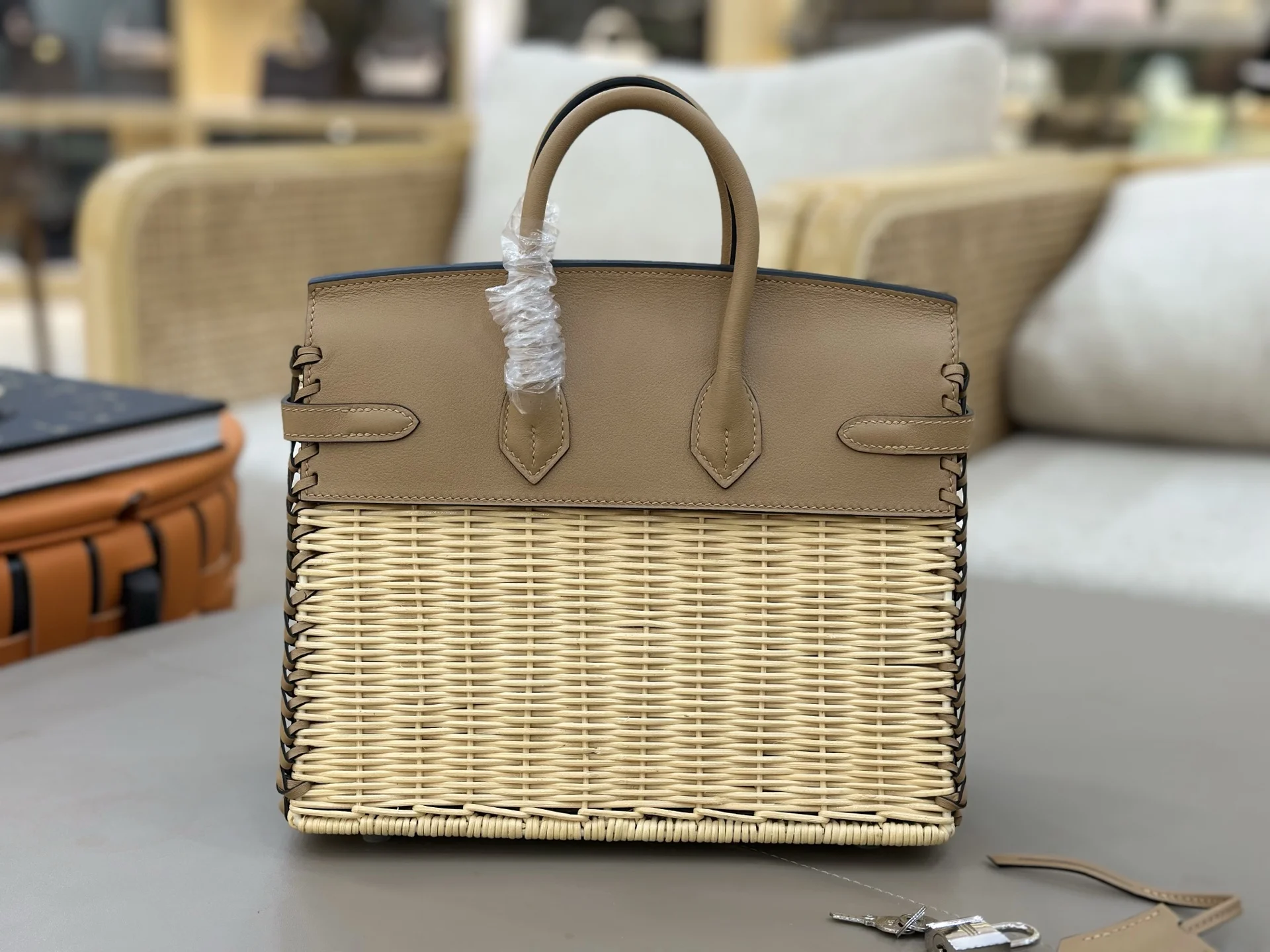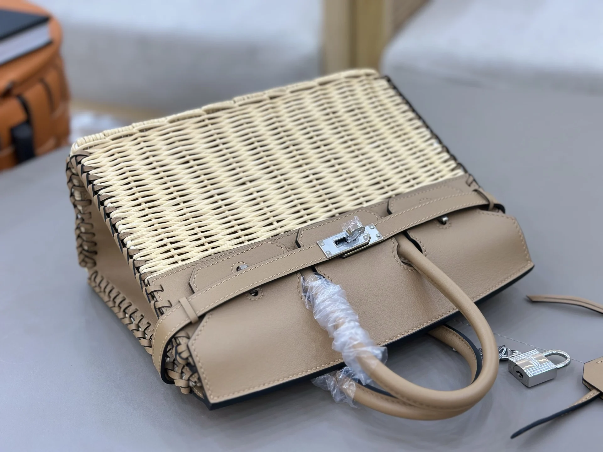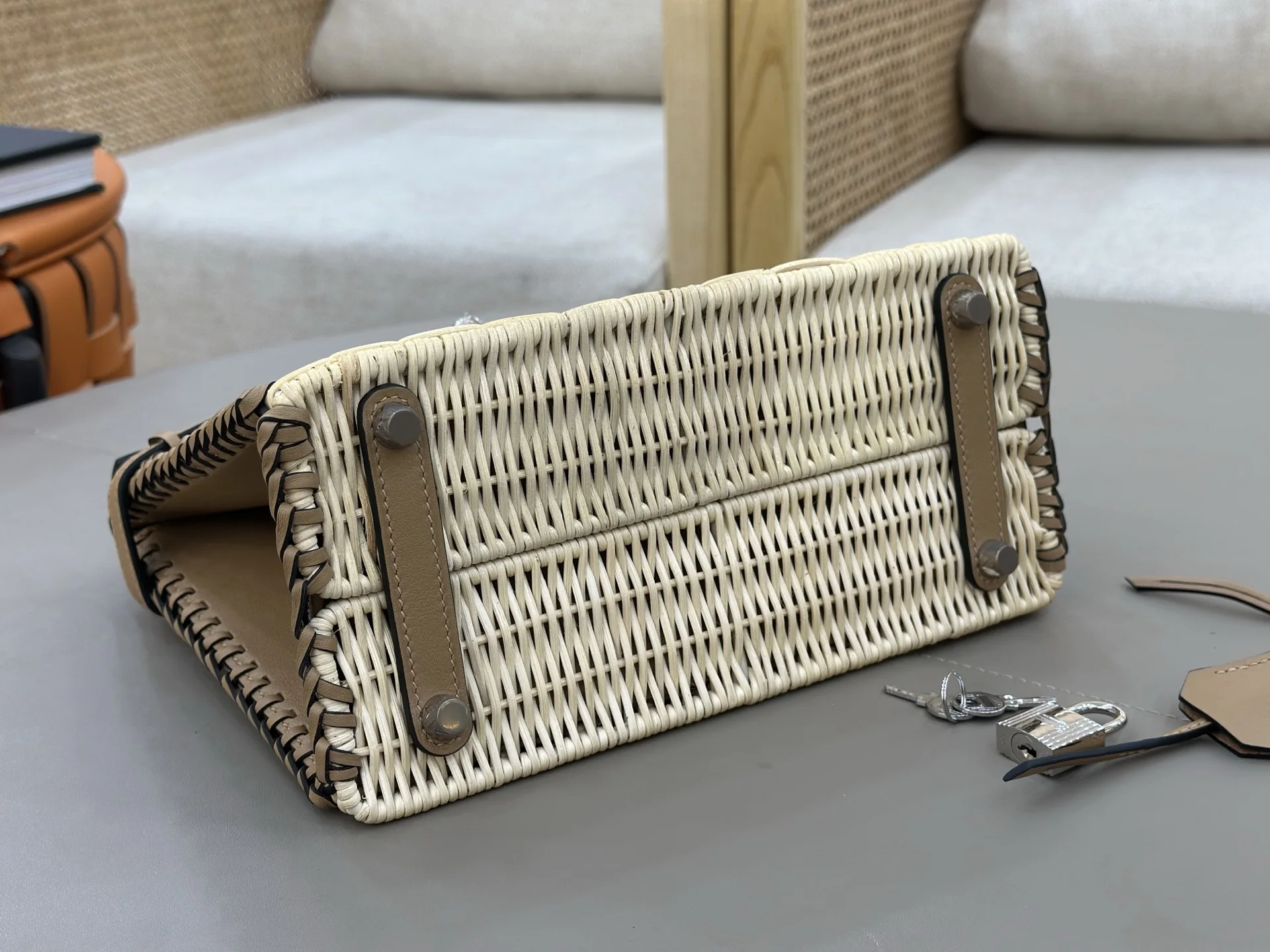 Summer essential, rattan woven picnic basket in milk tea color , casual pastoral style, full of atmosphere. Perfect for vacation trips, camping picnics, or everyday wear. Birkin picnic in original saddle leather woven wicker 25cm is a manageable and relatively spacious size, perfect for spring and summer outings.