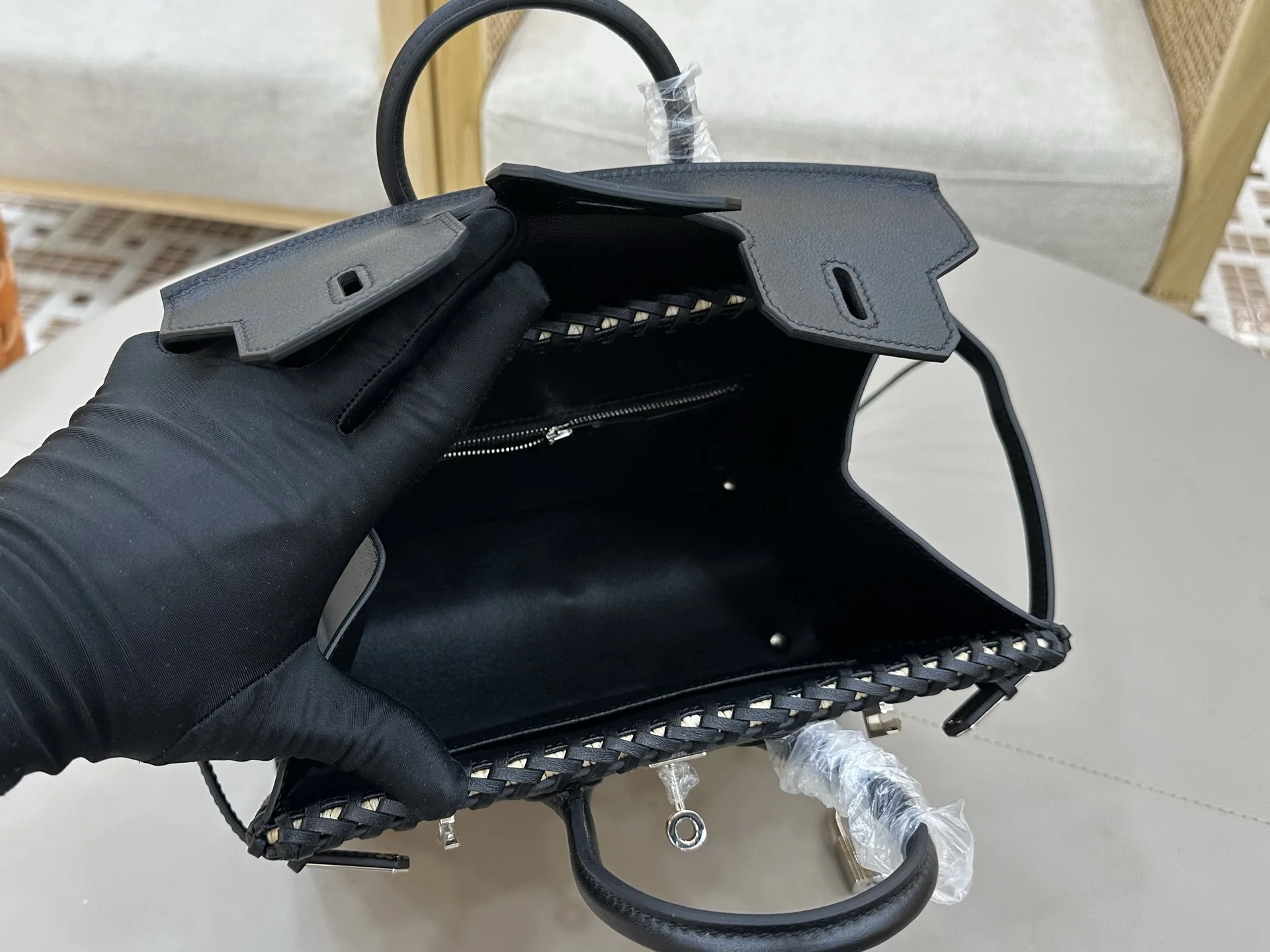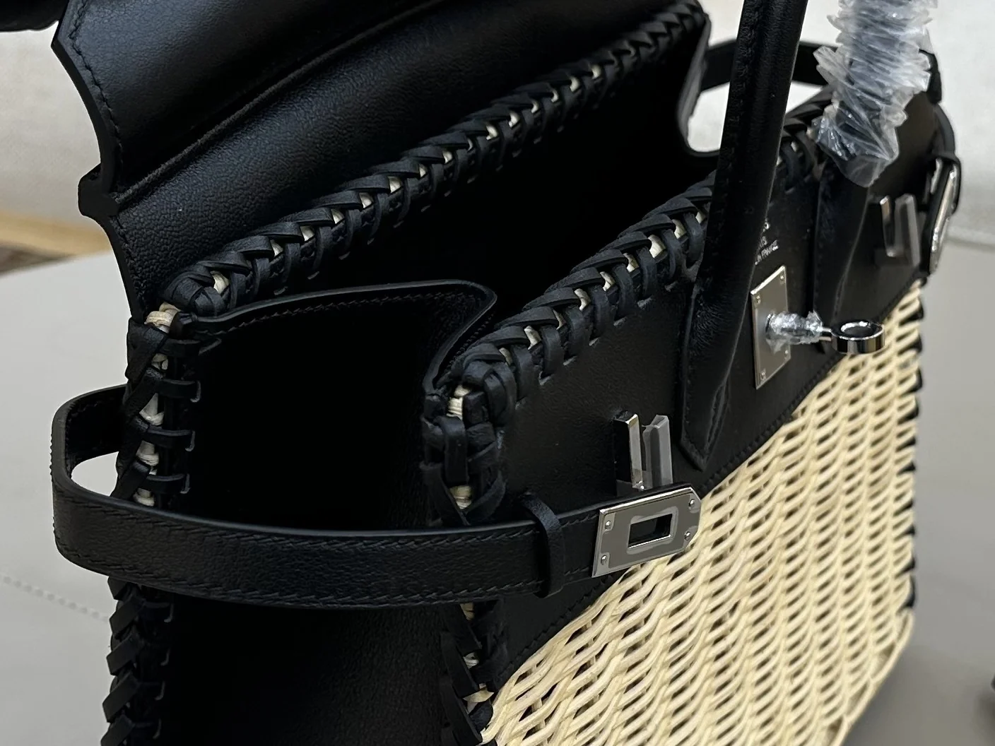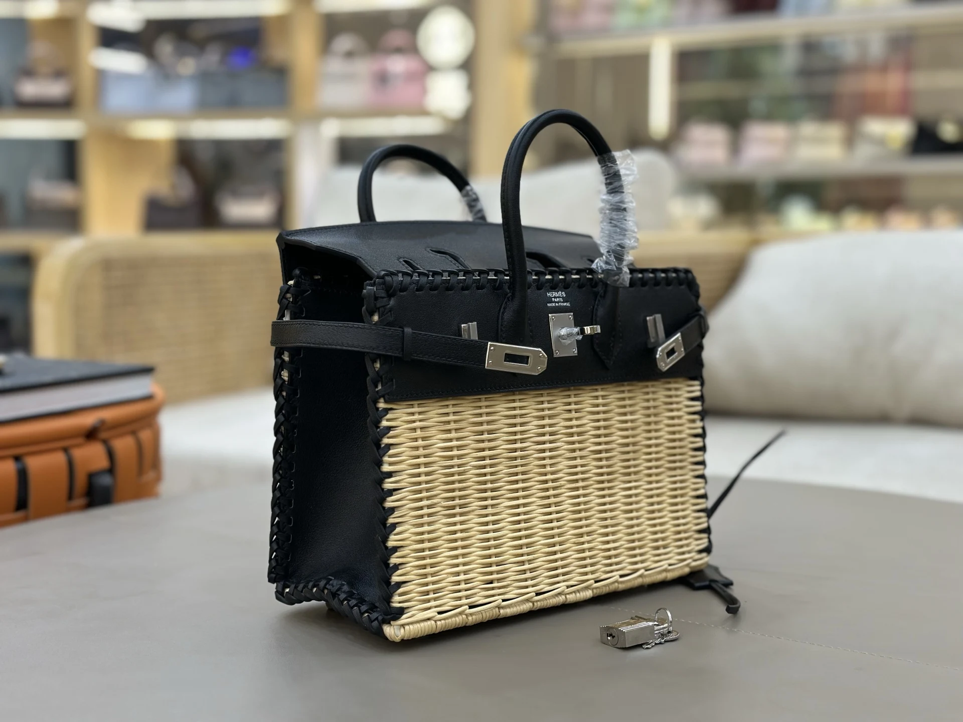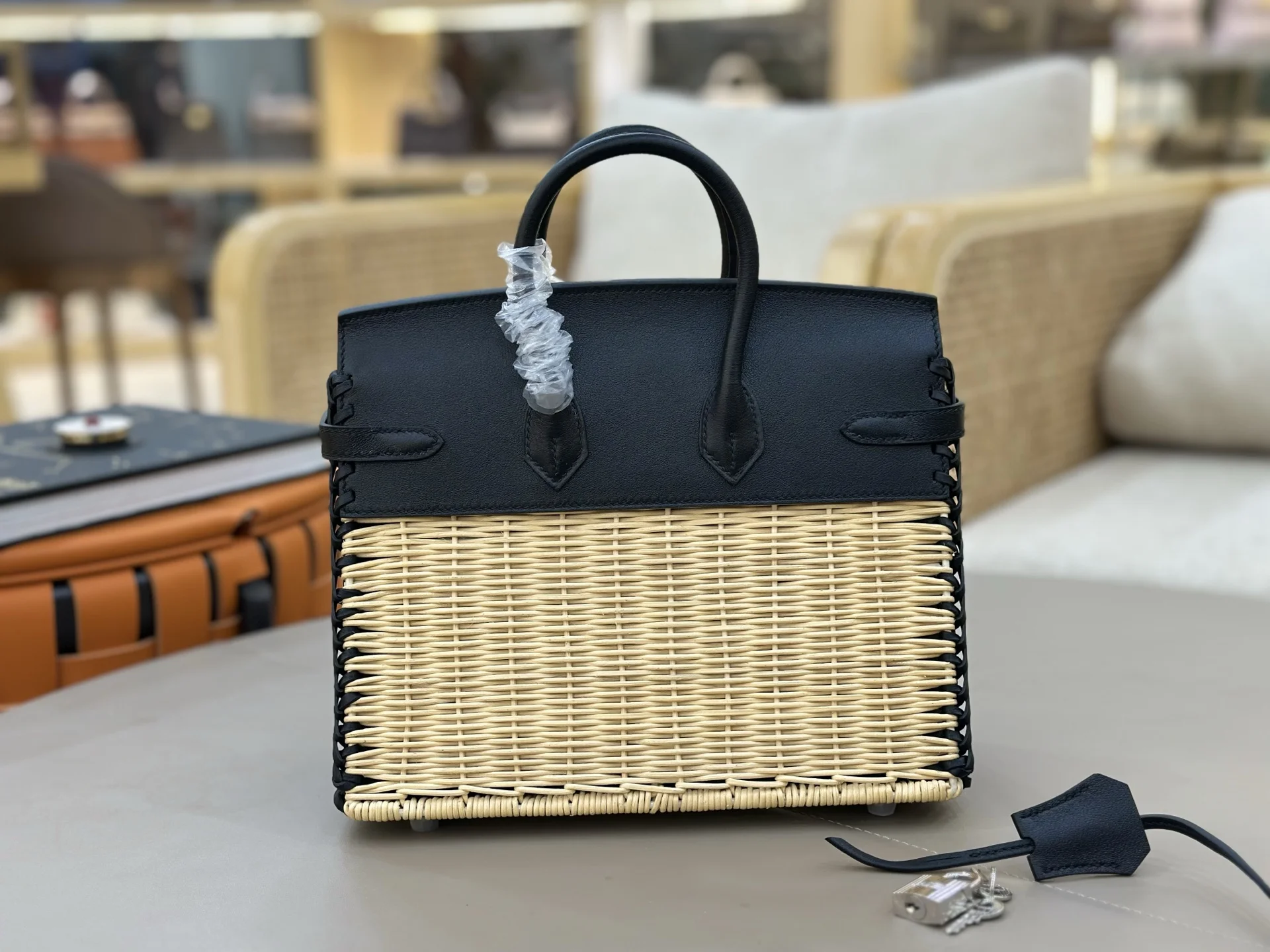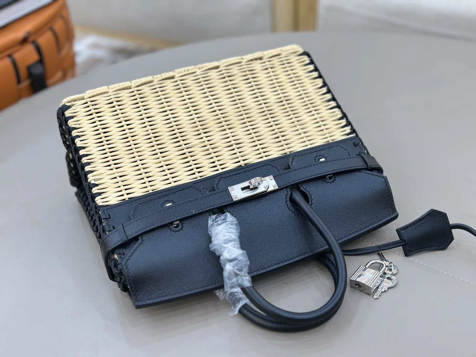 A summer essential, this black woven rattan picnic bag exudes a casual, pastoral vibe, creating a full sense of atmosphere. Perfect for vacations, camping, picnics, or everyday wear. The Birkin Picnic features natural saddle leather and woven wicker in a manageable and relatively spacious 25cm size, making it ideal for spring and summer outings.
