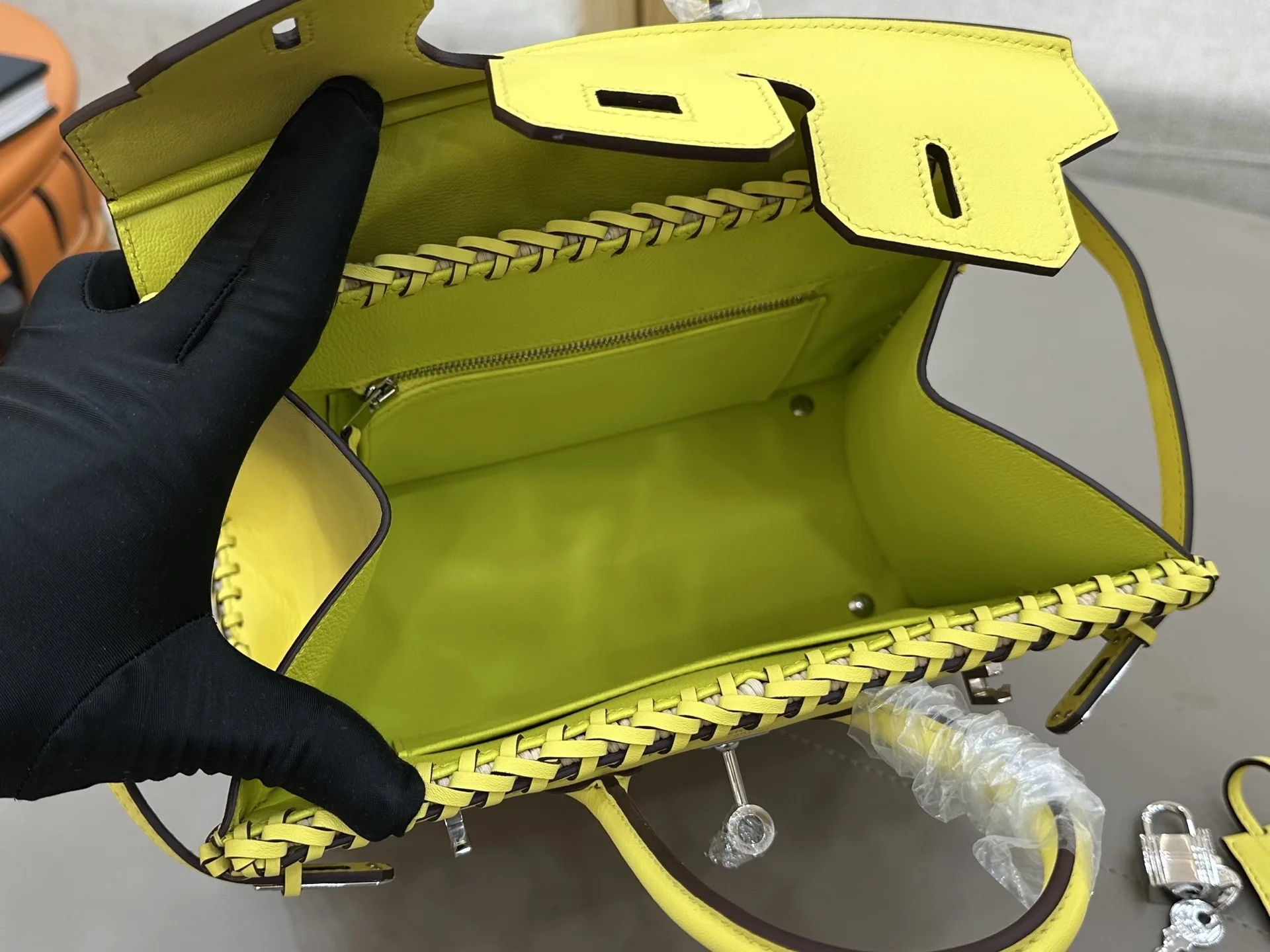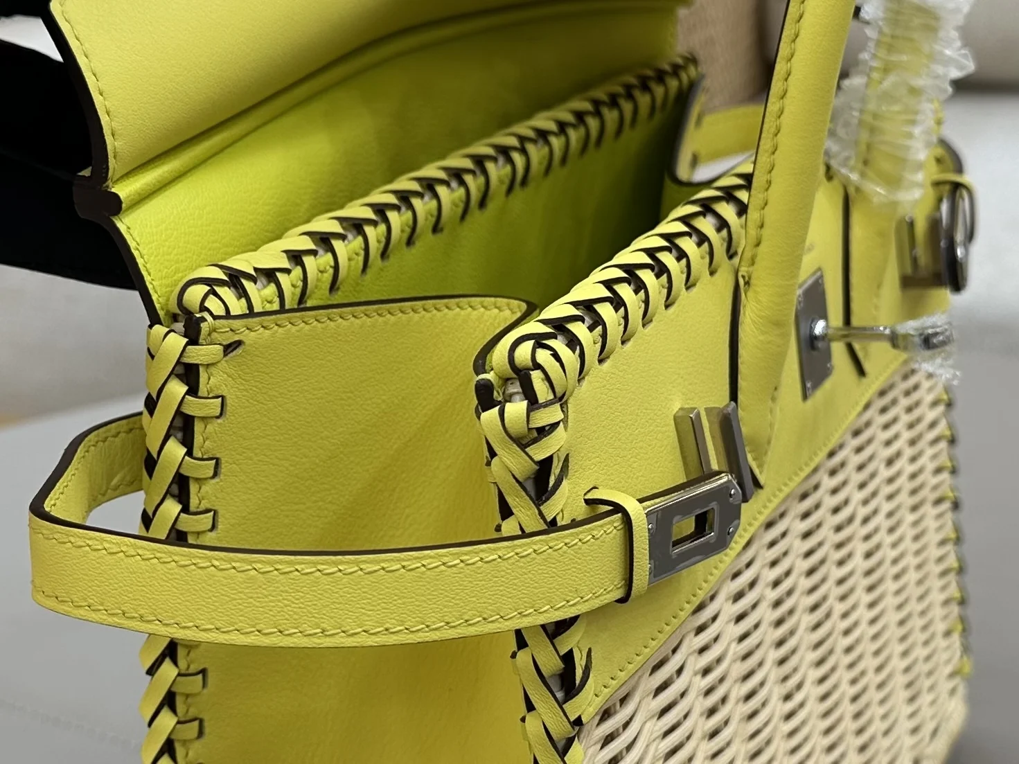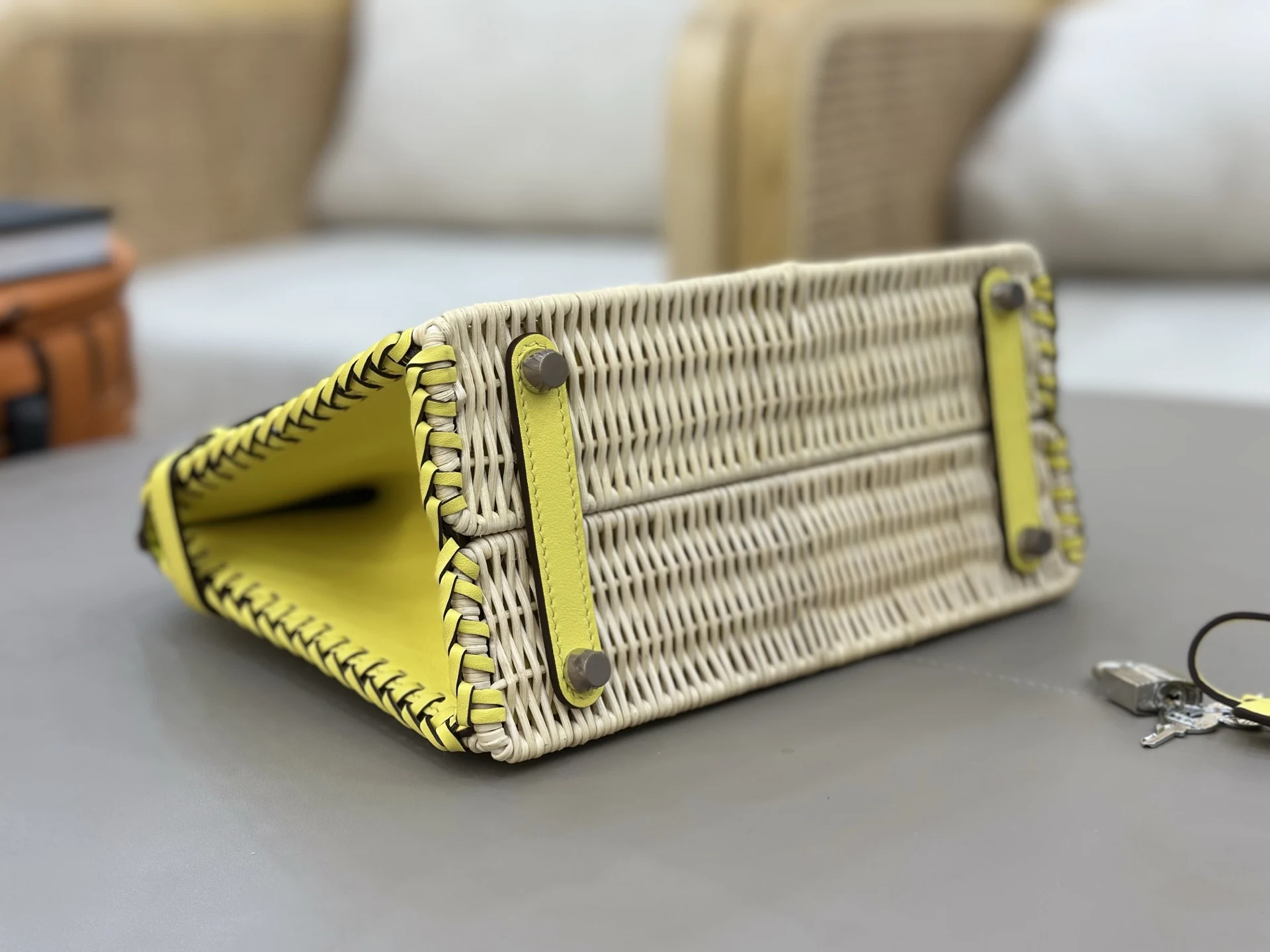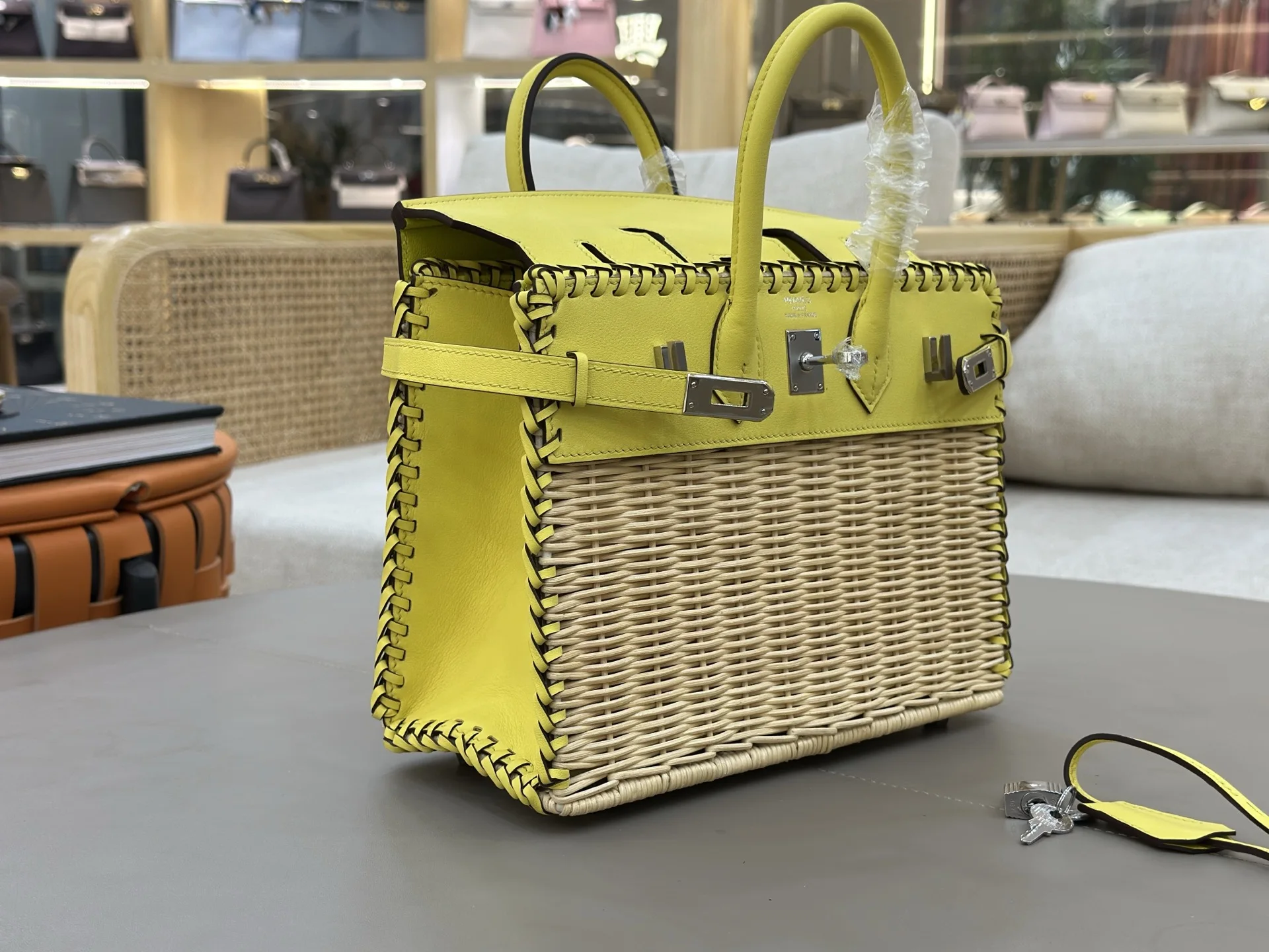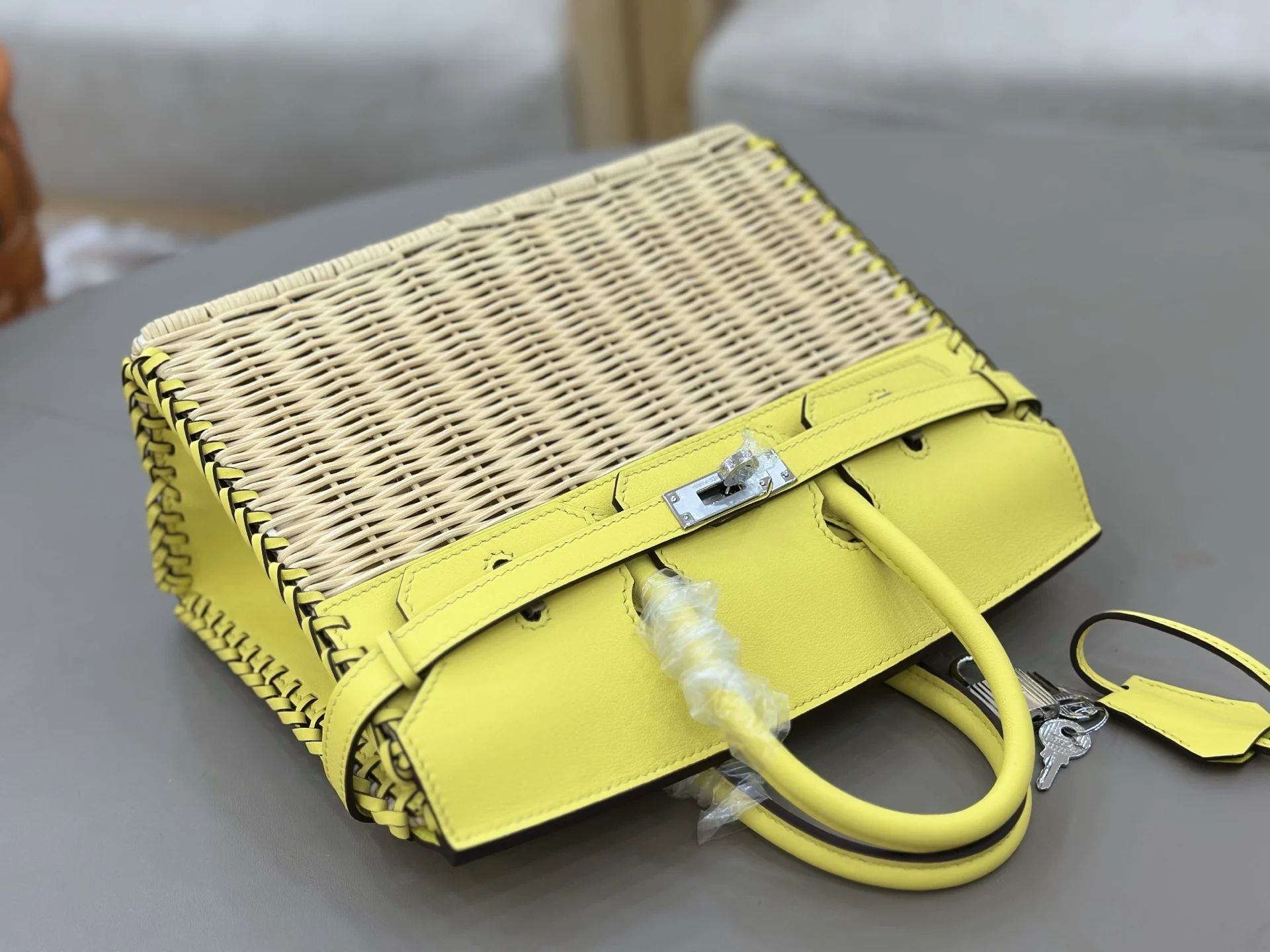 Summer essential, rattan woven picnic basket, yellow casual pastoral style, full of ambiance, perfect for vacation trips, camping picnics, or daily wear. Birkin picnic original saddle leather woven wicker 25cm is a manageable and relatively spacious size, really suitable for spring and summer outings.