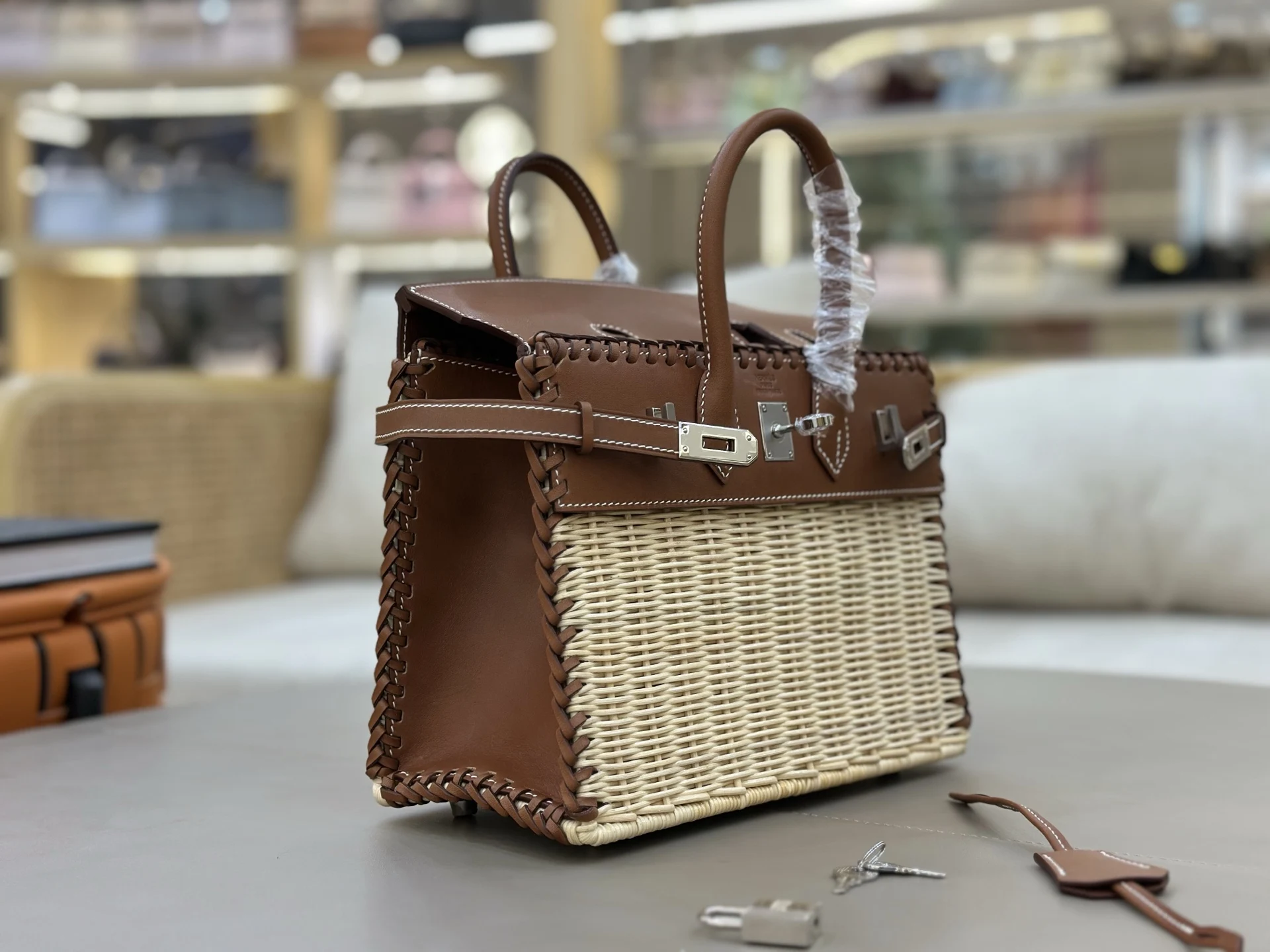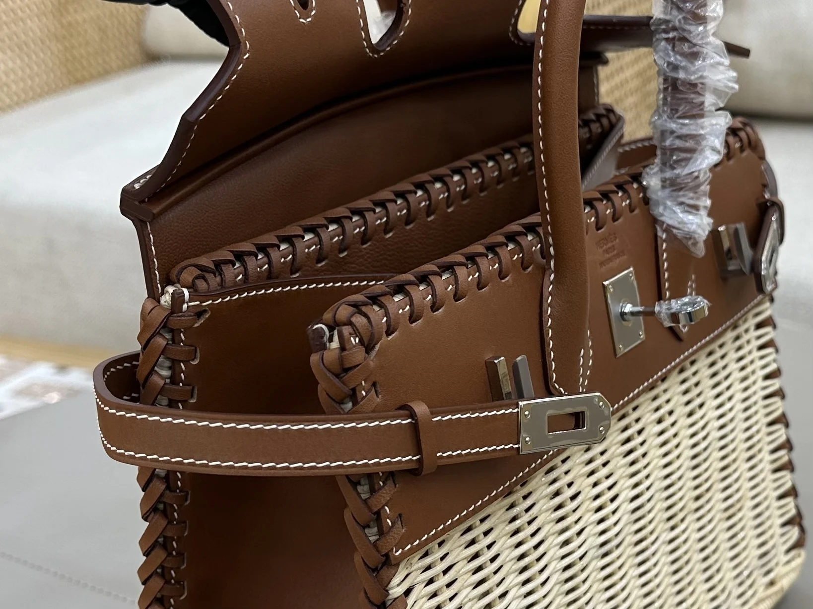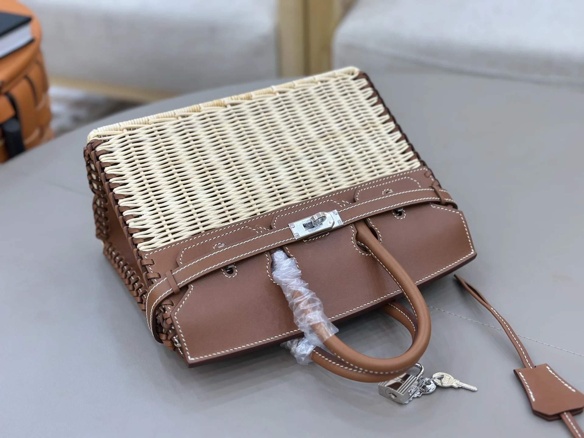 Essential summer restock: Wicker picnic bag in saddle leather, golden brown, casual pastoral style, full of ambiance. Perfect for vacation, camping, picnics, or everyday wear. The Birkin picnic in natural saddle leather woven wicker, 25cm, is a manageable and relatively spacious size, ideal for spring and summer outings.