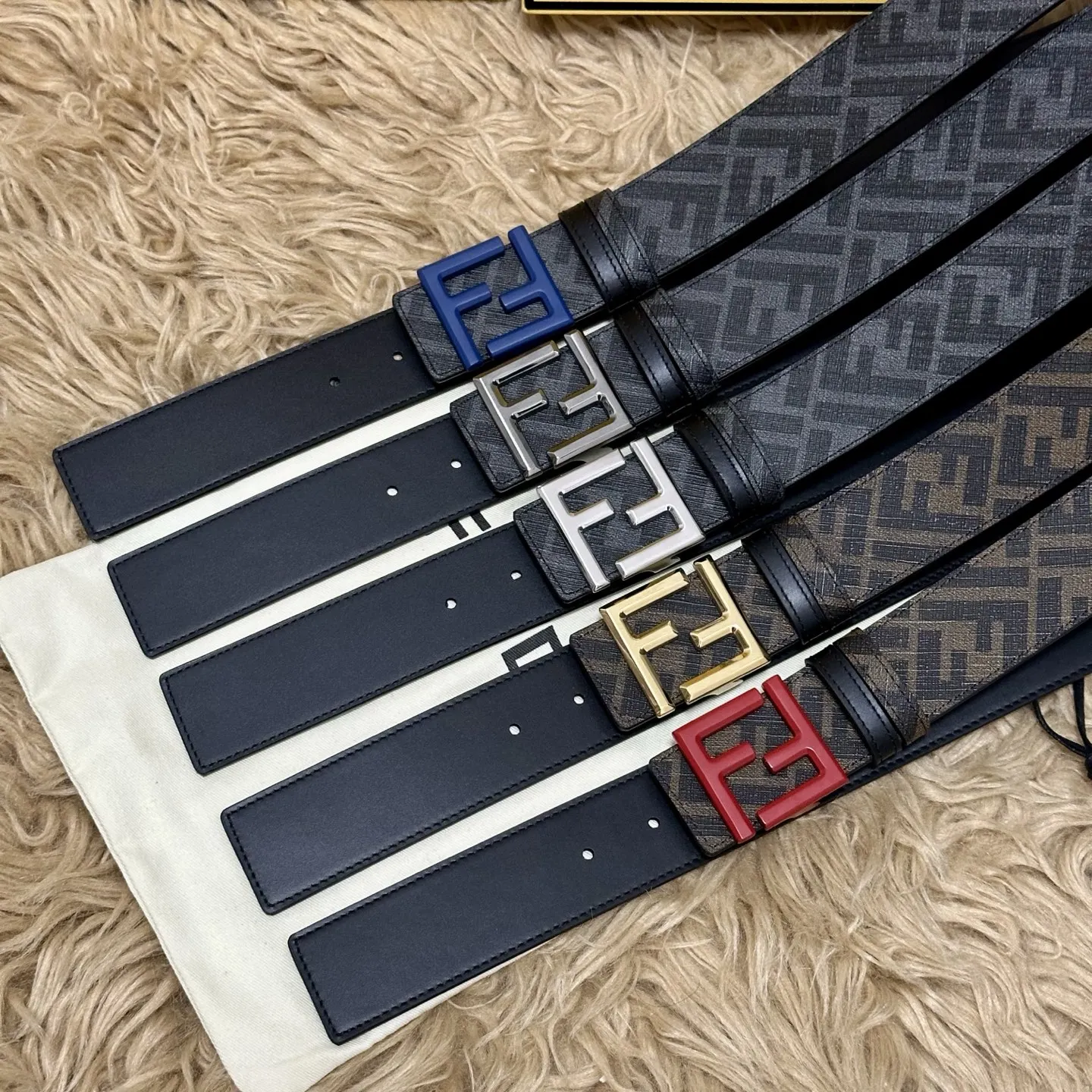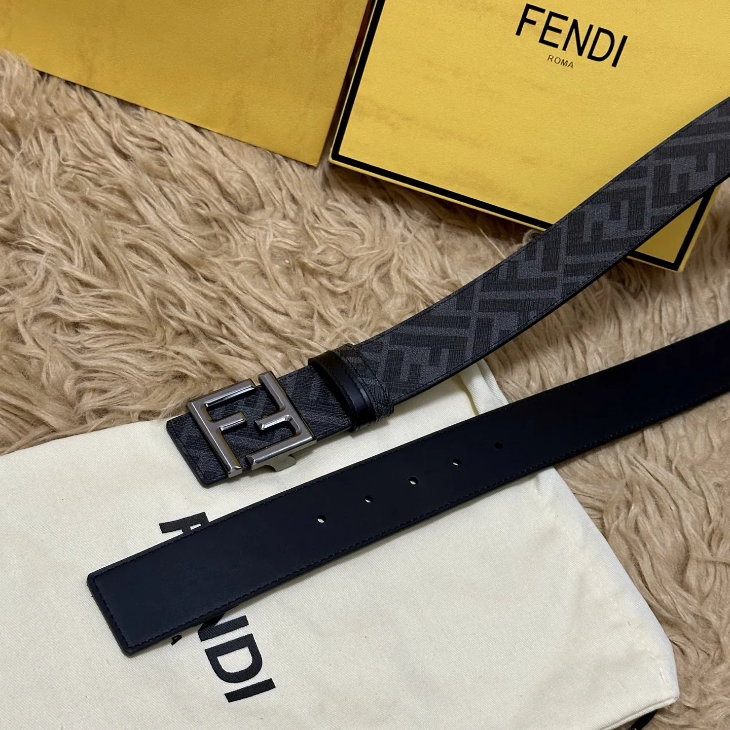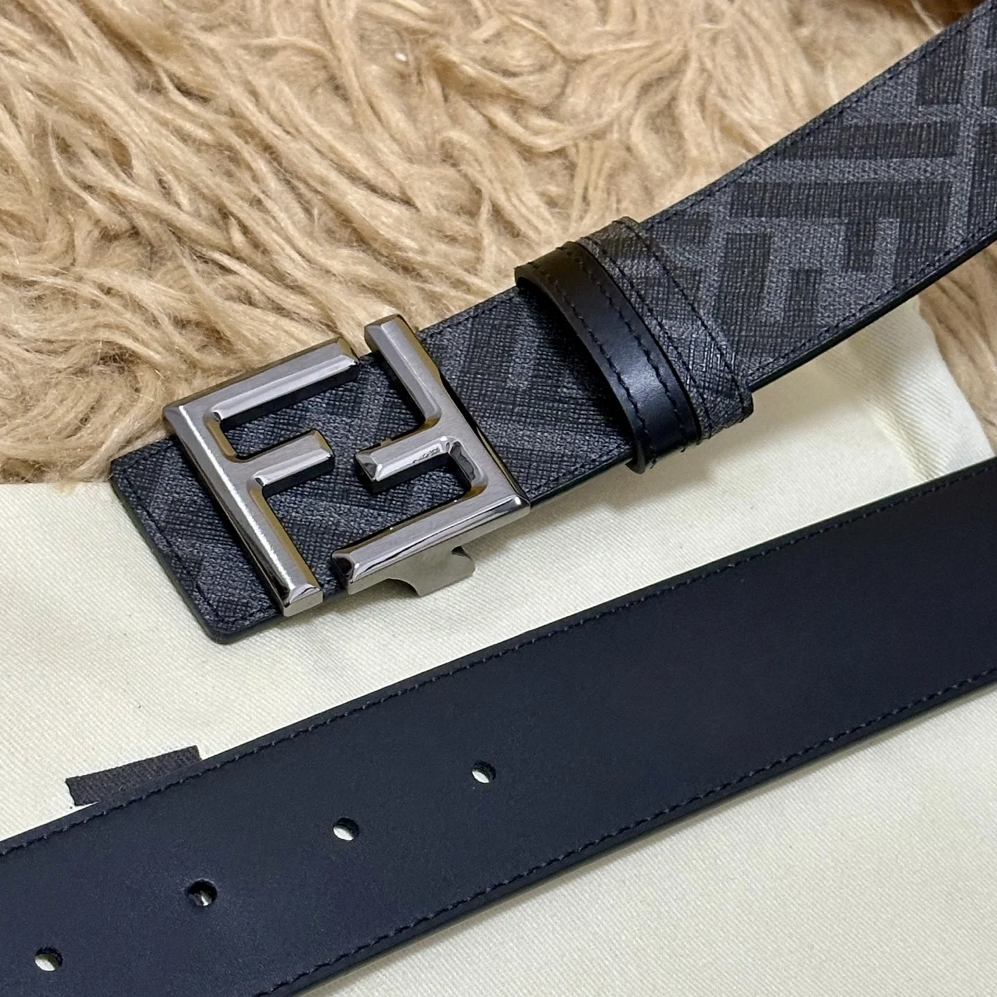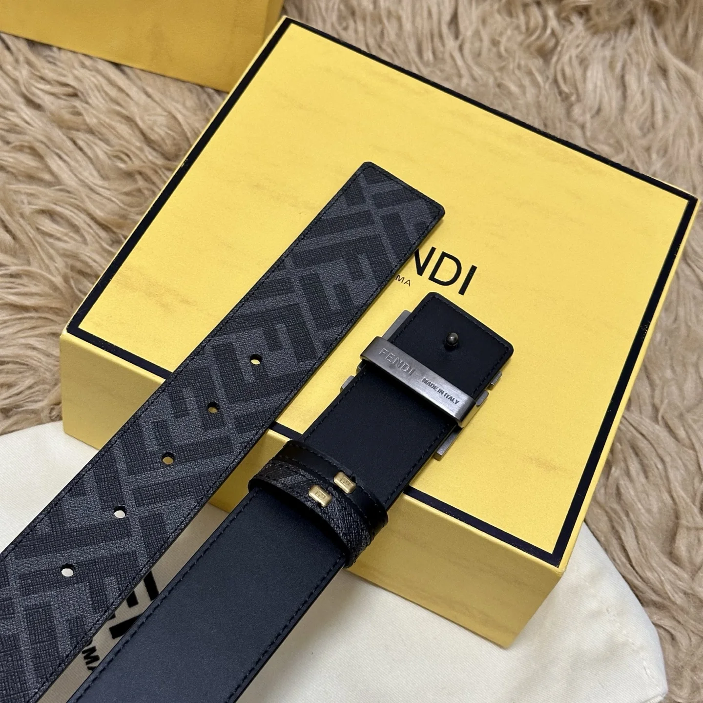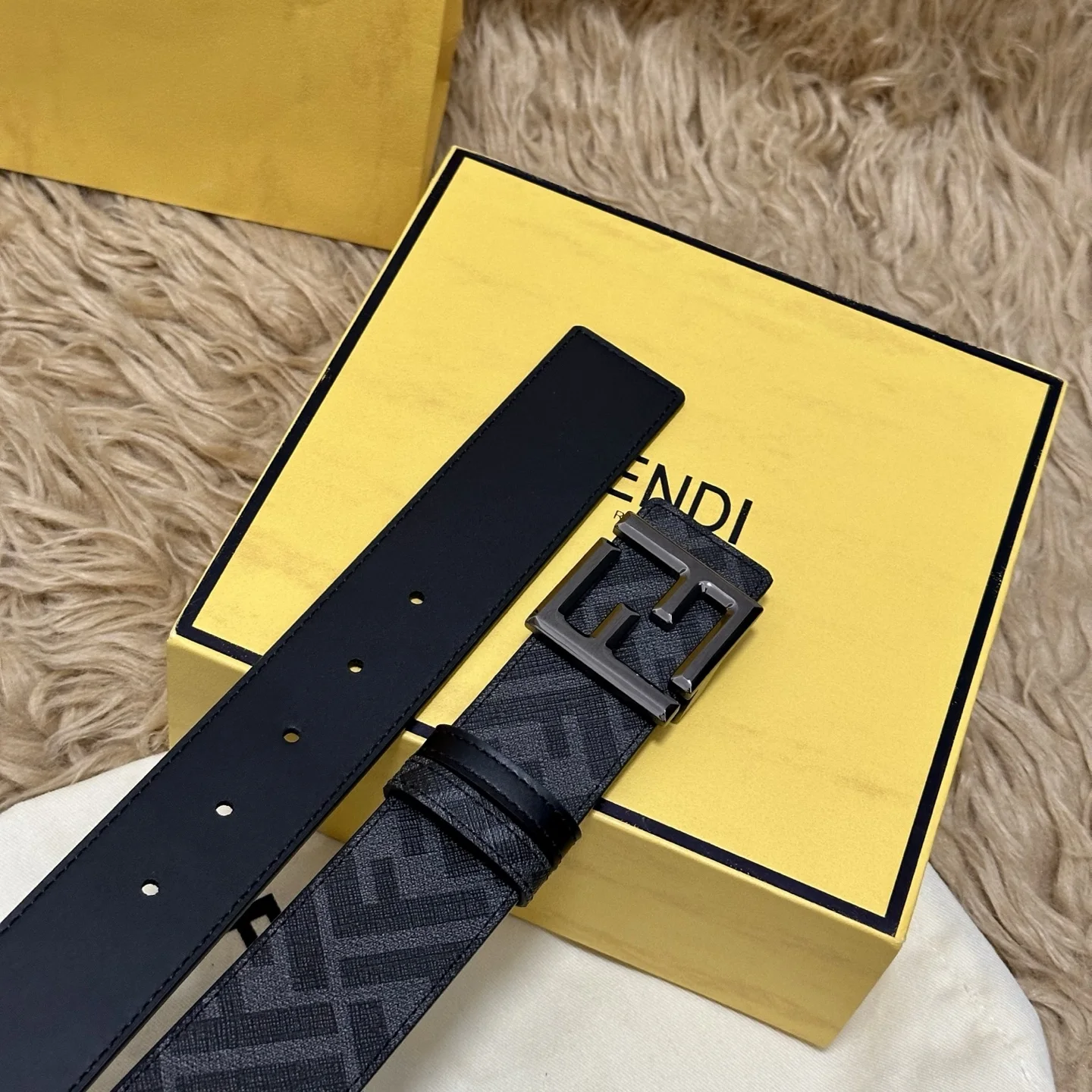FENDI full set packaging, same style as in store, wide 4.0CM double-sided reversible belt, FF snap buckle, black Cuoio Romano leather material, reverse side with tobacco yellow and black FF pattern, square metal finish, fashionable and classic, versatile style.
