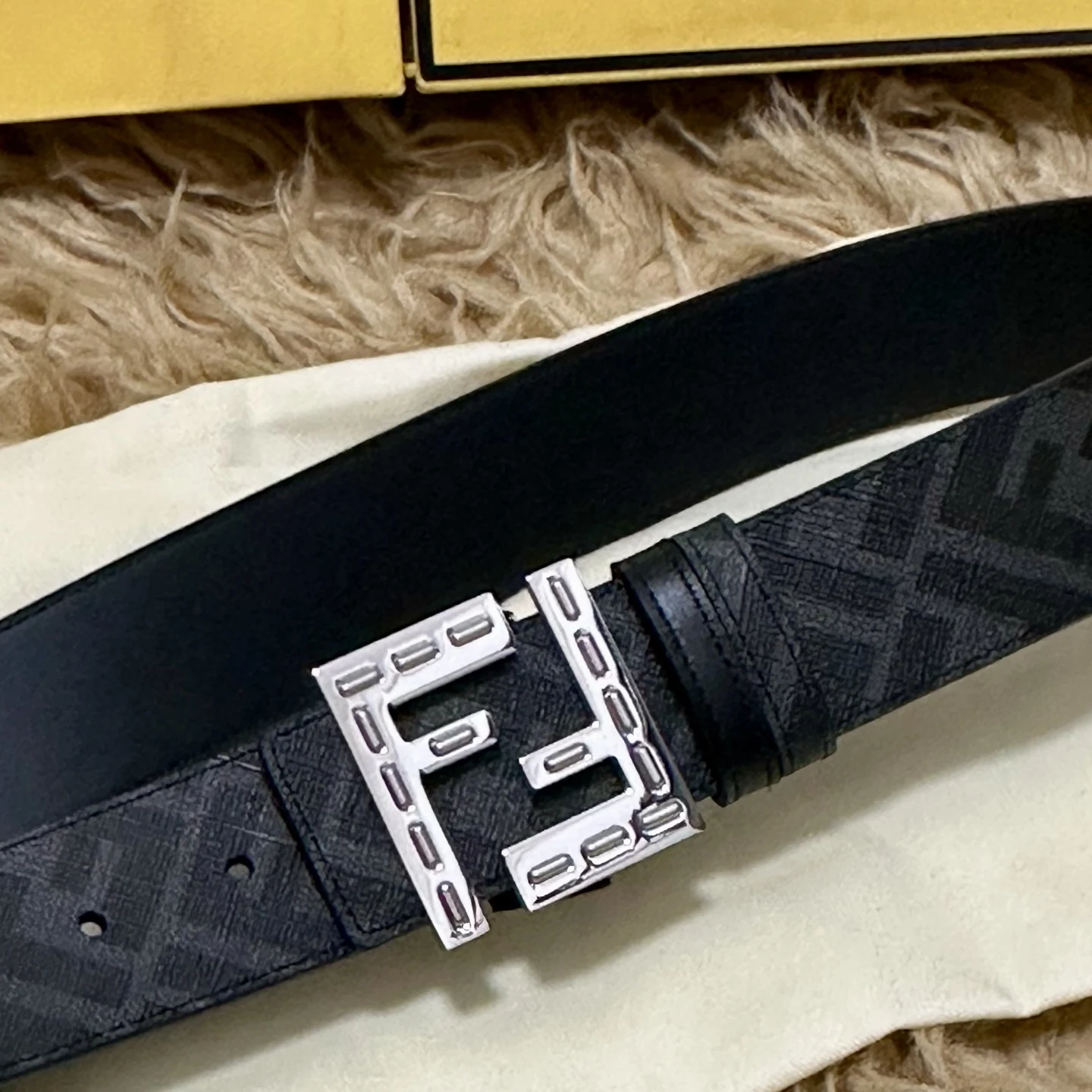 FENDI full set packaging, same style as in boutiques, wide 4.0CM double-sided reversible belt, FF stud buckle, black Cuoio Romano leather, reverse side with tobacco yellow and black FF motif, square metal finish, fashionable and classic, versatile style.
