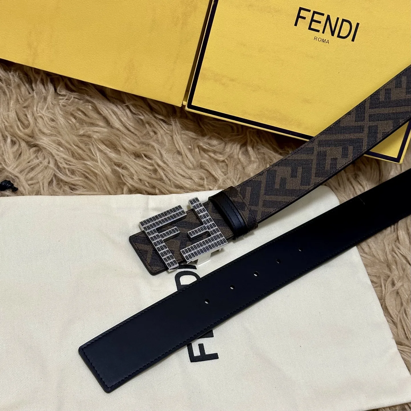 FENDI Full Set Packaging, Same Style as in Boutiques, Width 4.0CM, Reversible Belt with Double Loop, FF Stud Buckle, Black Cuoio Romano Leather, Reverse Side with Tobacco Yellow and Black FF Pattern, Square Metal Finish, Fashionable and Classic, Versatile Style