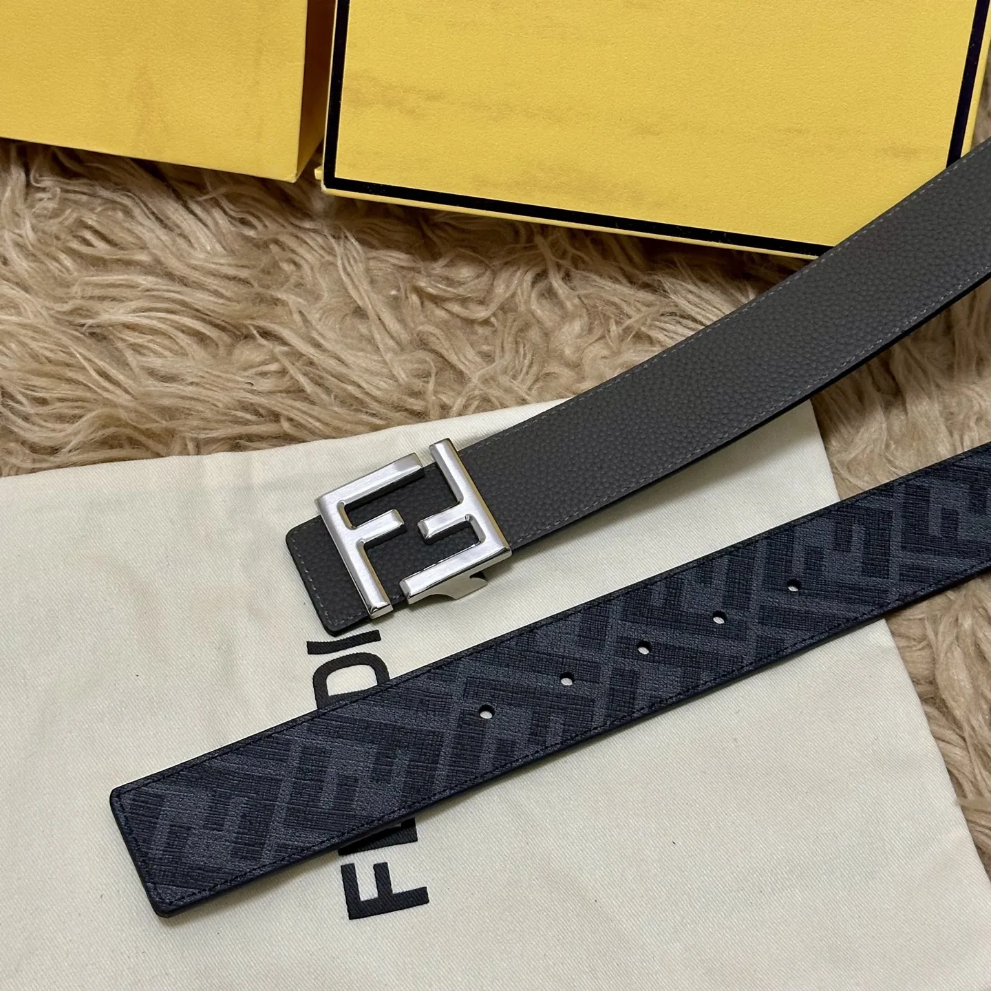 FENDI full set packaging, same style as in boutiques, 4.0CM wide reversible belt with double loops, FF snap buckle, black Cuoio Romano leather, reverse side with tobacco yellow and black FF motif, square metal finish, fashionable and classic, versatile style.