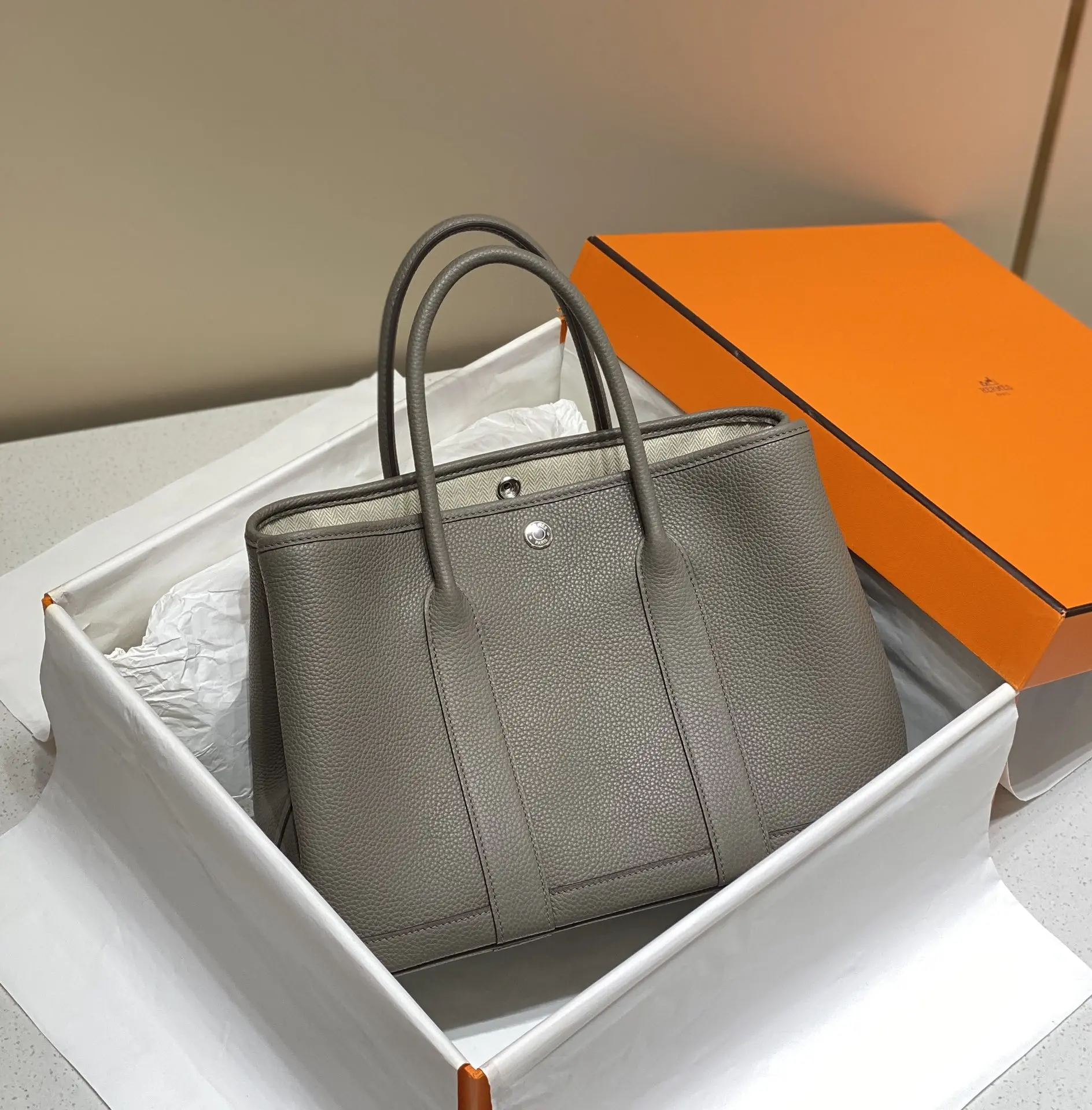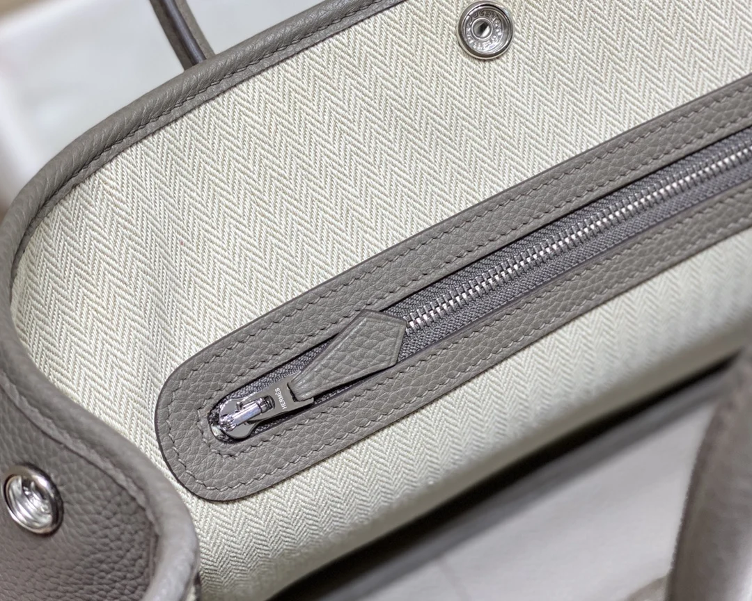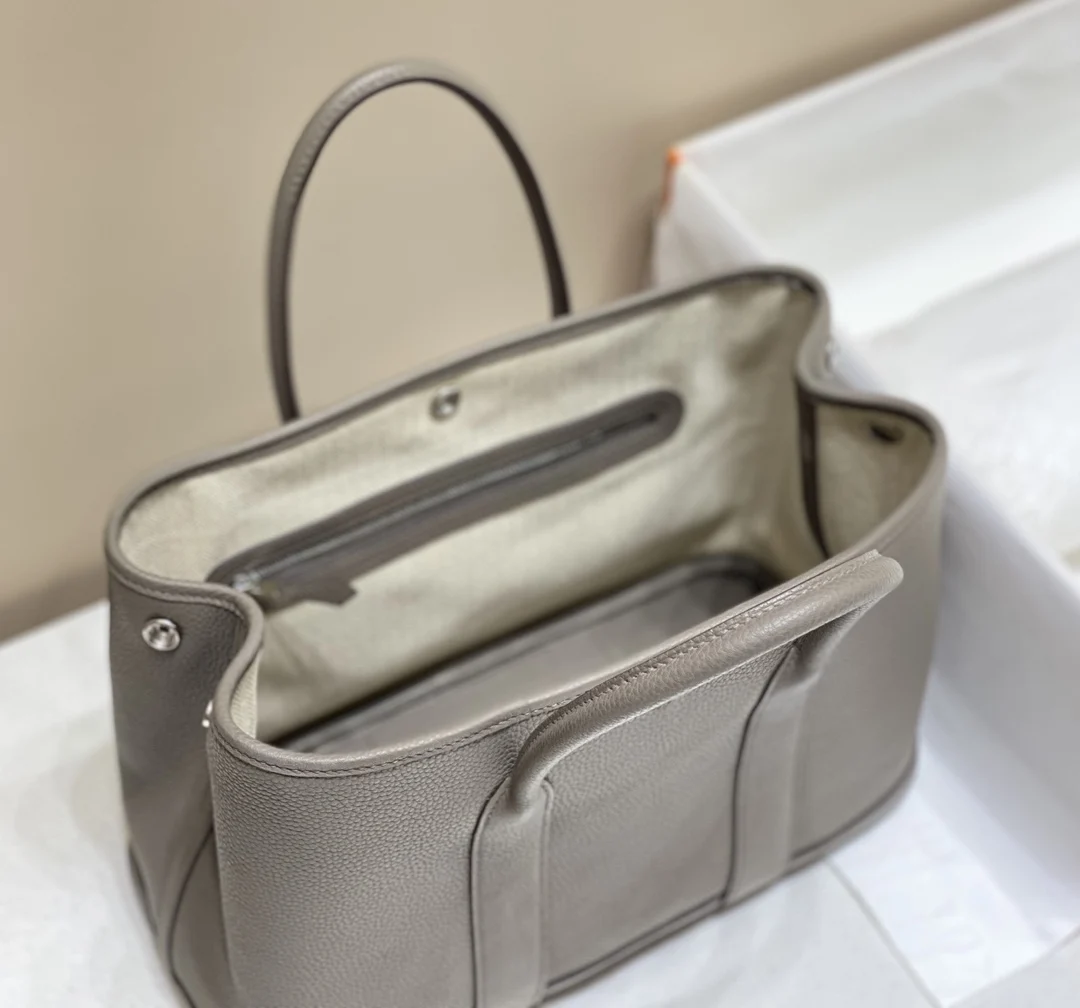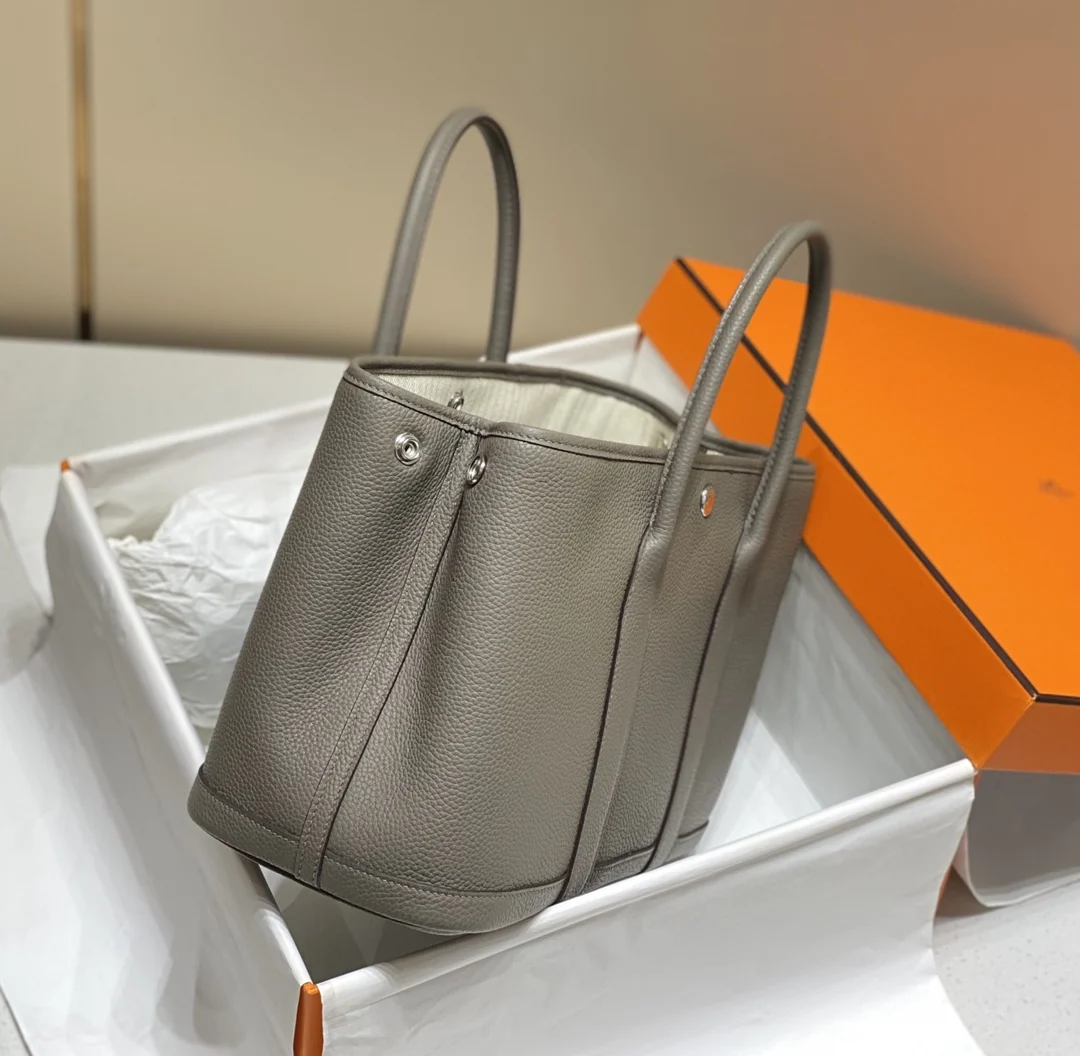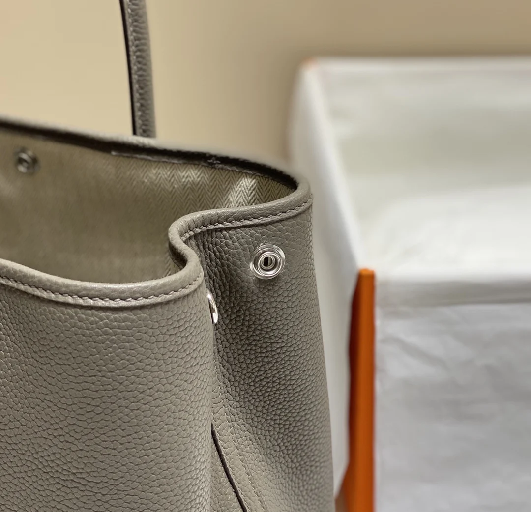 Semi-handmade Garden Party 30cm 36cm tote bag, tin gray. Hardware: electroplated pure steel. Leather: Grade A Togo leather, hand-stitched with beeswax thread, consistent with the o..