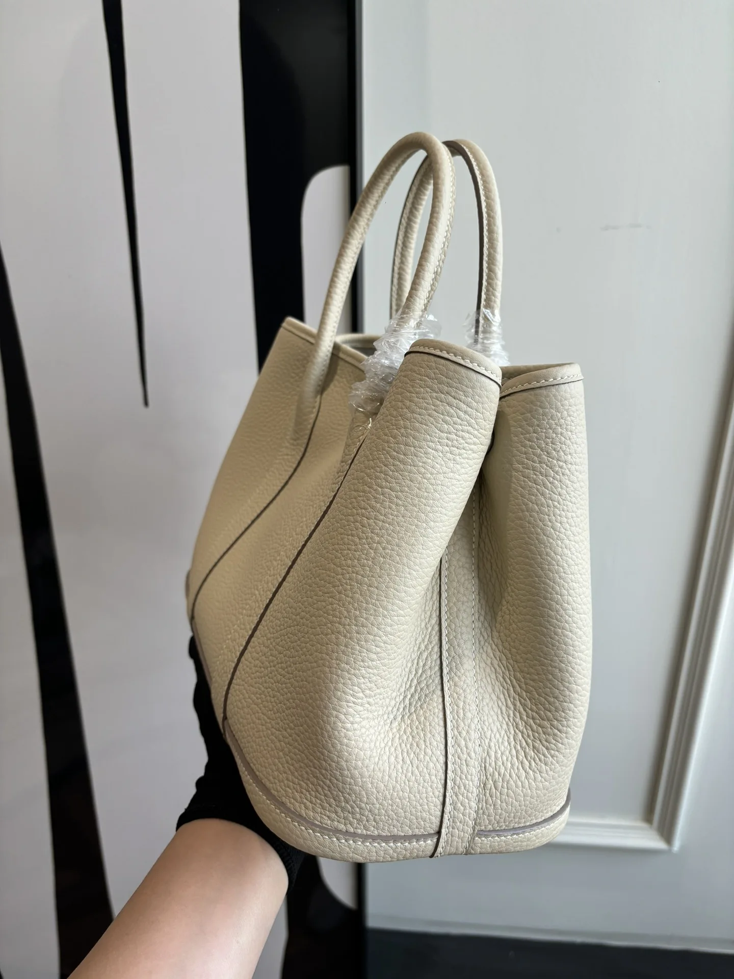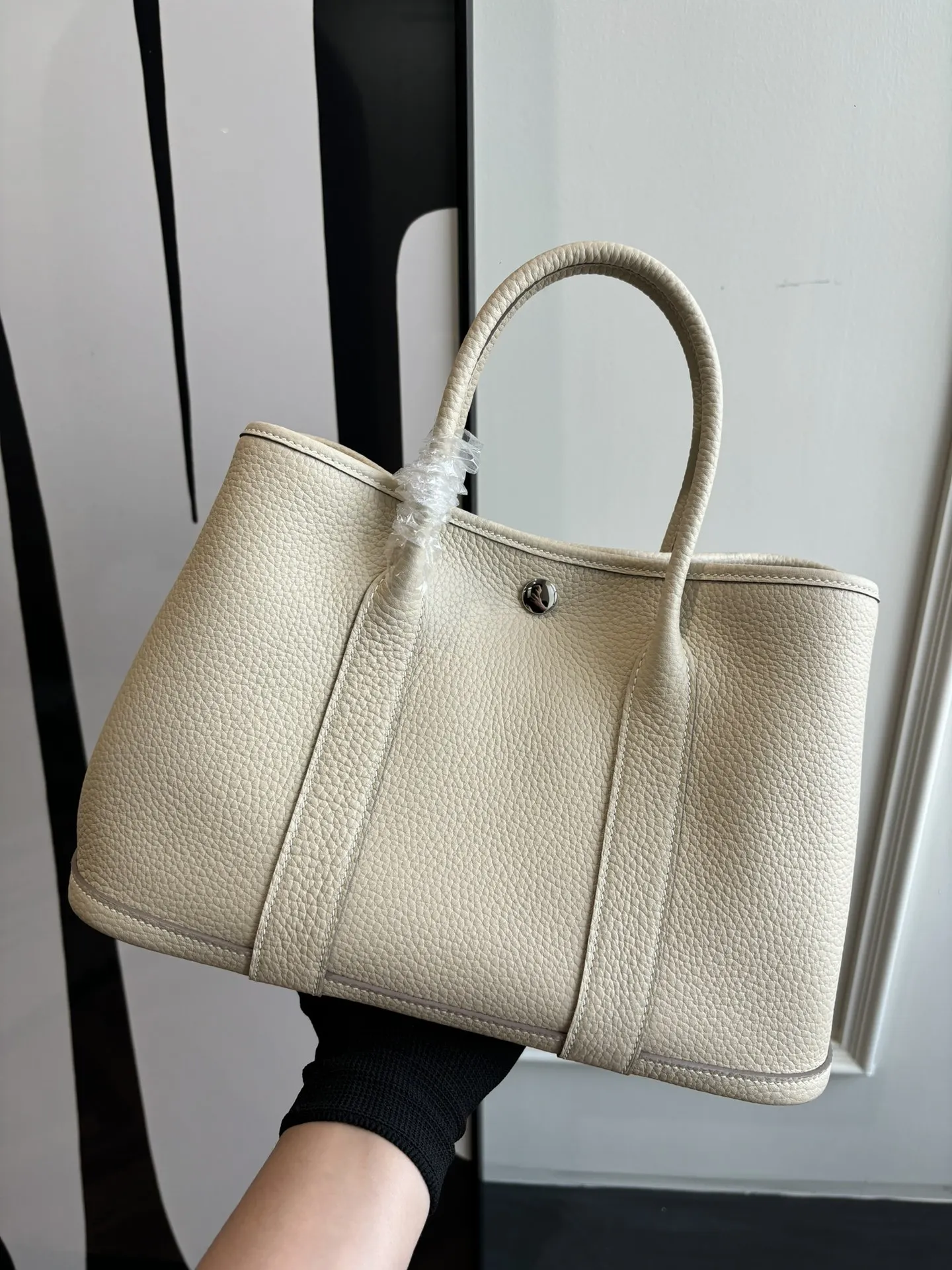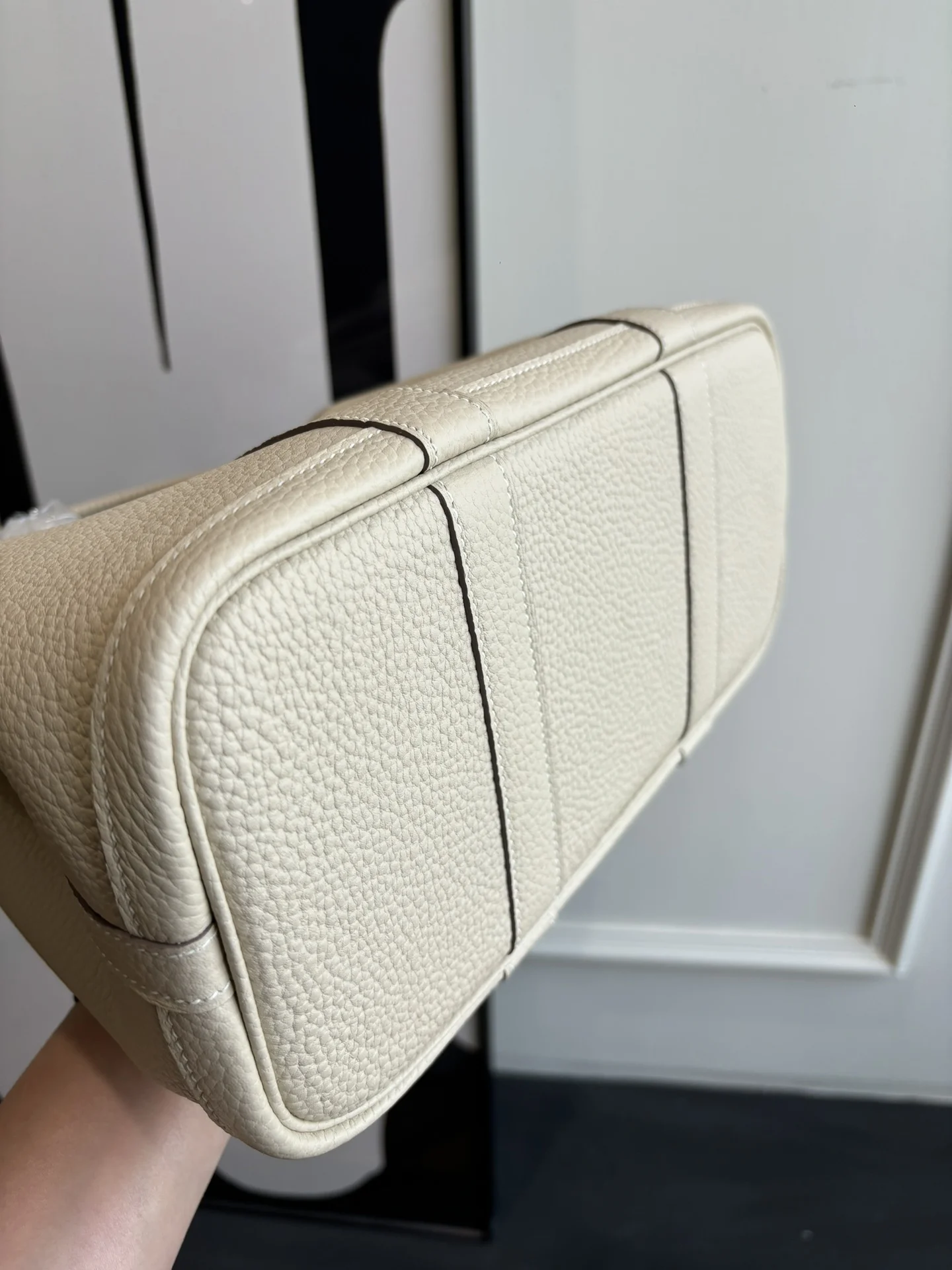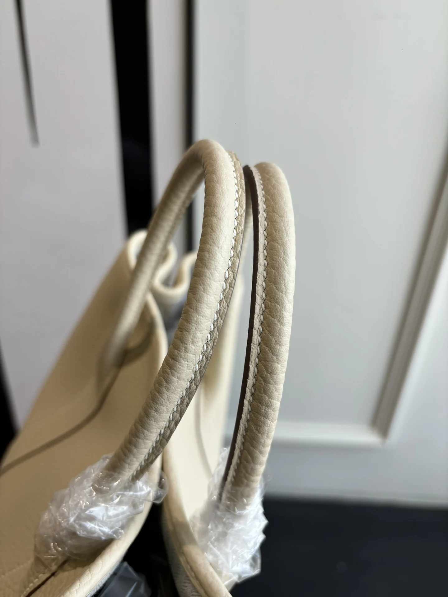 Garden Party bag, Notogo leather, lightweight design suitable for commuting or as a diaper bag, combining aesthetics and practicality. Semi-handmade with waxed thread. Color: Milkshake White. Sizes: 23cm - 30cm (two sizes).