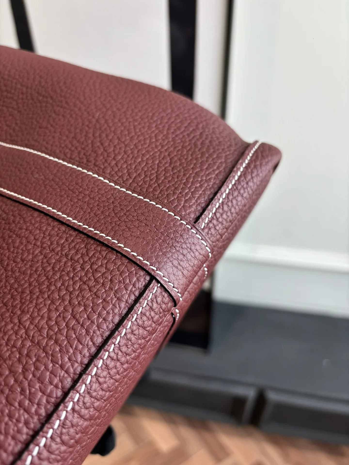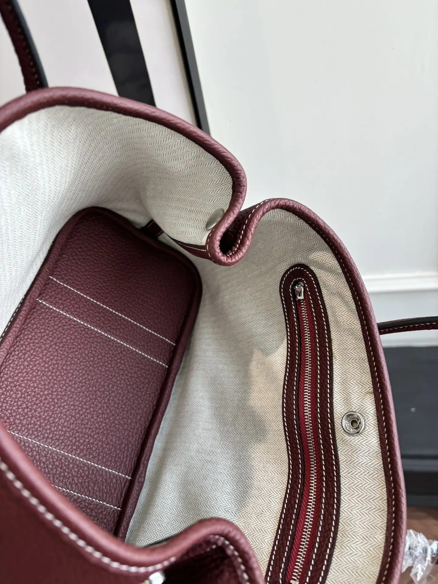 Garden Party bag, Notogo leather, prioritizing both aesthetics and practicality as a commuting or diaper bag. Features semi-handmade wax thread stitching. Color: Saddle Red. Sizes: 23cm - 30cm (two sizes).