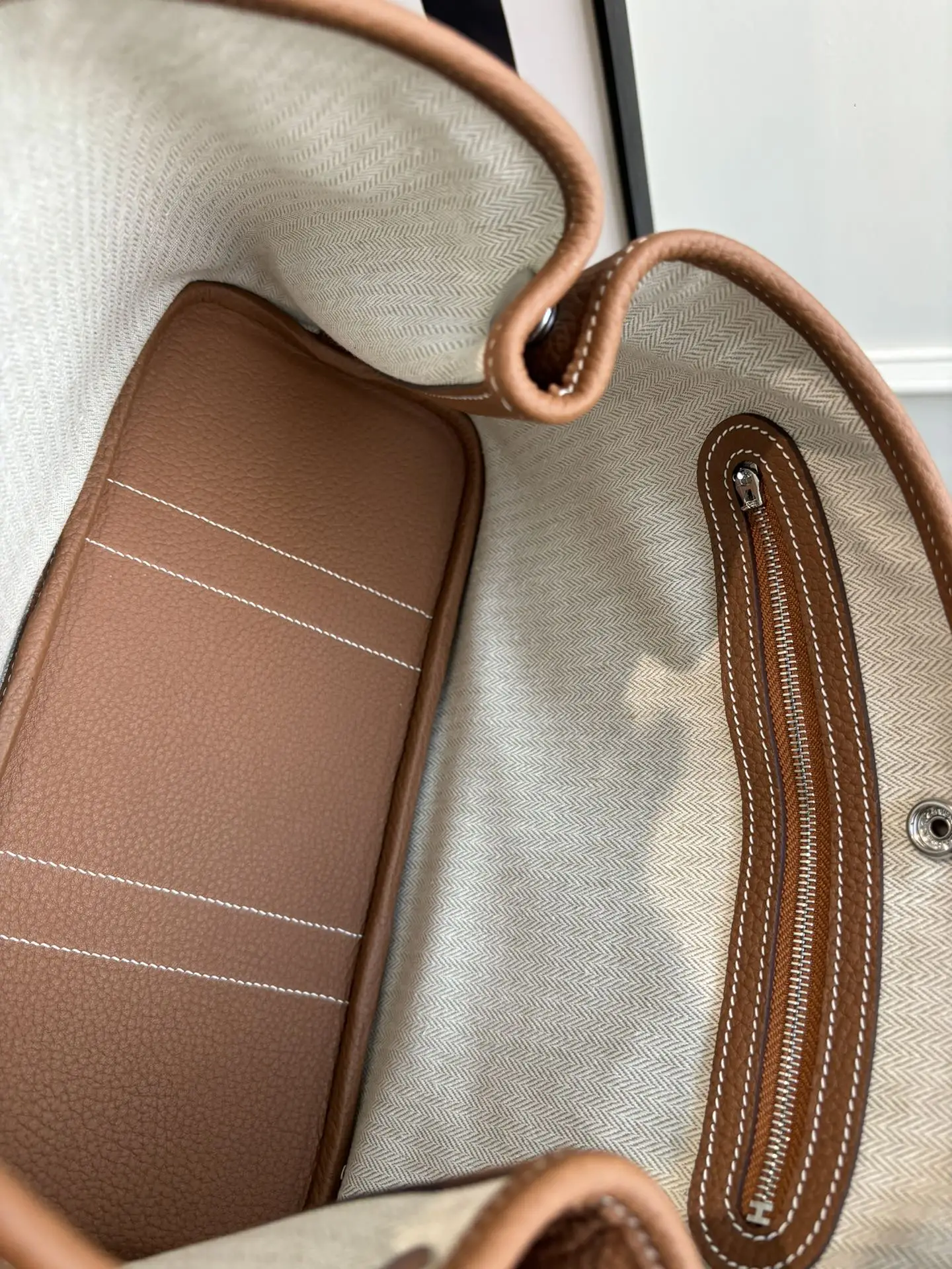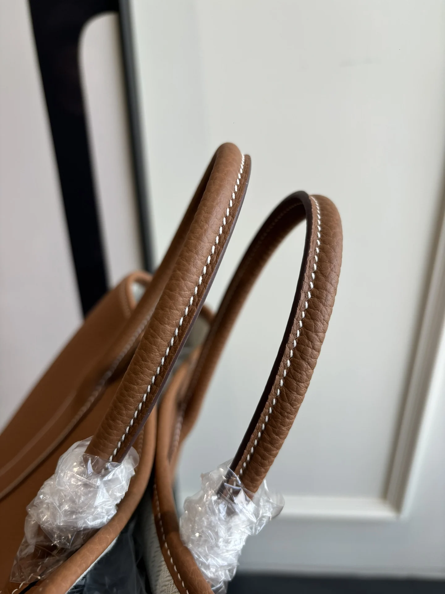 Garden Party bag, Notogo leather, lightweight design suitable for commuting or as a diaper bag, combining aesthetics and practicality. Semi-handmade with waxed thread. Color: Gold Brown. Sizes: 23cm - 30cm (two sizes).
